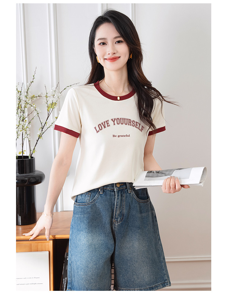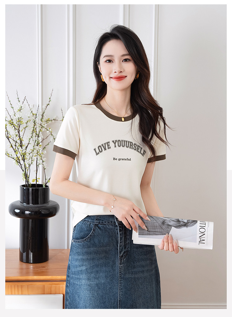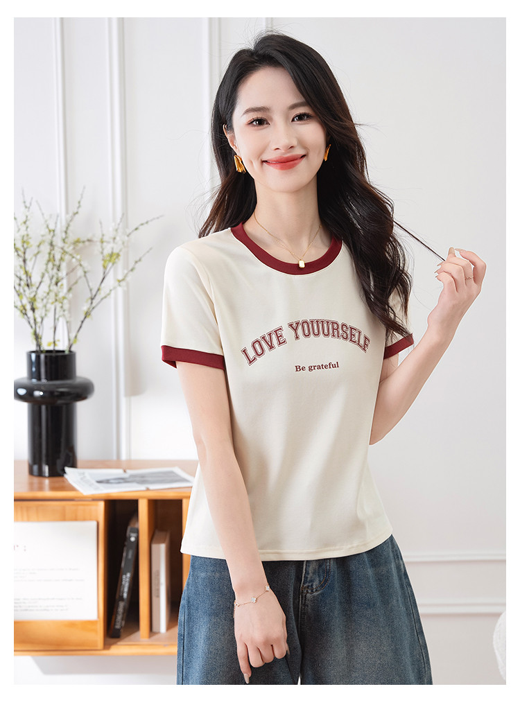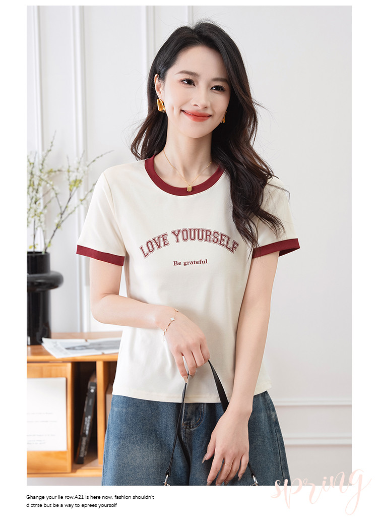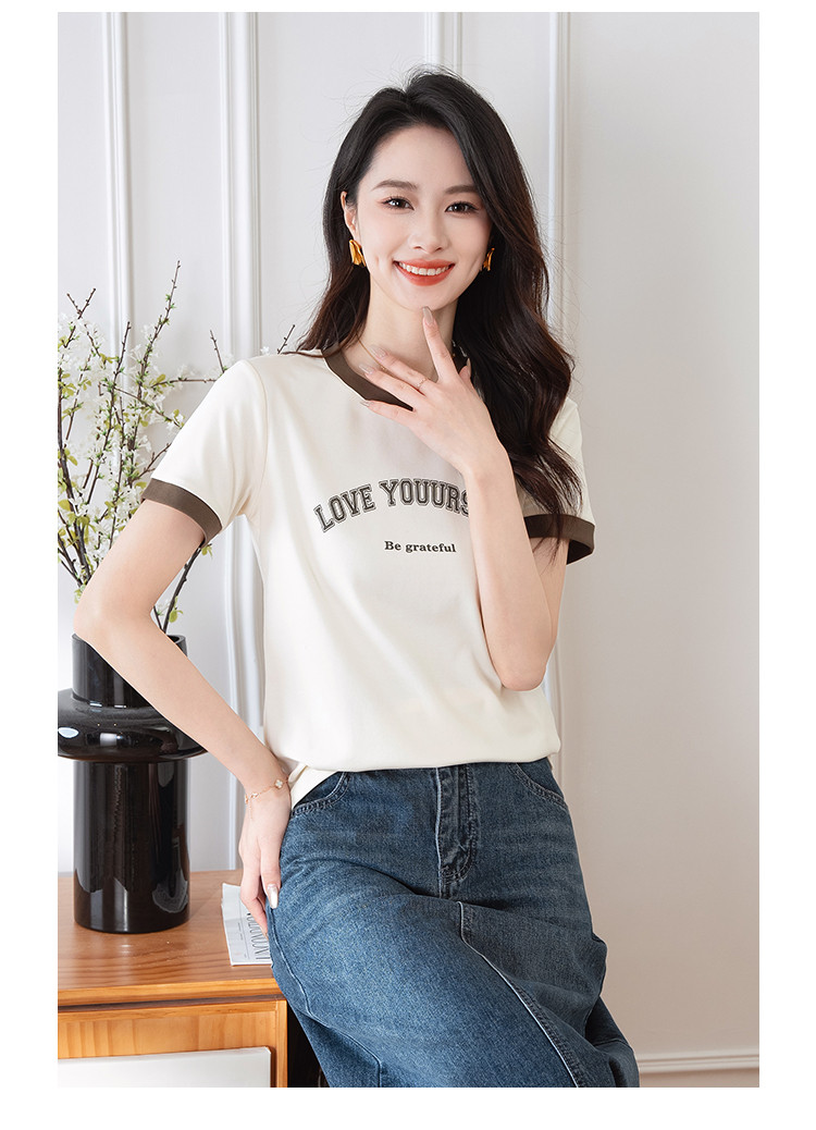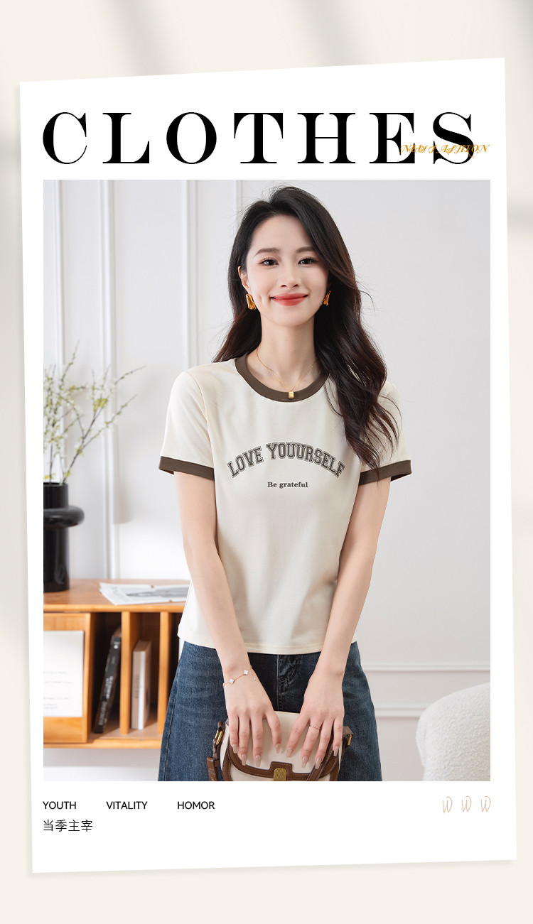 商品名称:【显瘦修身】夏季圆领短袖T恤女印花时尚百搭减龄休闲舒适上衣女 784001