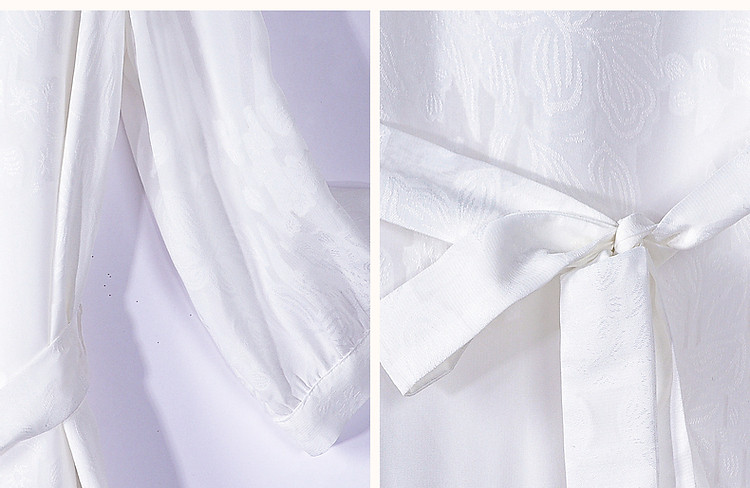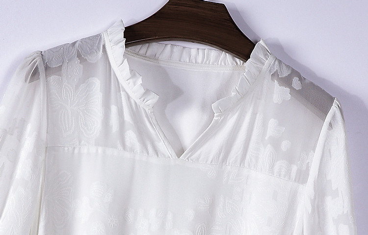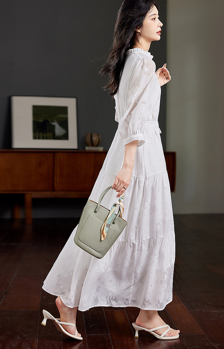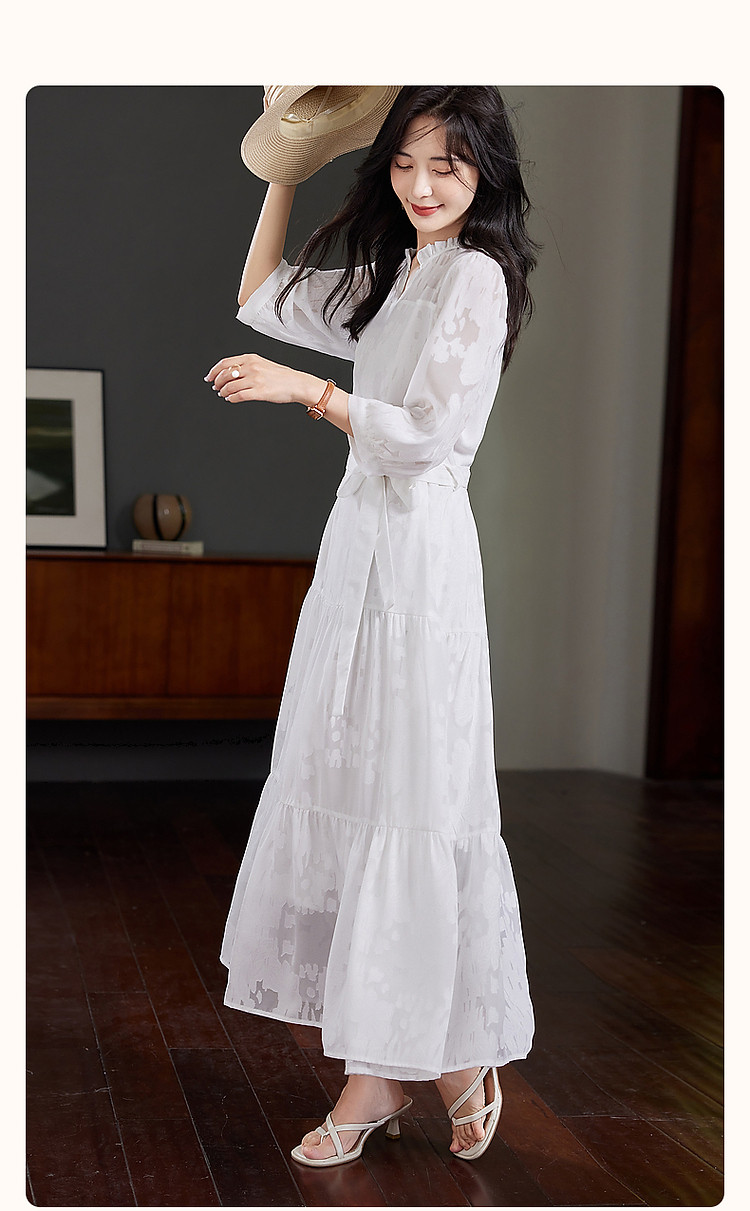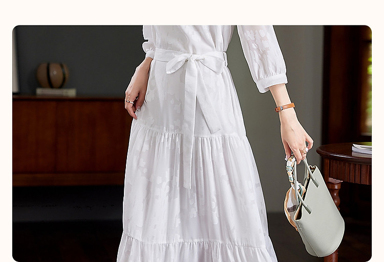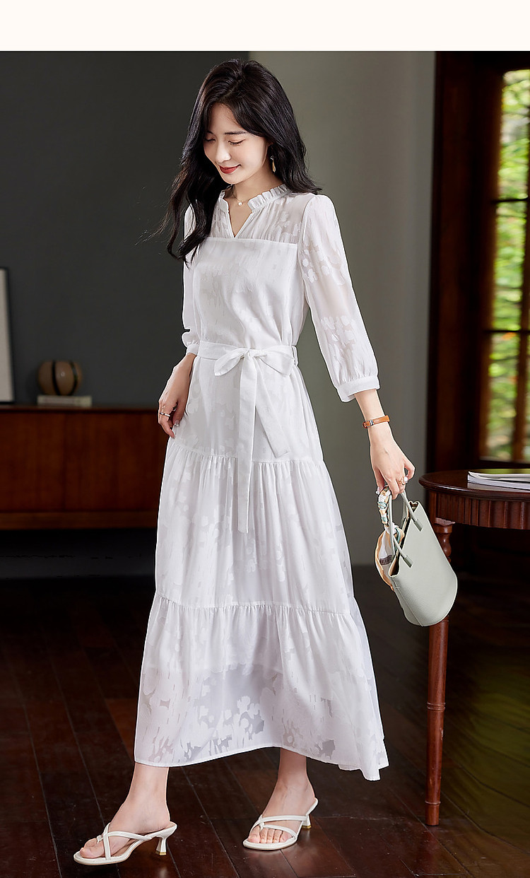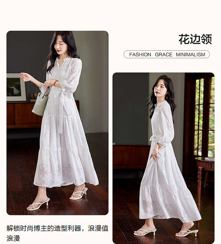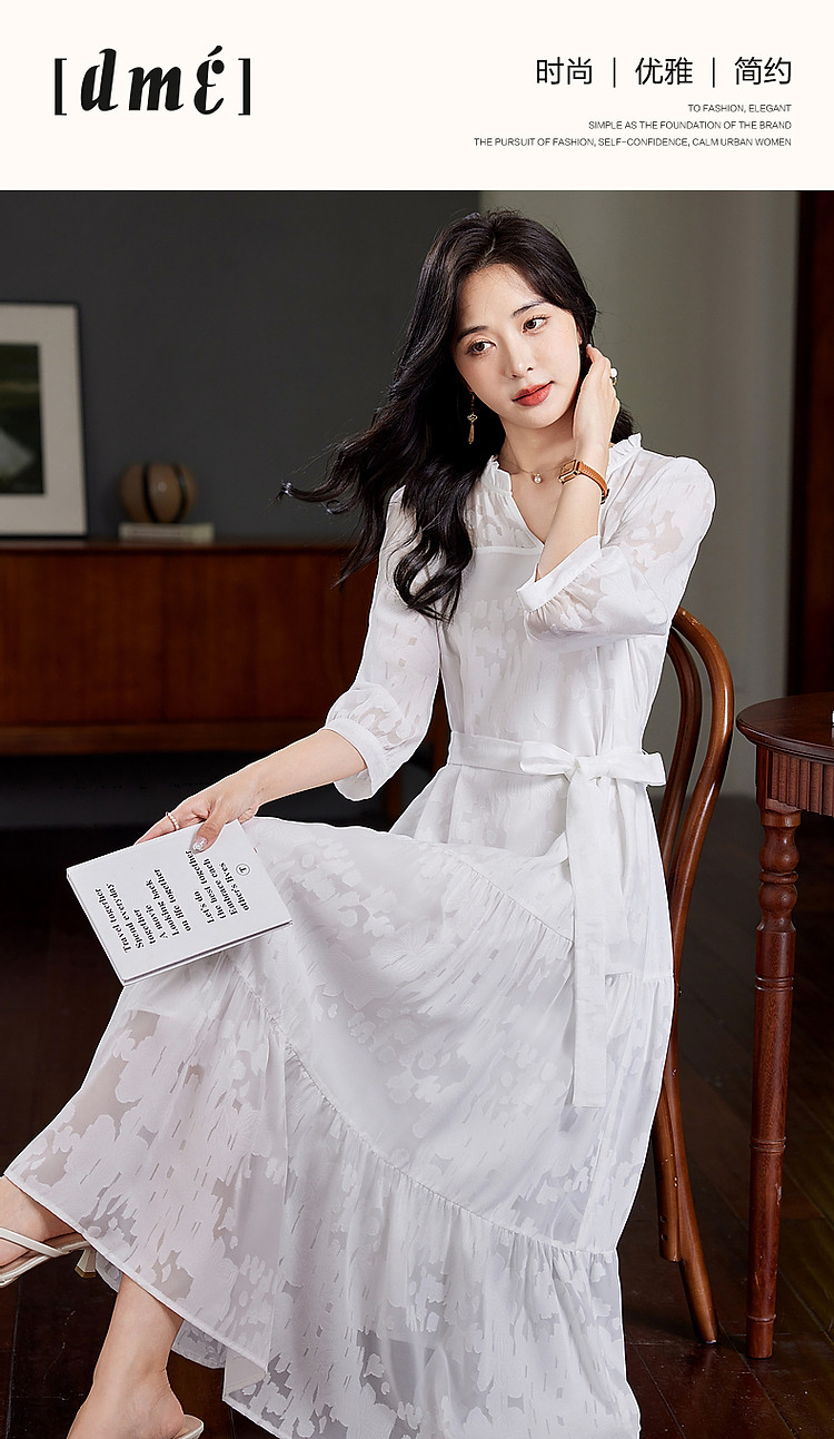 商品名称:【白茶清欢】夏唯美淑女花边领雪纺提花七分袖舒适藏肉连衣裙女 596225