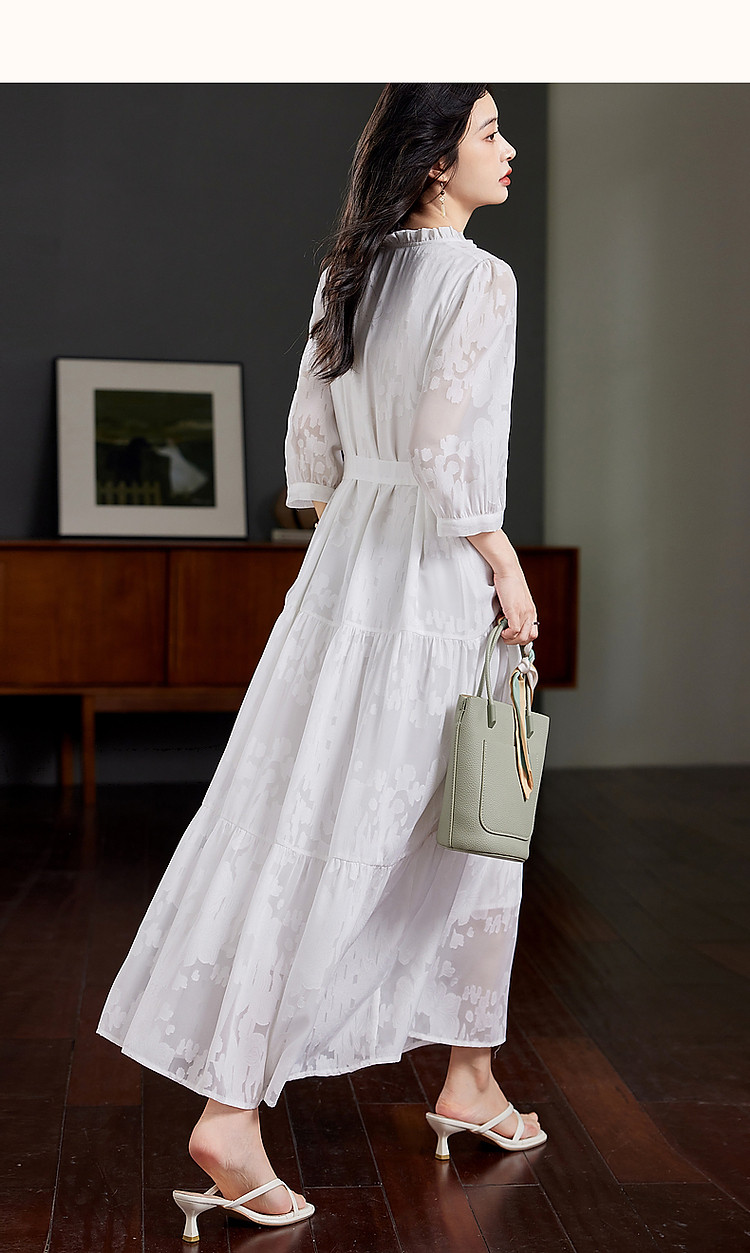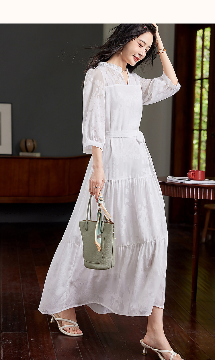 【白茶清欢】夏唯美淑女花边领雪纺提花七分袖舒适藏肉连衣裙女 596225