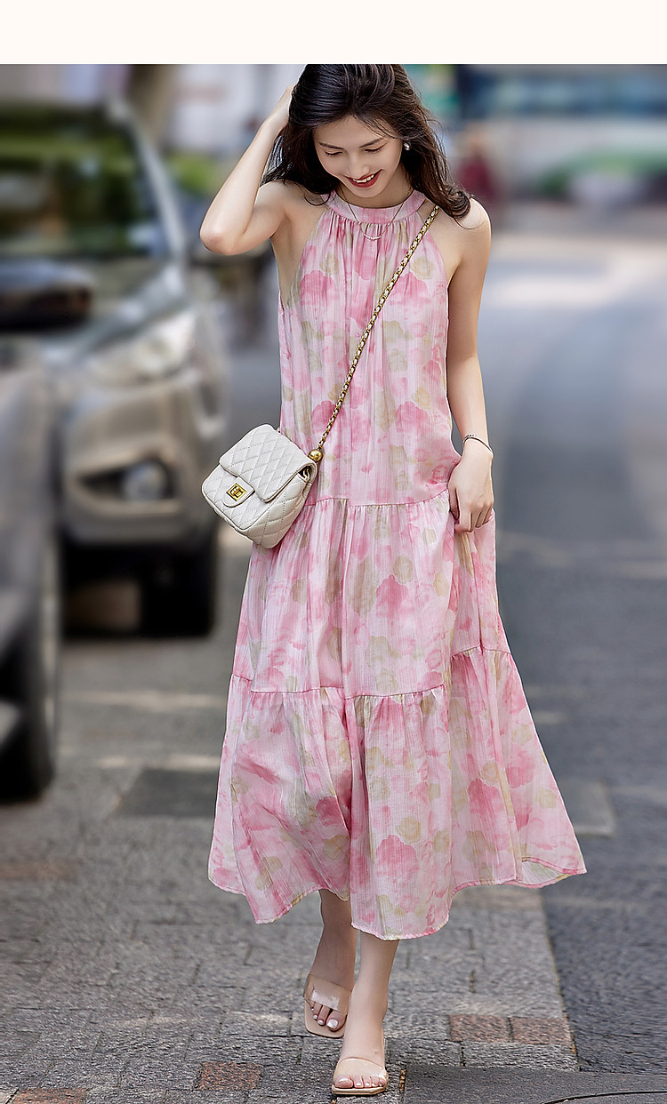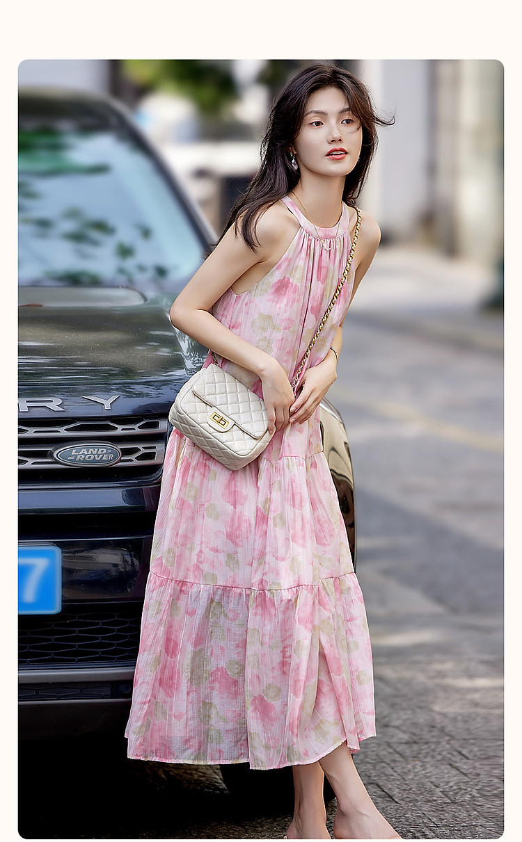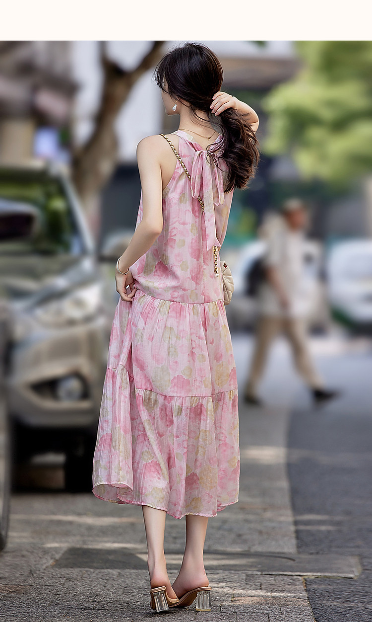 【后背绑带蝴蝶结设计】夏淑女微皱肌理感印花无袖绑带a字连衣裙 149185