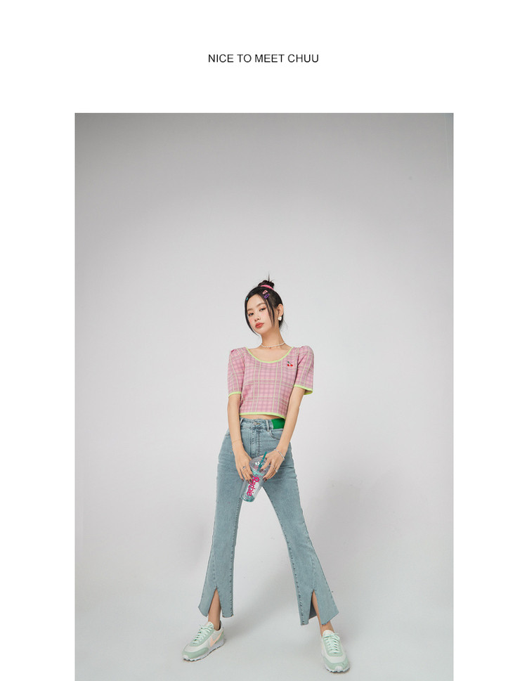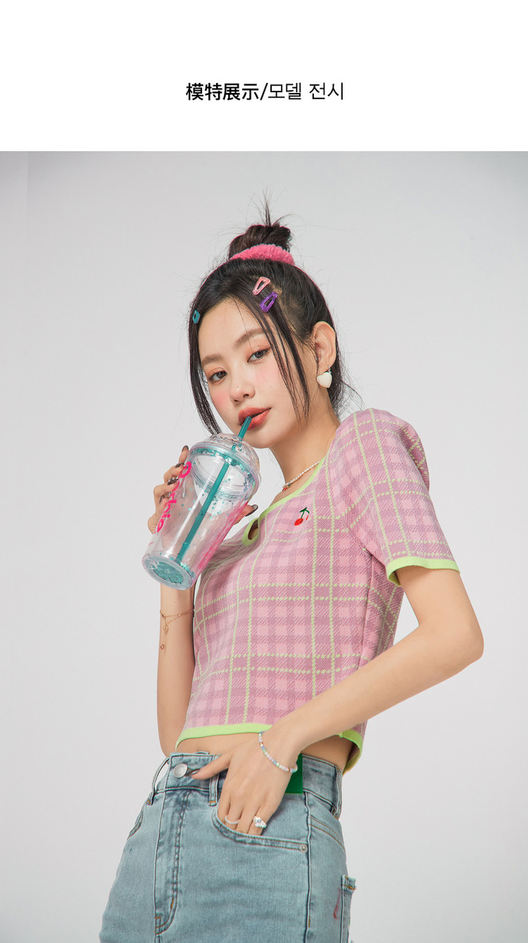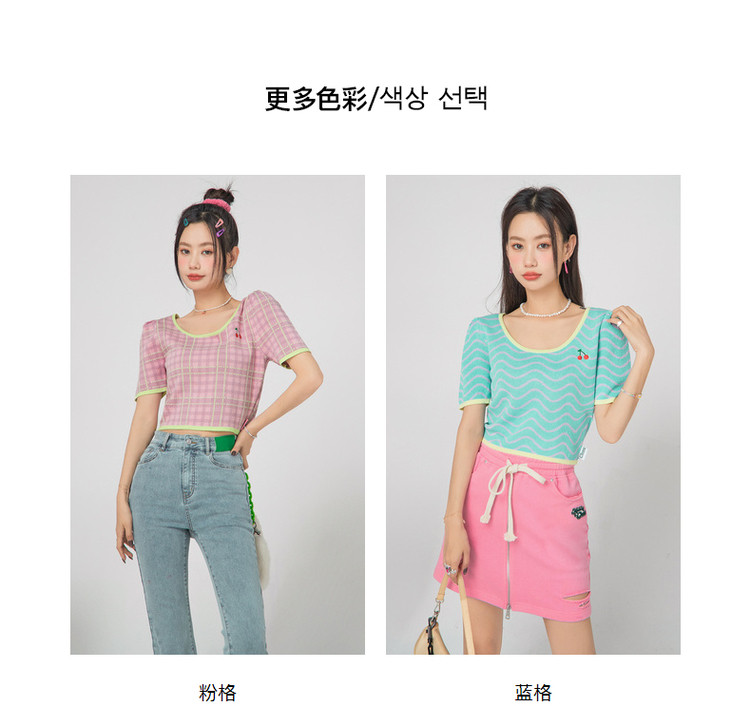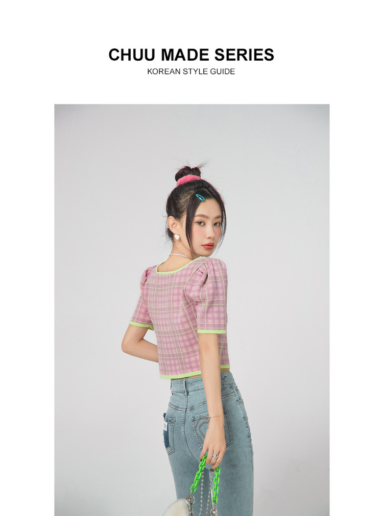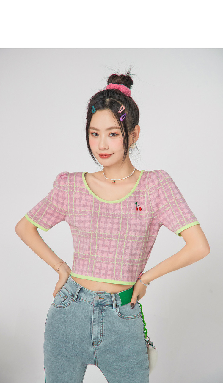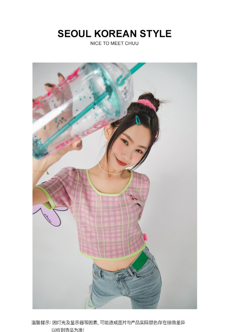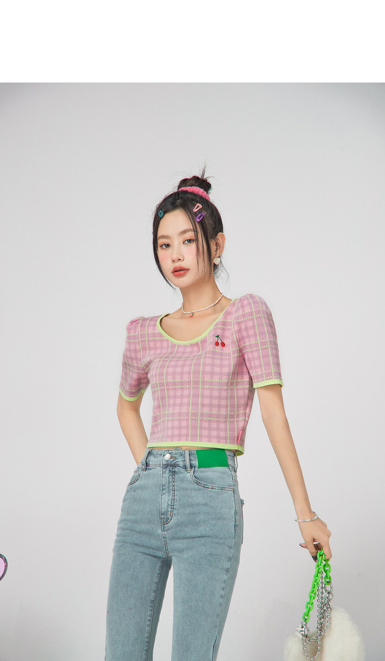 商品名称:CHUU小格子短袖针织衫女式夏季撞色短款上衣 420691