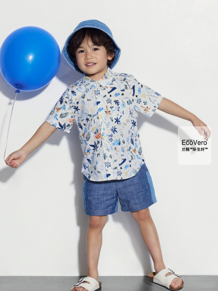 Gap男幼童2024夏季兰精天丝满印花衬衫儿童短袖上衣465970 374746