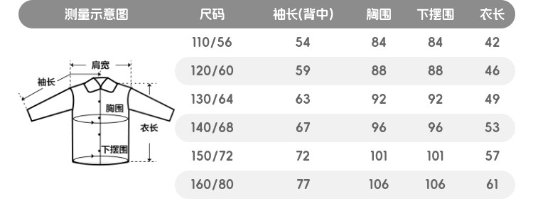 | 尺码 | 衣长(cm) | 身高(cm) | 袖长(cm) | 适合年龄 | 胸围(cm) | 号型 |