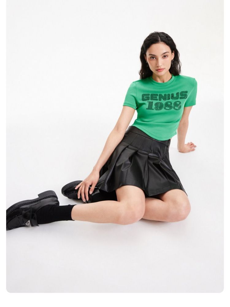 米子旗夏季女翻领印花T恤弧形下摆简约小个子短袖上衣 276506