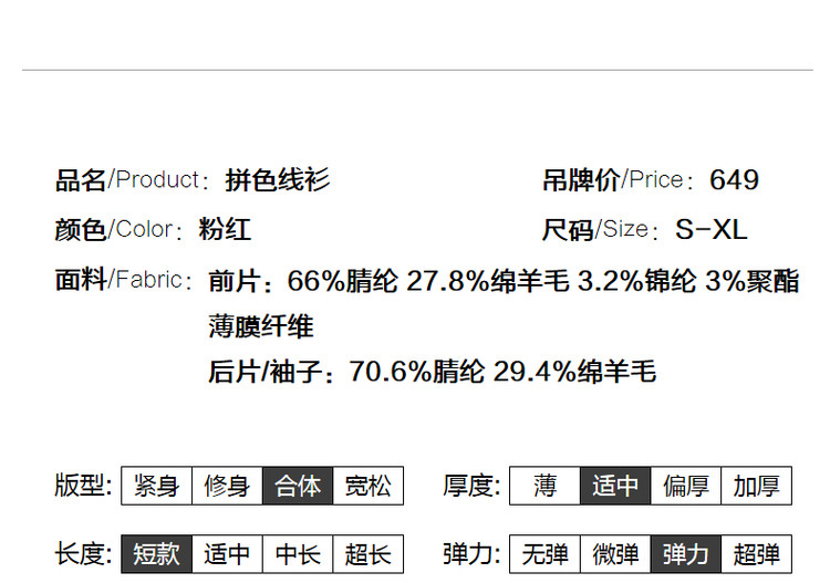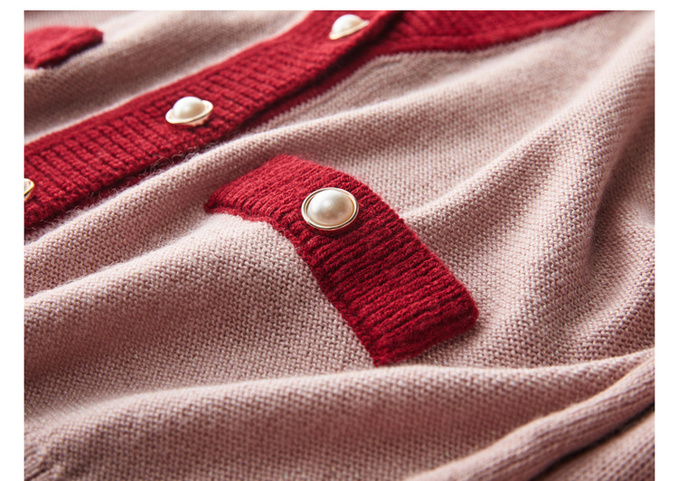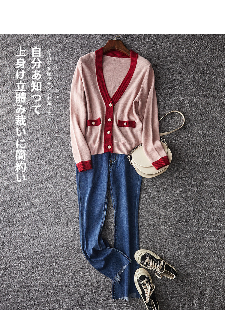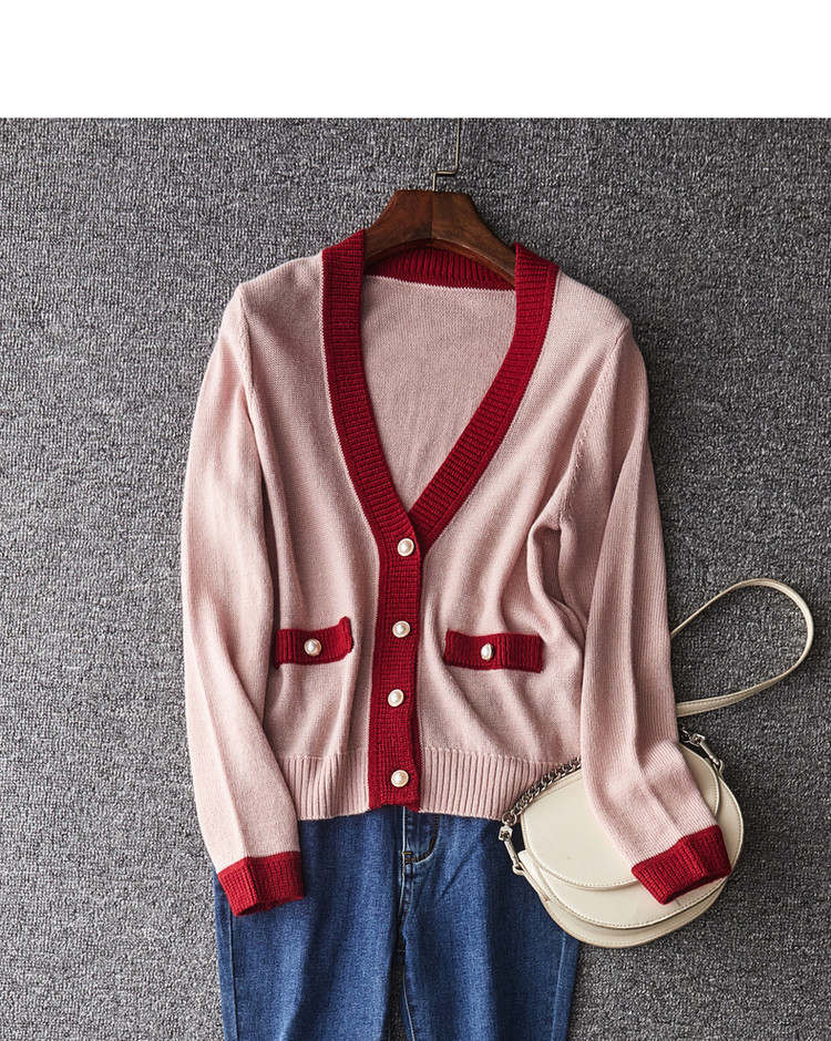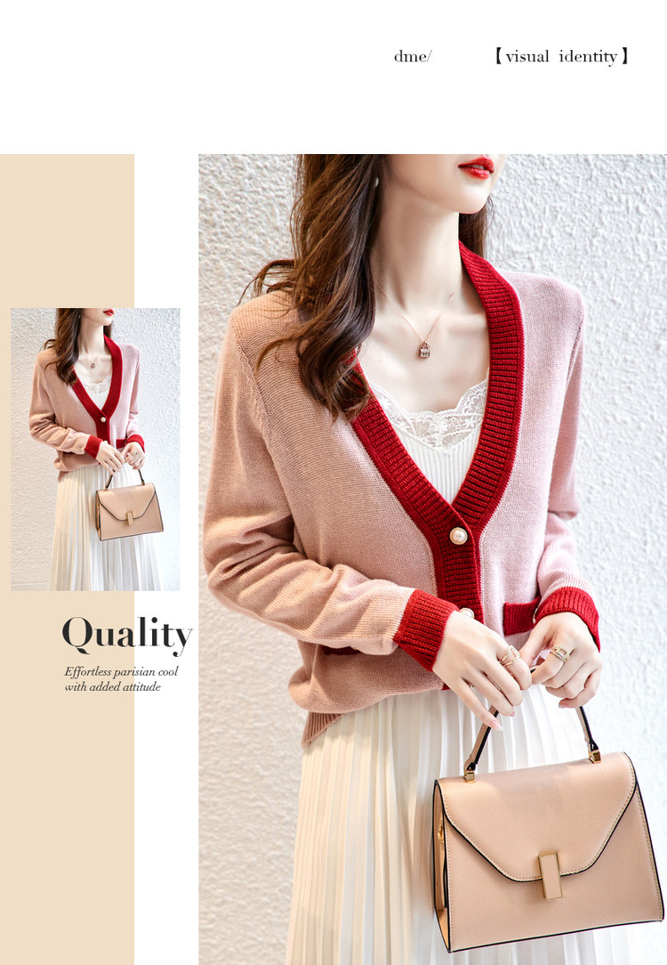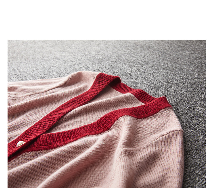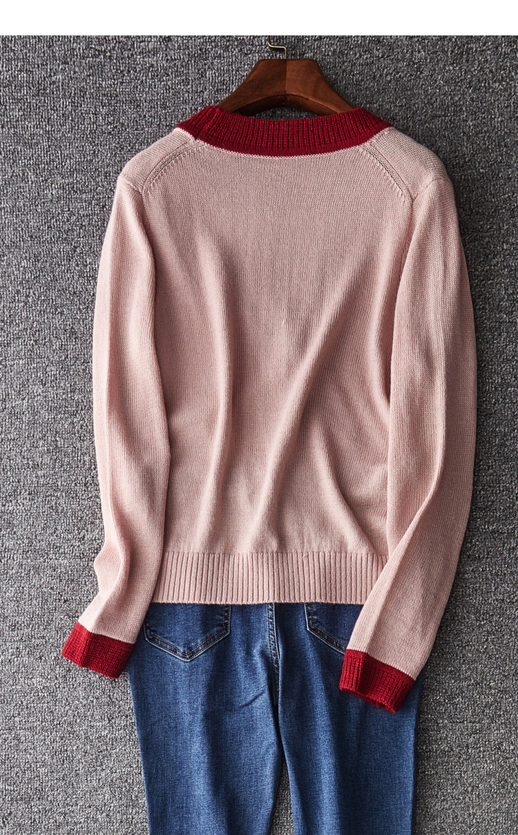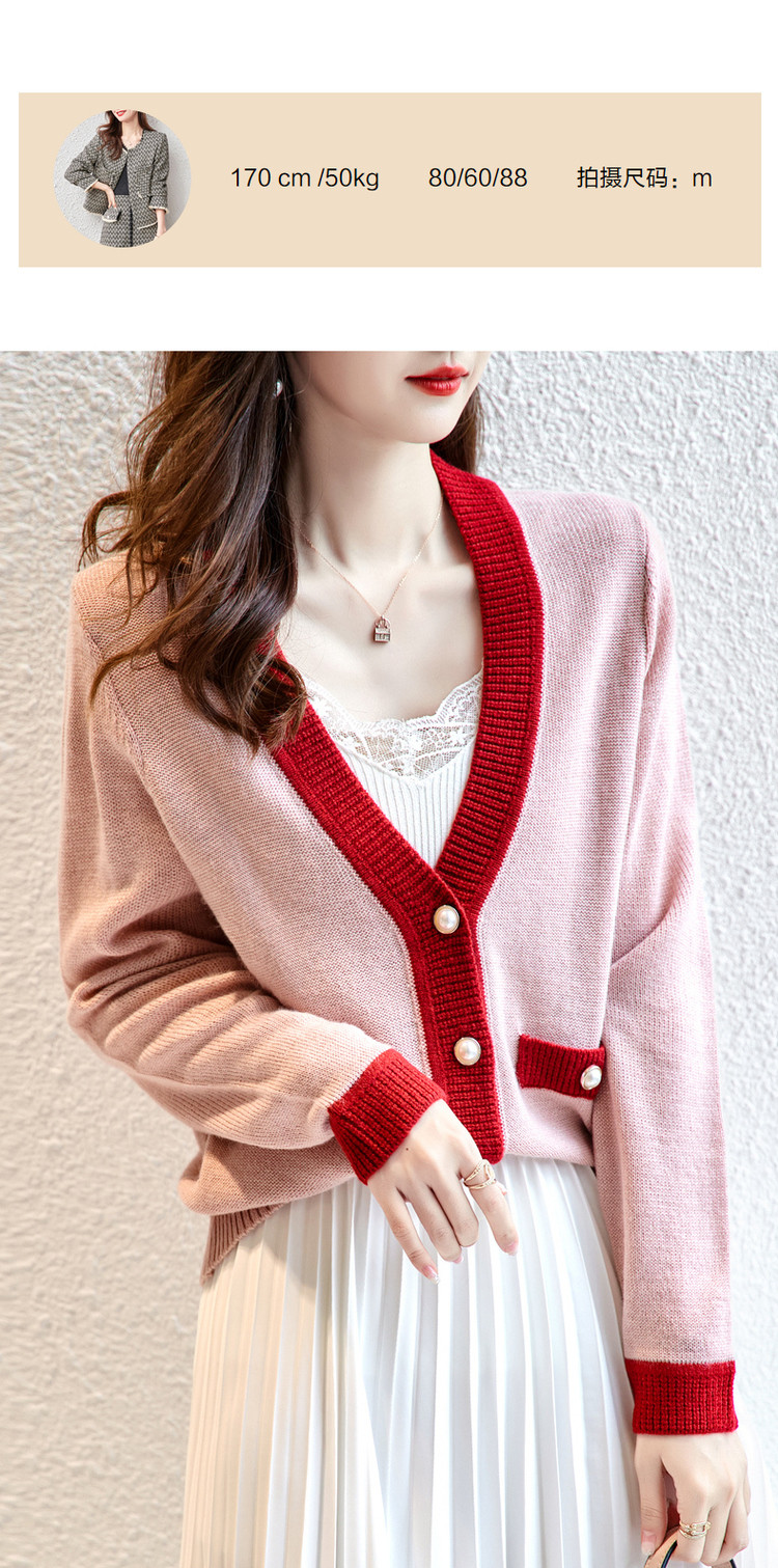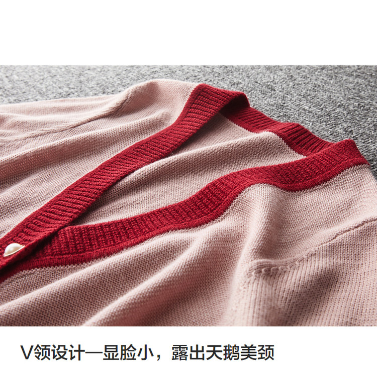商品名称:【含绵羊毛开衫】春秋V领长袖拼色针织衫女上衣短毛衣女 193153