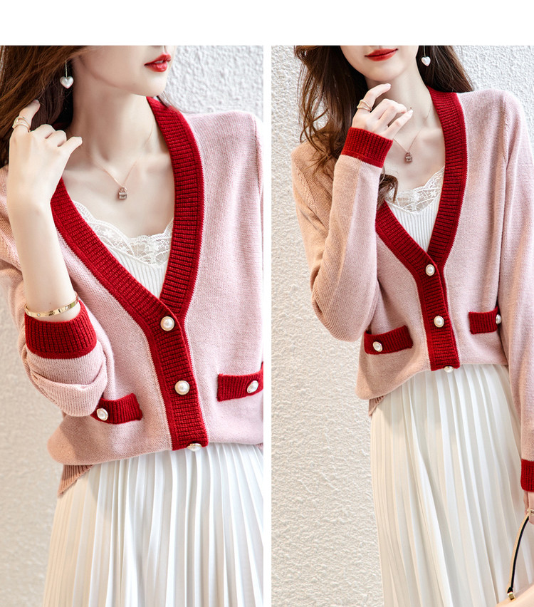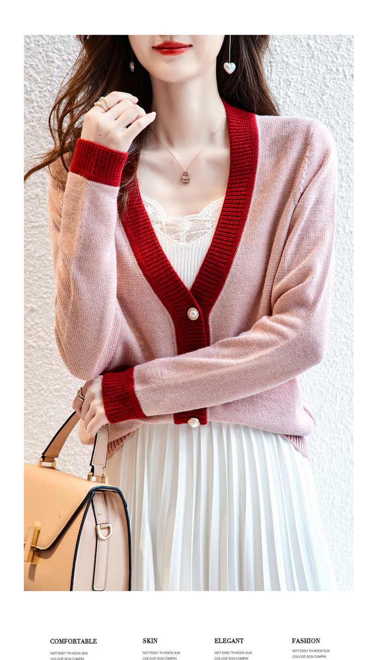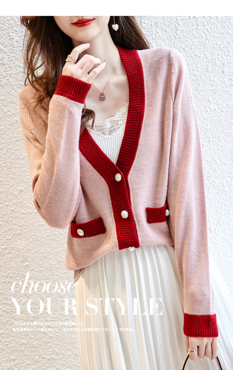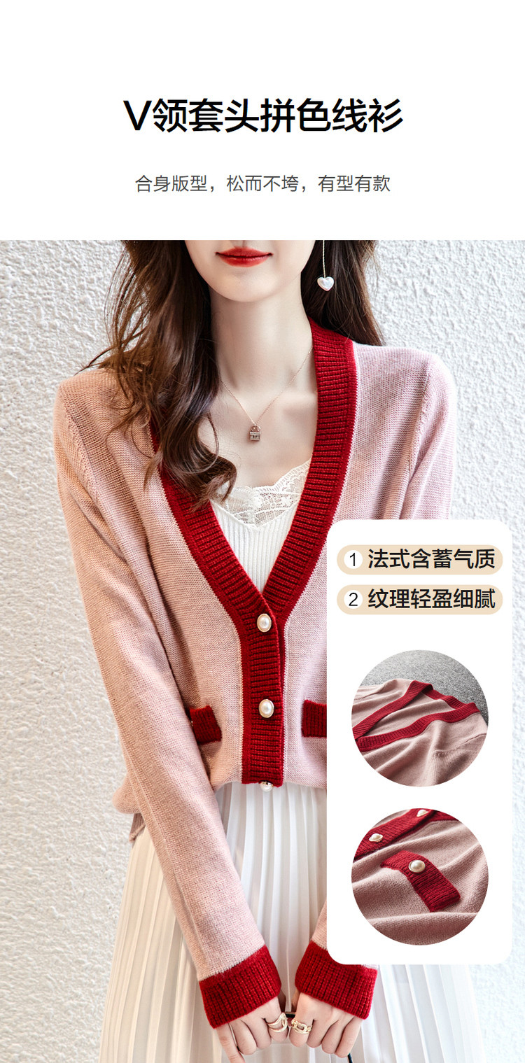 【含绵羊毛开衫】春秋V领长袖拼色针织衫女上衣短毛衣女 193153
