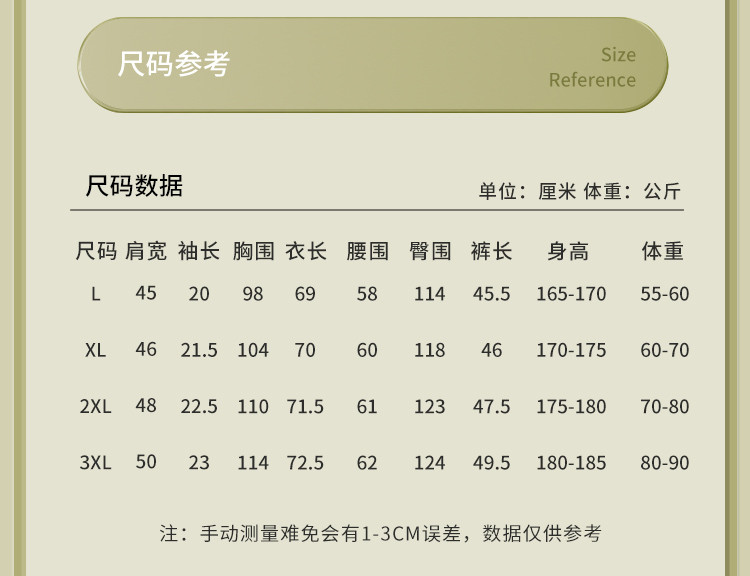 | 尺码 | 肩宽(cm) | 袖长(cm) | 衣长(cm) | 身高(cm) | 腰围(cm) | 裤长(cm) | 体重(kg) | 臀围(cm) | 胸围(cm) | 号型 |