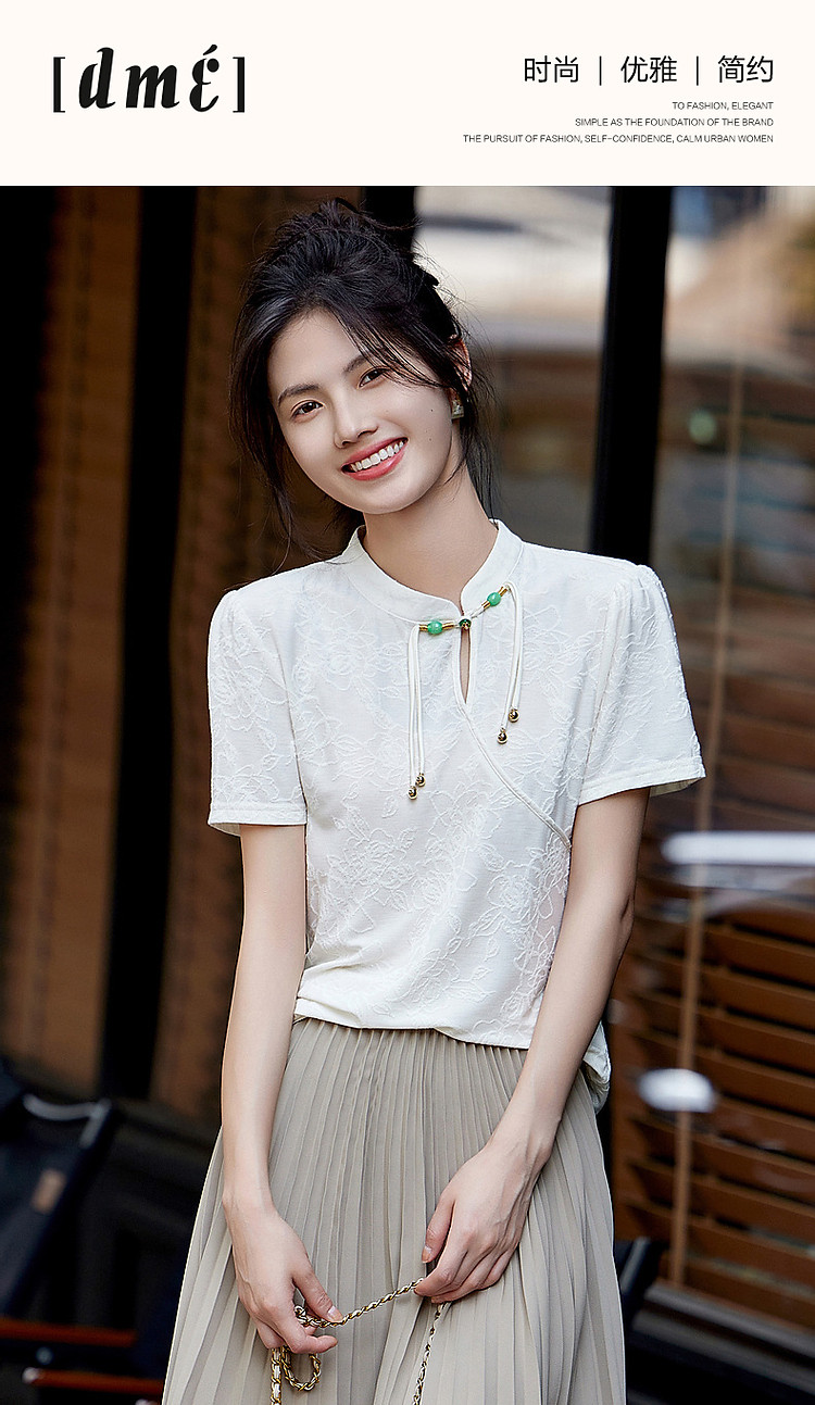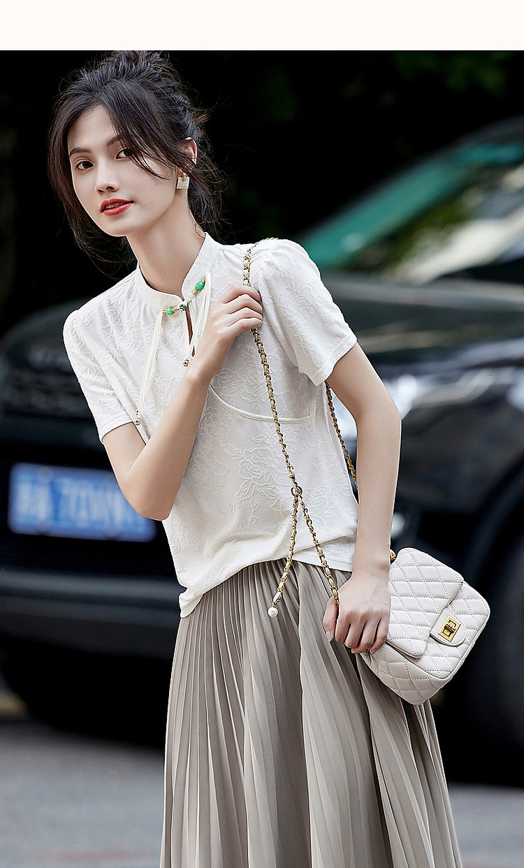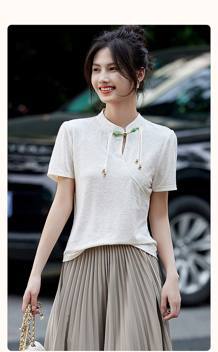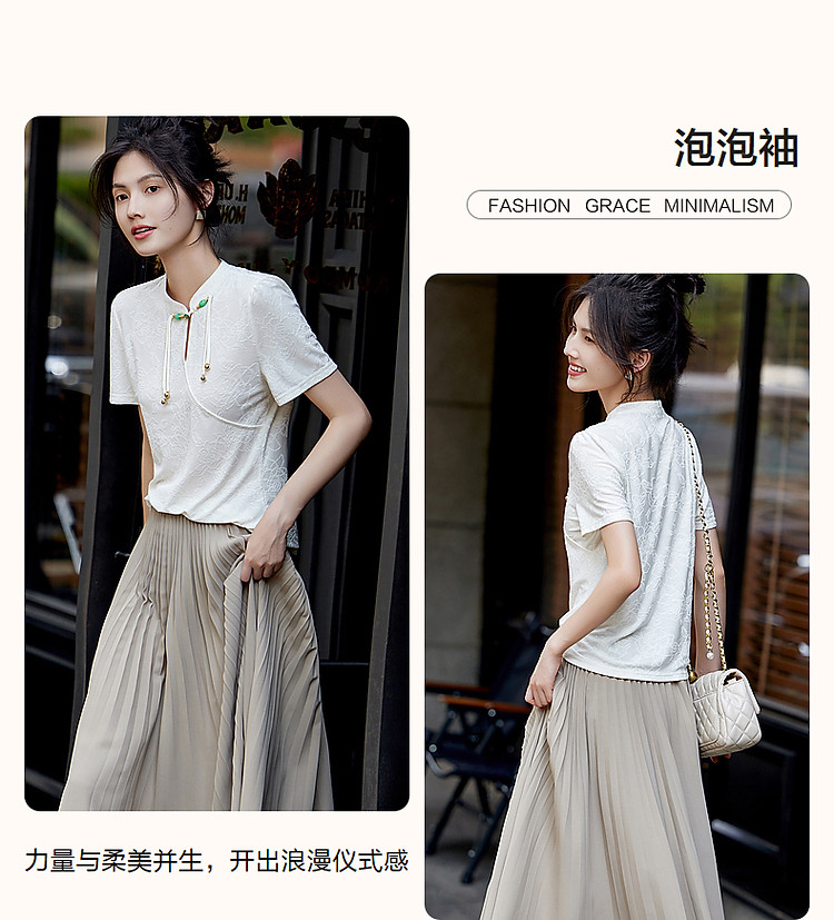 商品名称:【禅意匠心】夏国风新中式立领盘扣泡泡袖弹力舒适针织女式t恤 512897
