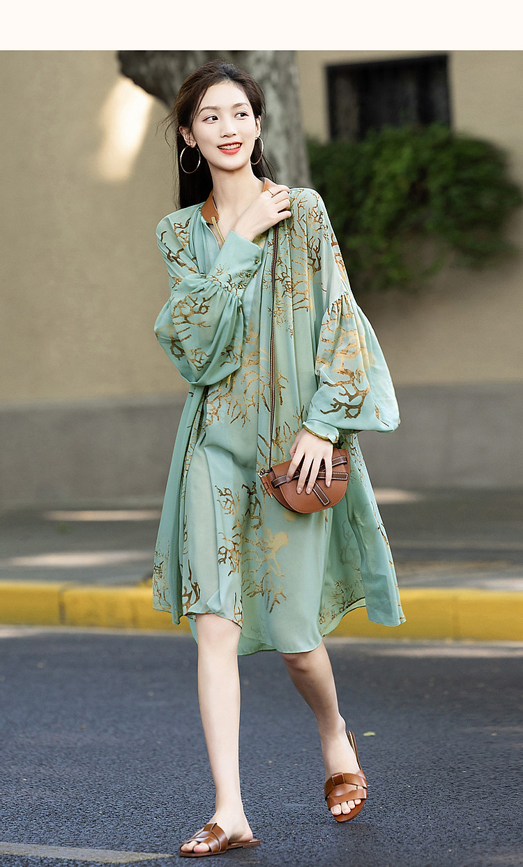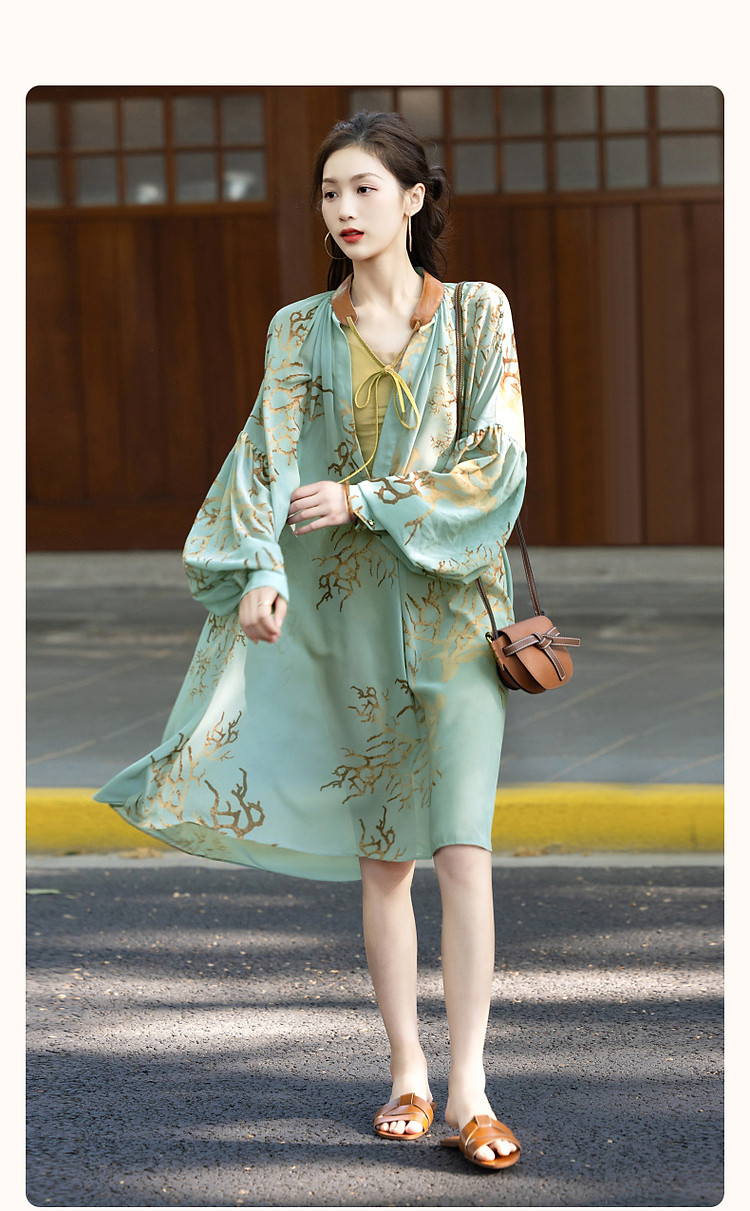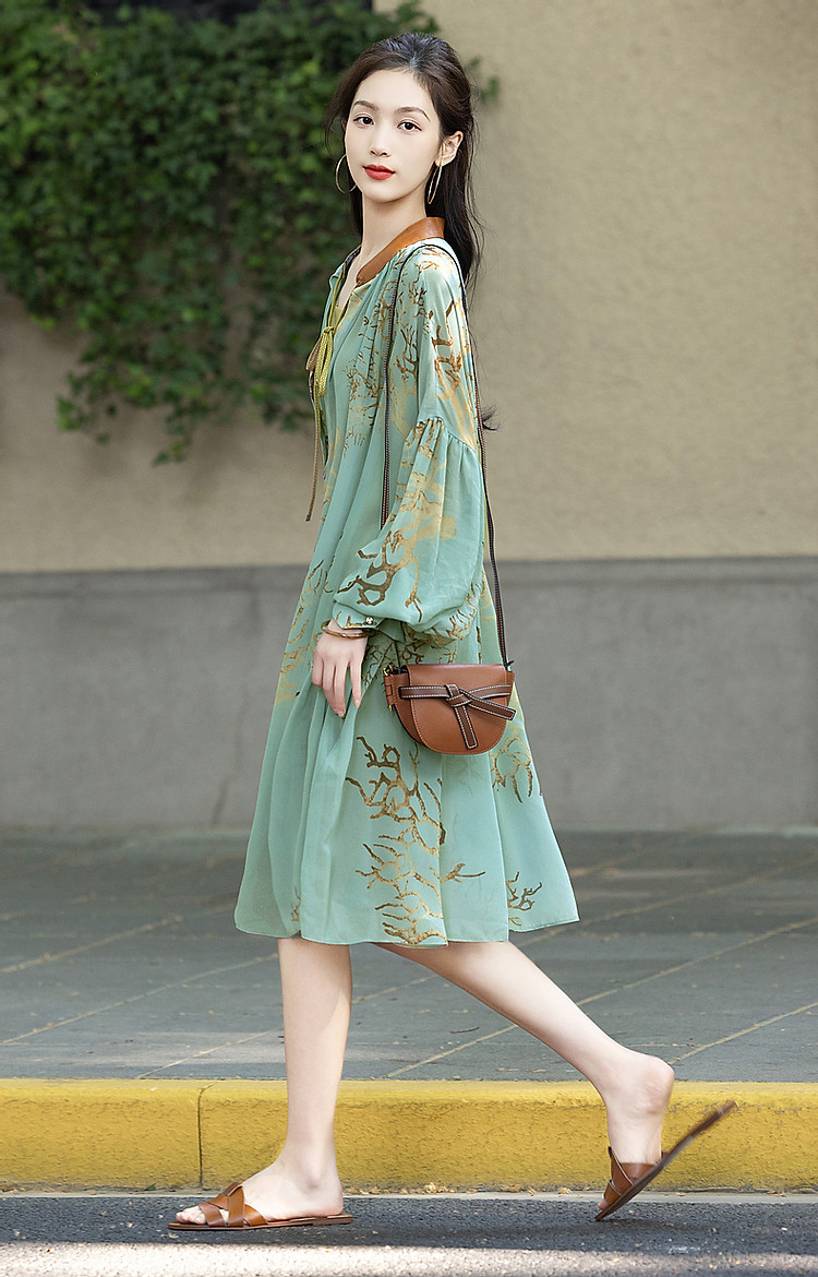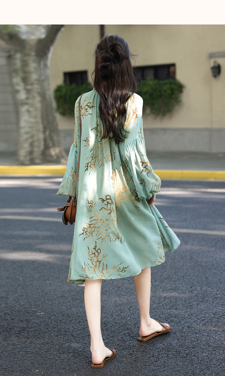 【波西米亚沙滩裙】夏比基尼外搭V领飘带雪纺大摆抽褶印花连衣裙 181185
