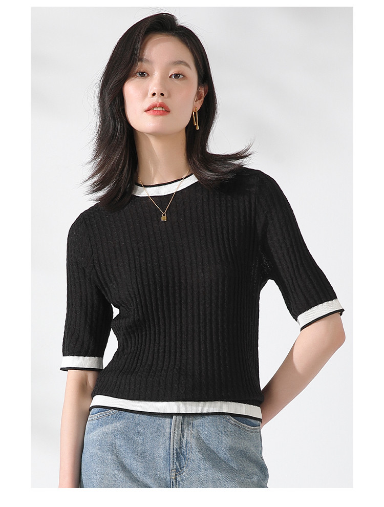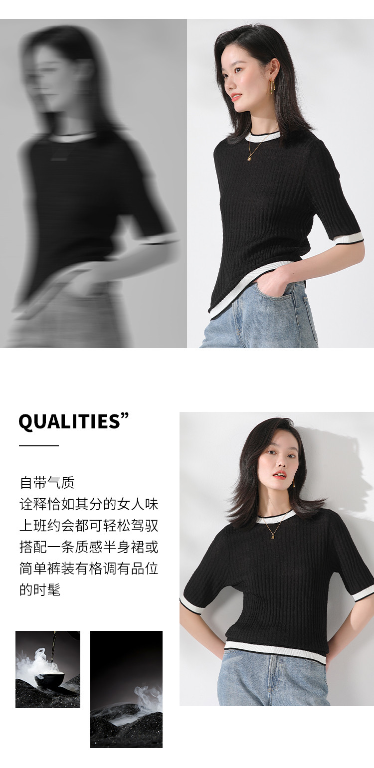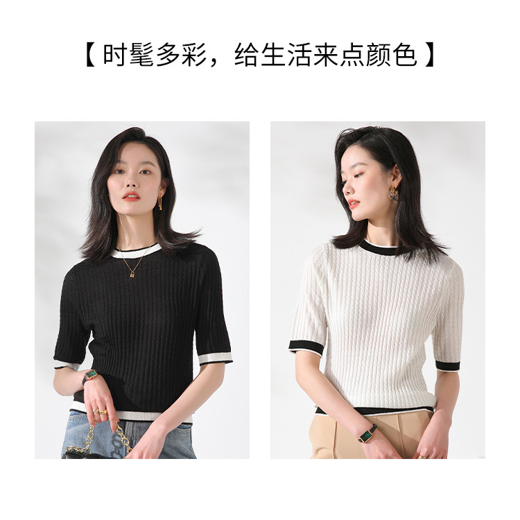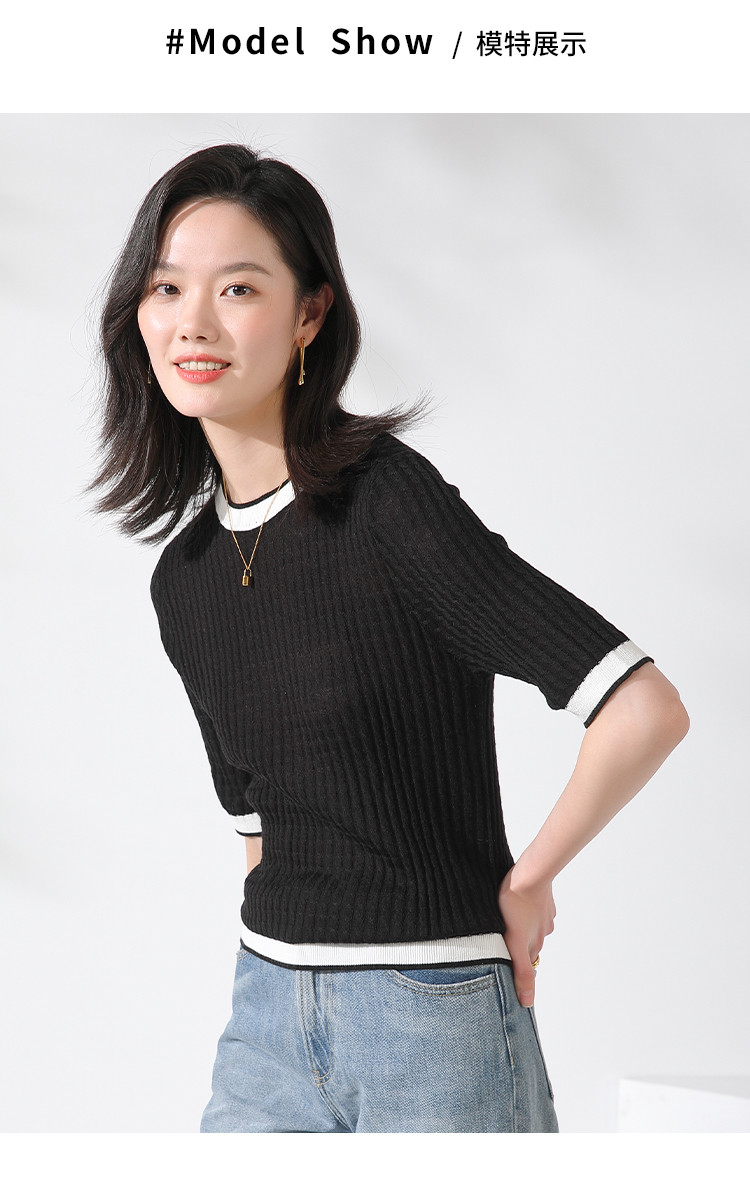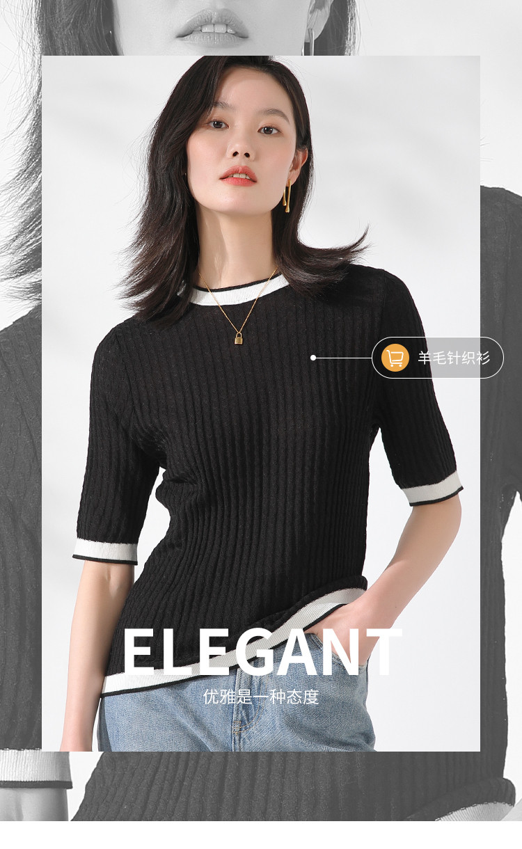商品名称:【含羊毛 时尚抽条】圆领拼色上衣内搭短袖针织杉女打底衫T恤 808211