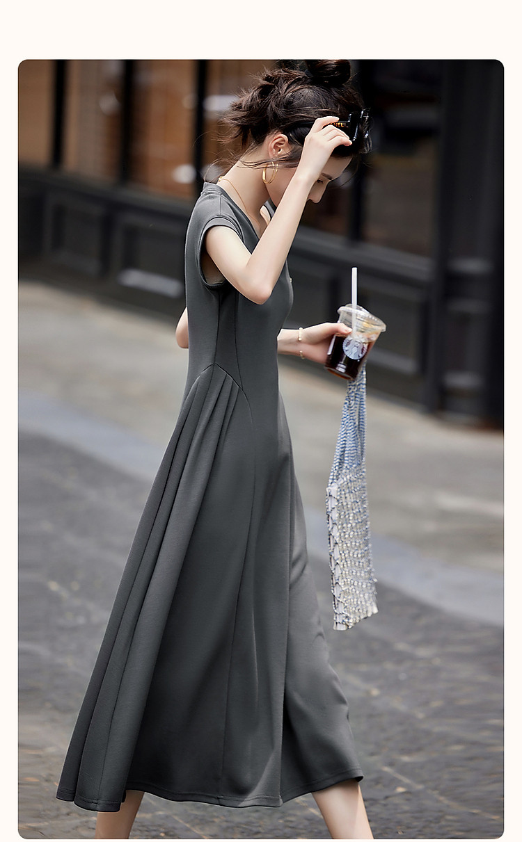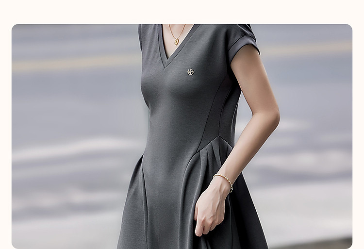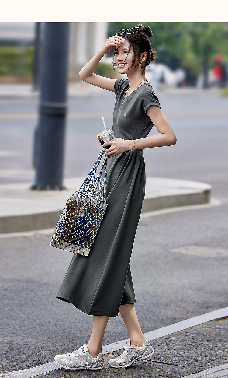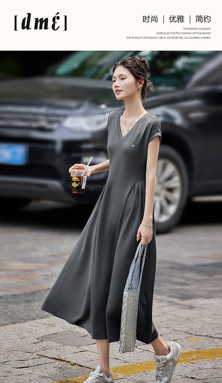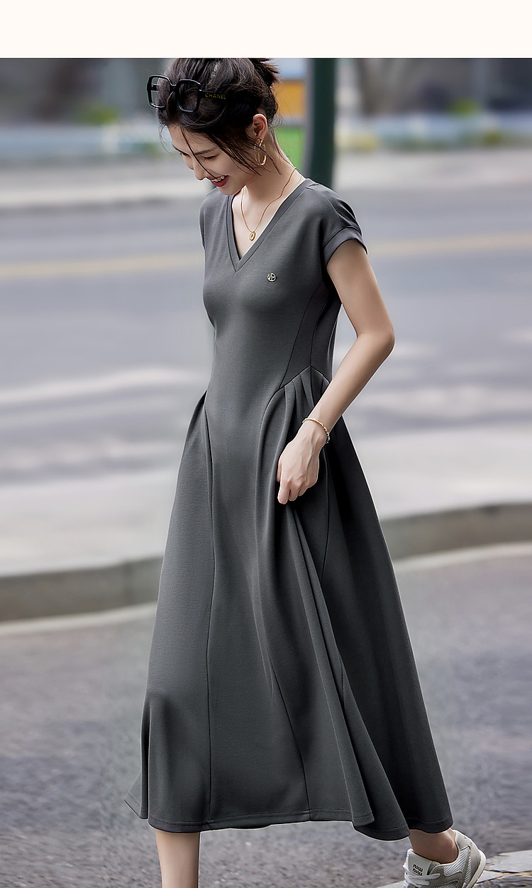商品名称:【立裁褶皱收腰】夏简约风V领短袖弹力藏肉显瘦气质针织连衣裙 100033