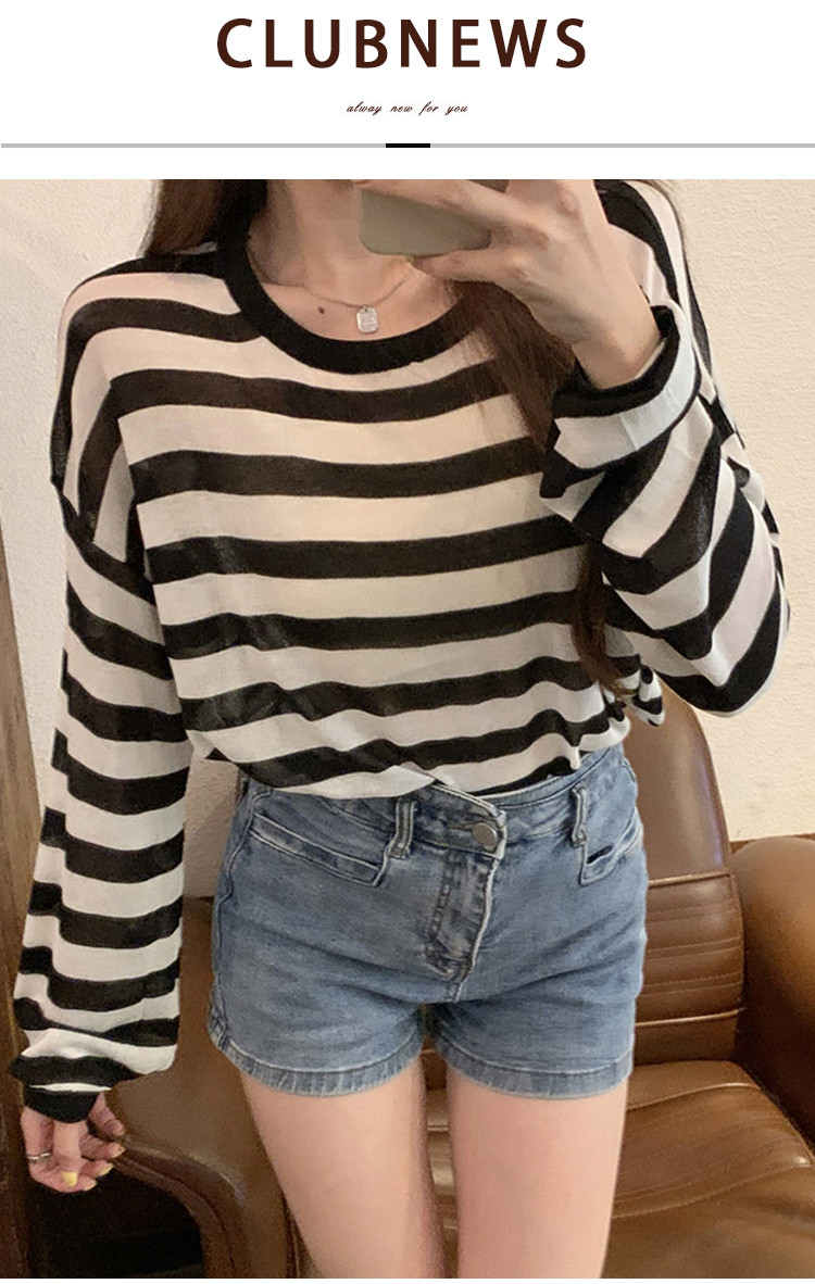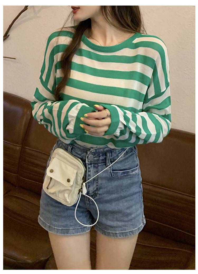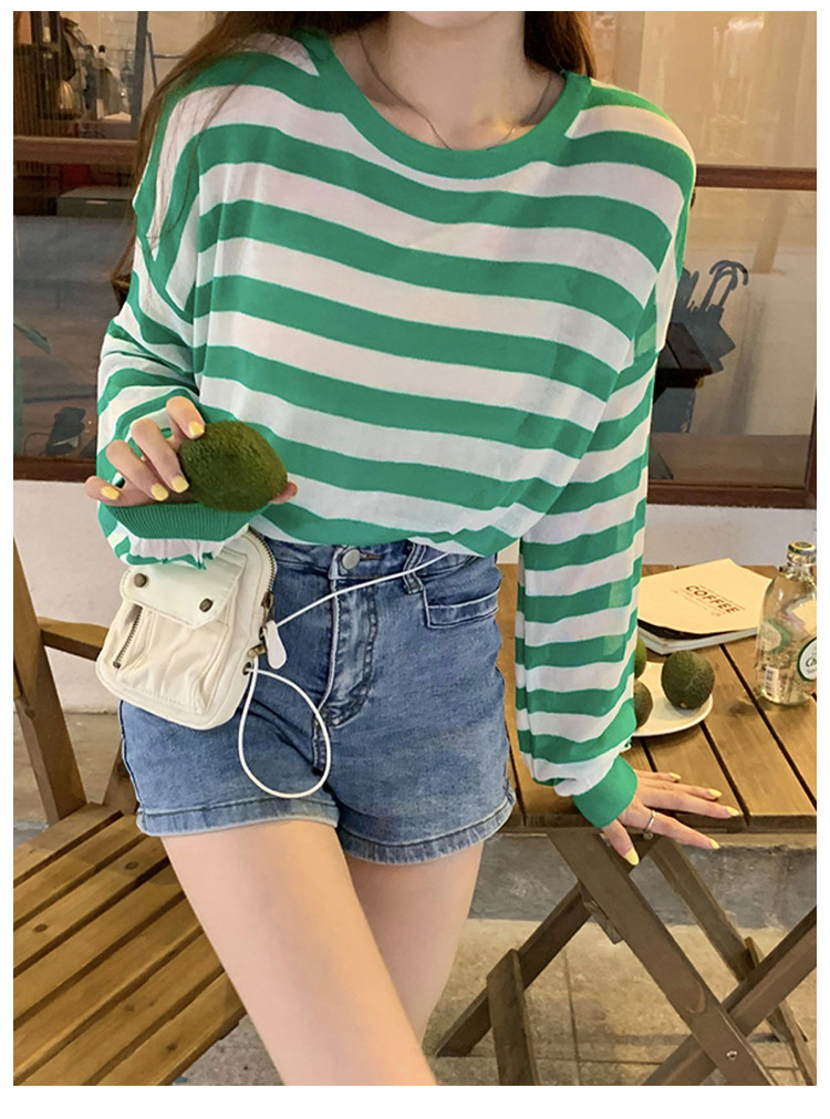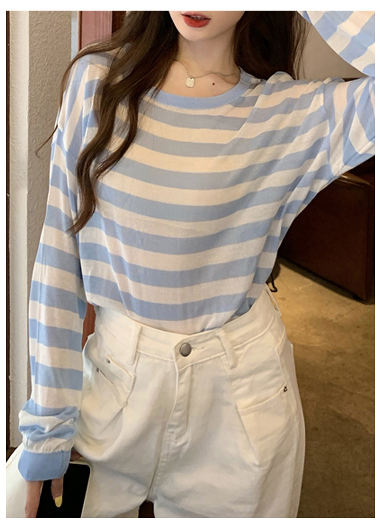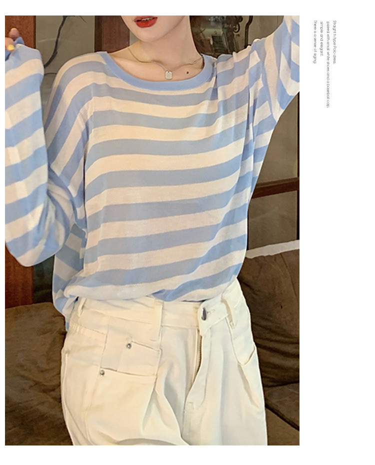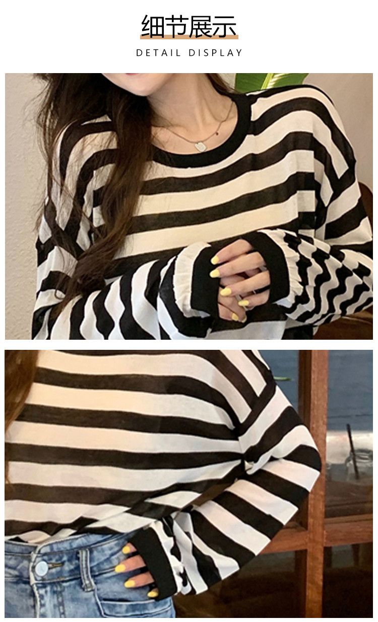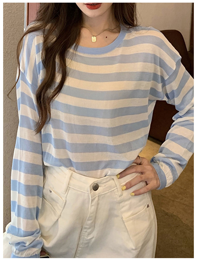 商品名称:圆领薄款条纹宽松空调服慵懒风针织上衣女外穿长袖t恤女 090371