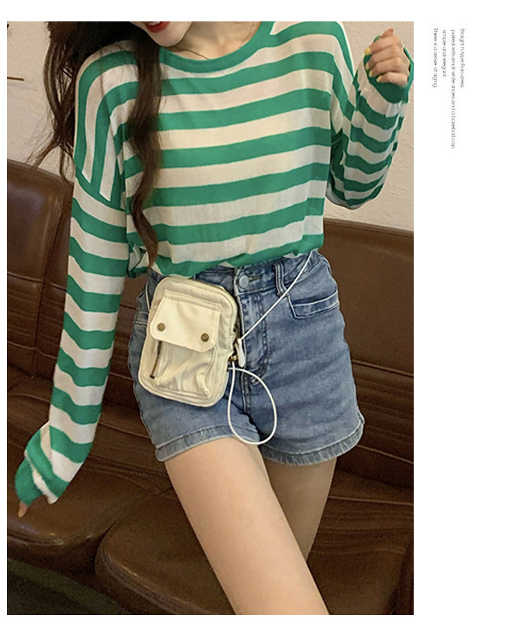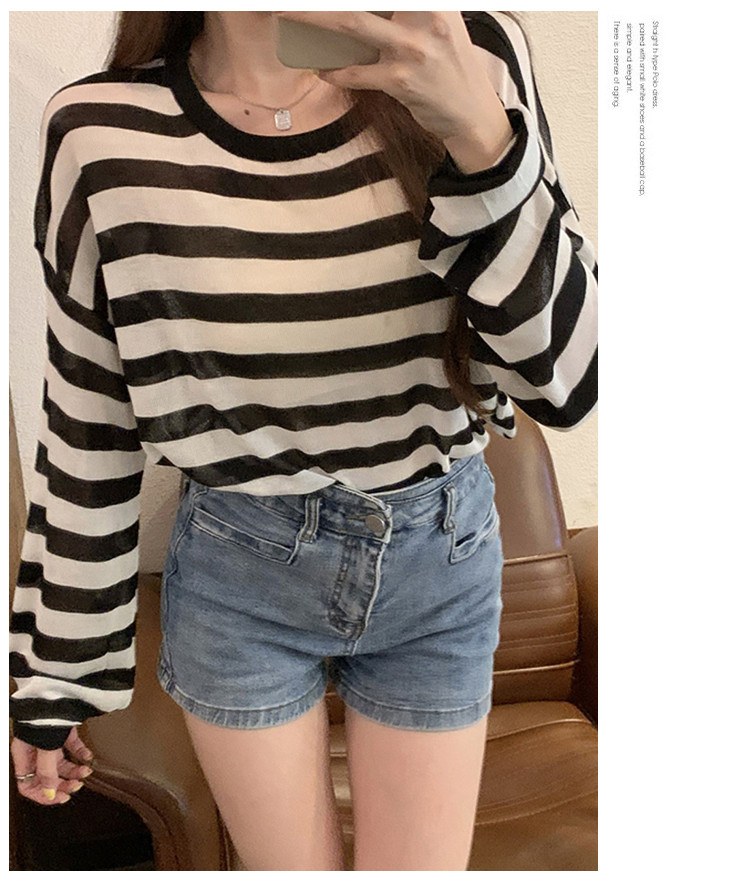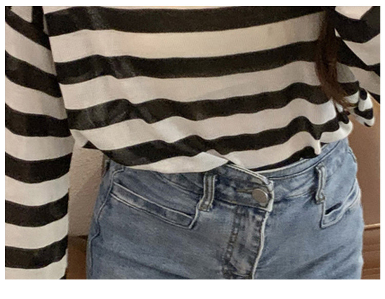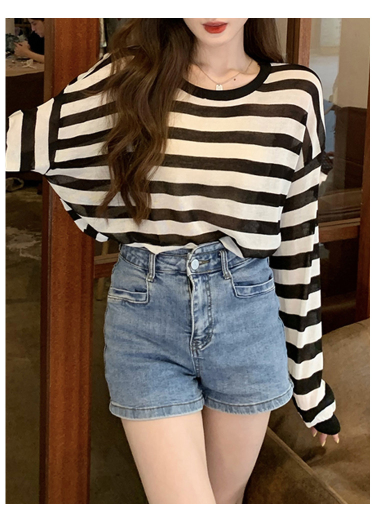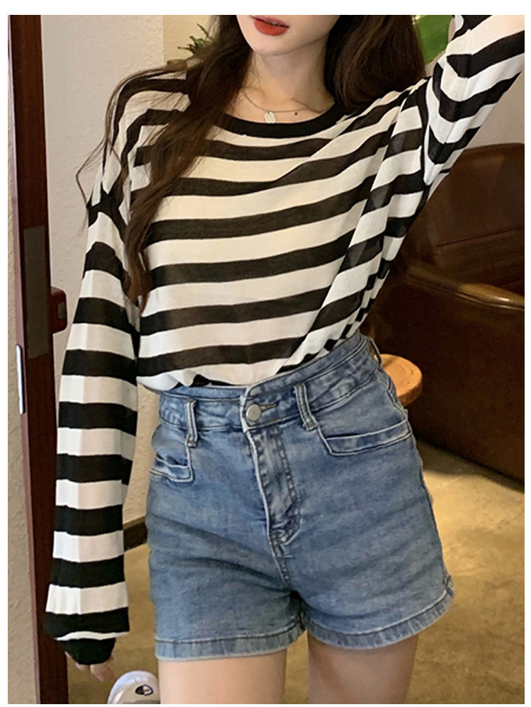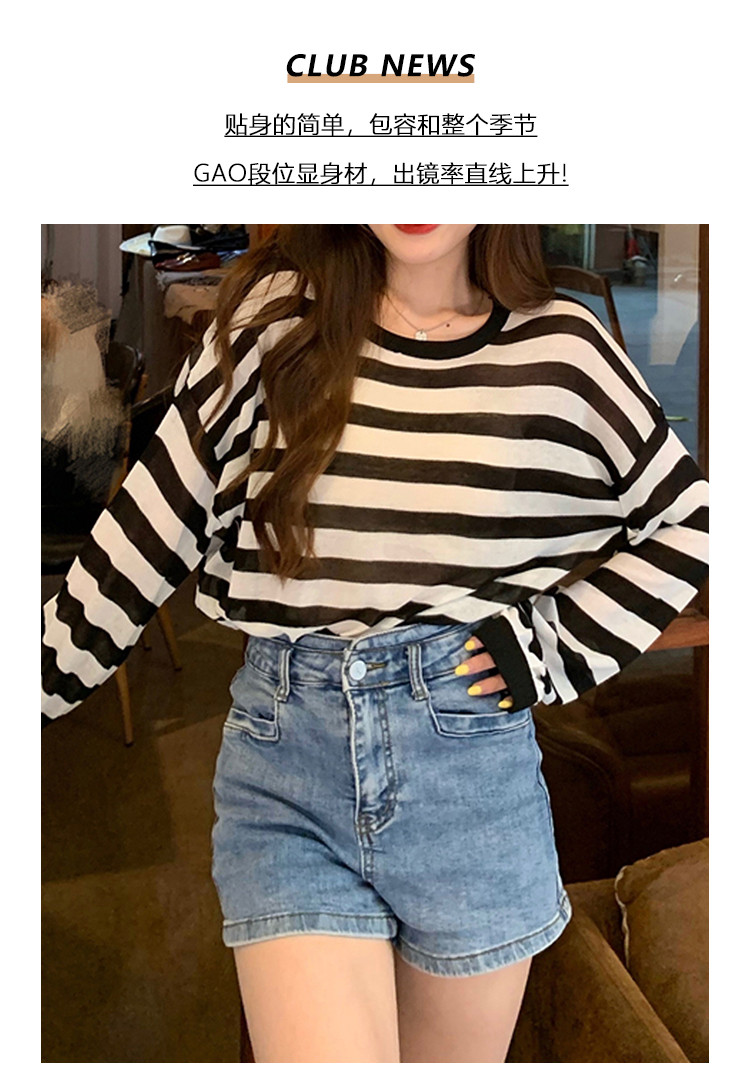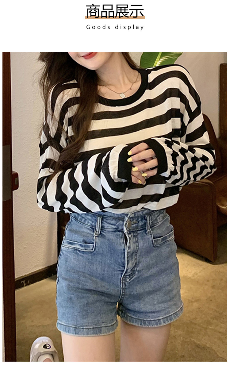 商品名称:圆领薄款条纹宽松空调服慵懒风针织上衣女外穿长袖t恤女 090371
