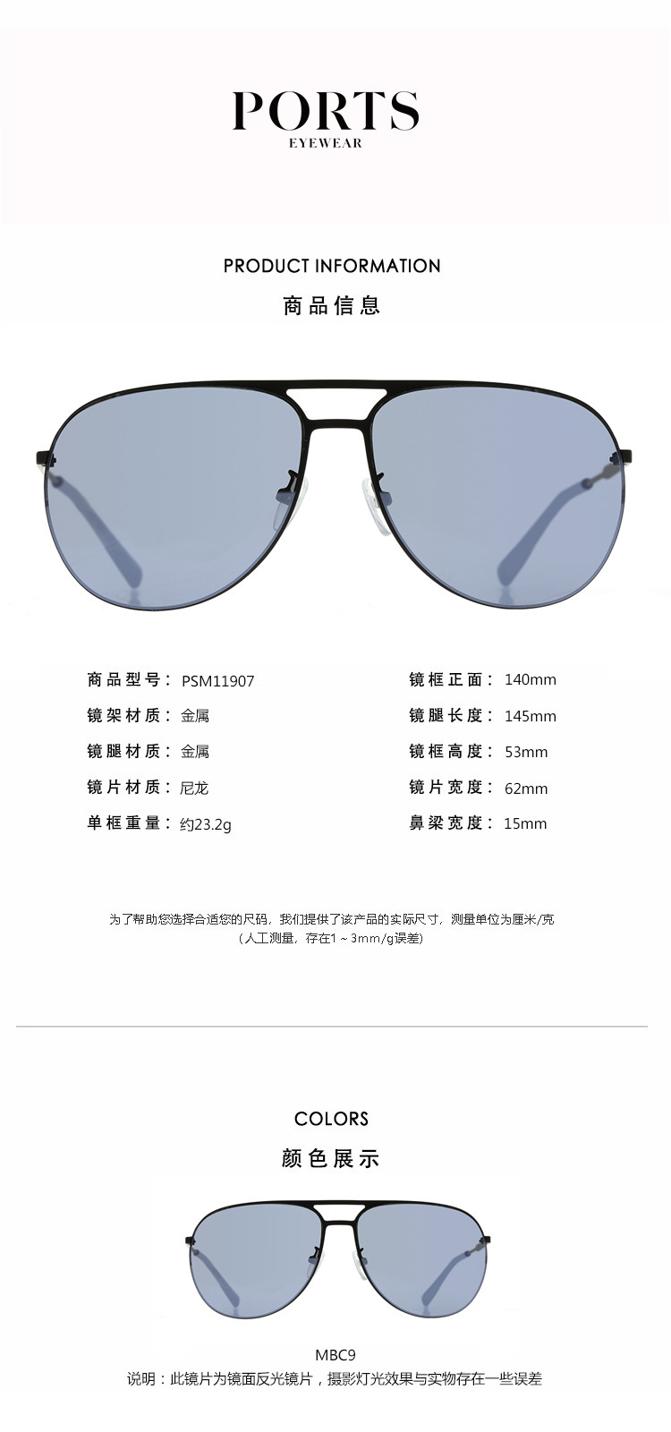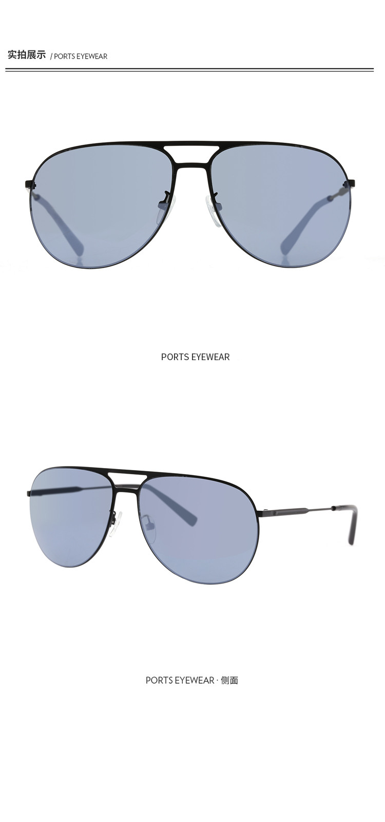 商品名称:PORTS男款个性双梁飞行员框男士太阳镜PSM11907 584906