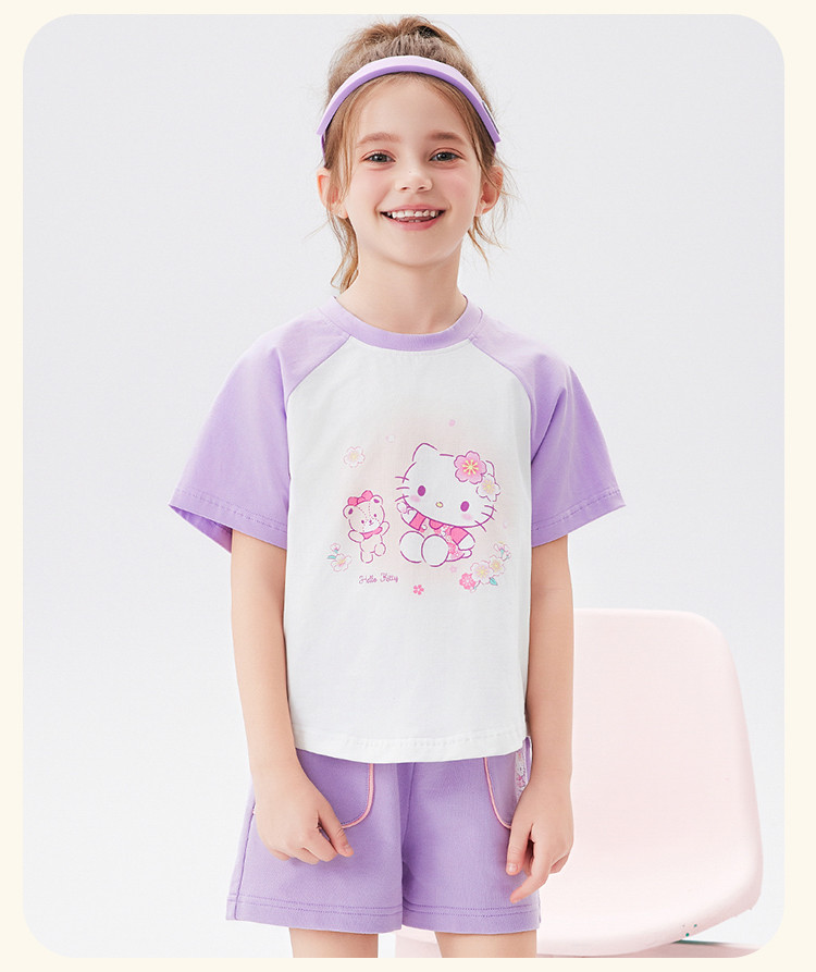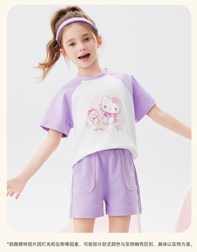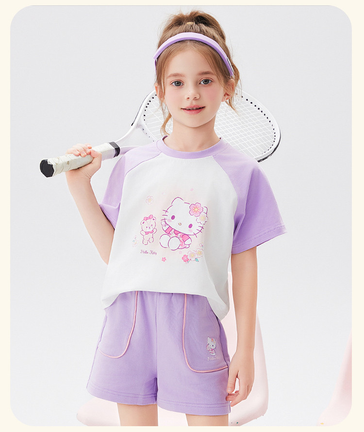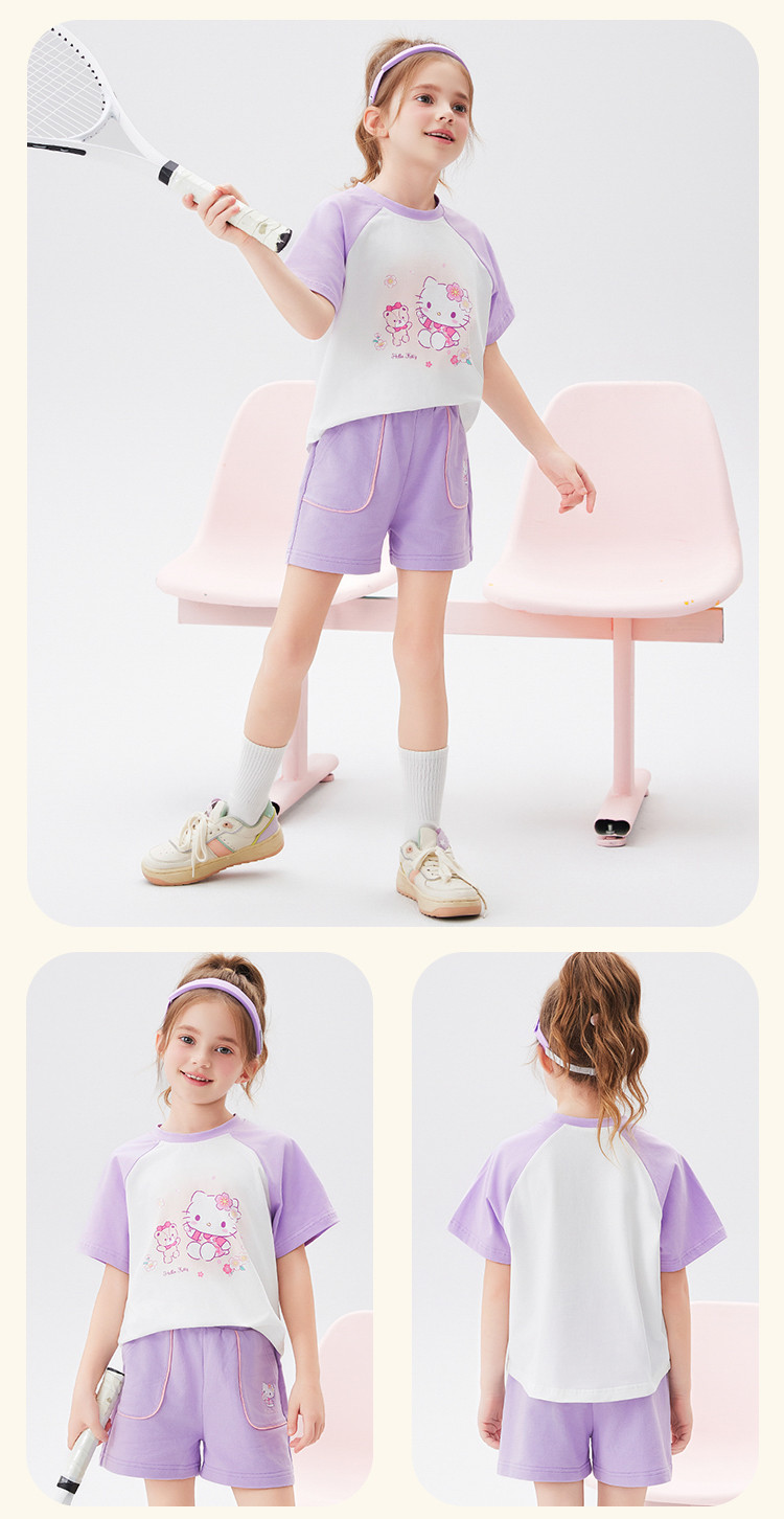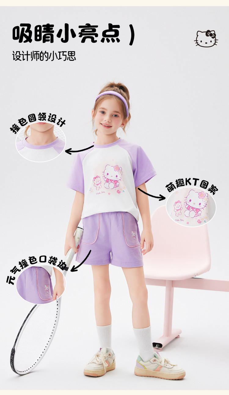 商品名称:女童夏季套装2025款撞色圆领卡通印花上衣元气撞色口袋裤套装 438494