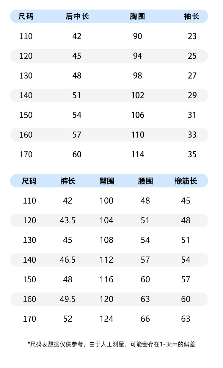 | 尺码 | 袖长(cm) | 上装号型 | 适合年龄 | 下装号型 | 衣长(cm) | 身高(cm) | 腰围(cm) | 裤长(cm) | 臀围(cm) | 胸围(cm) | 号型 |