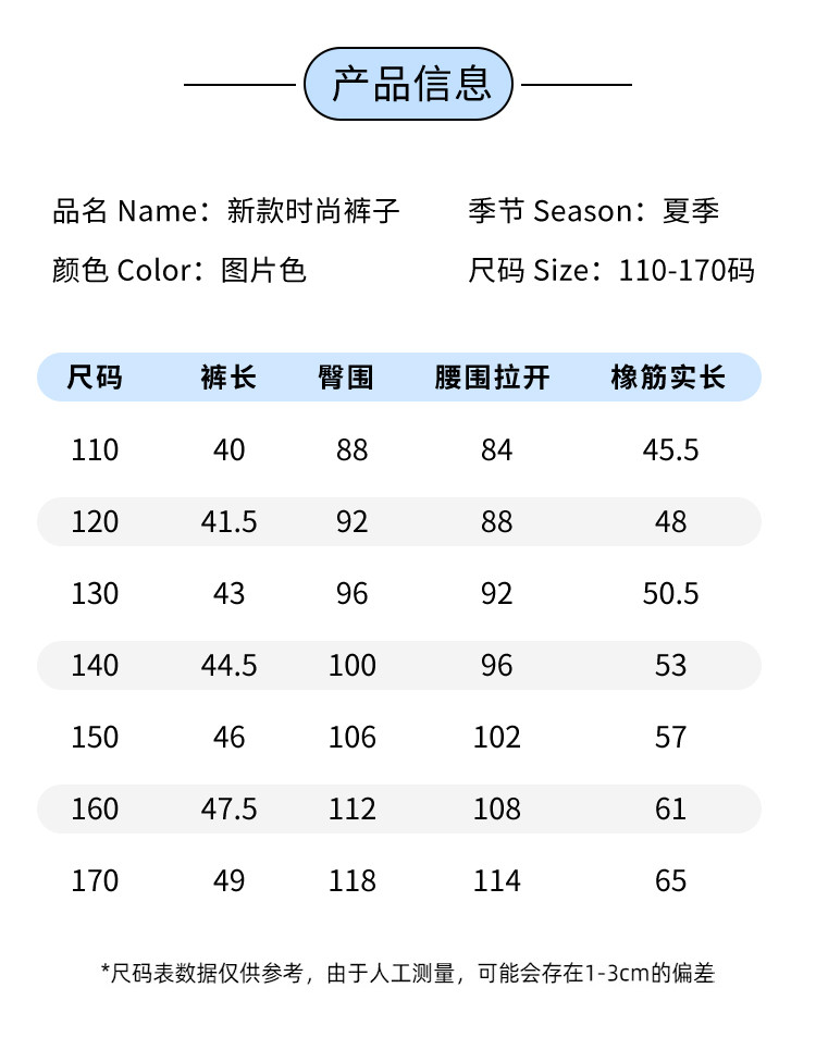 | 尺码 | 身高(cm) | 腰围(cm) | 裤长(cm) | 臀围(cm) | 适合年龄 | 号型 |