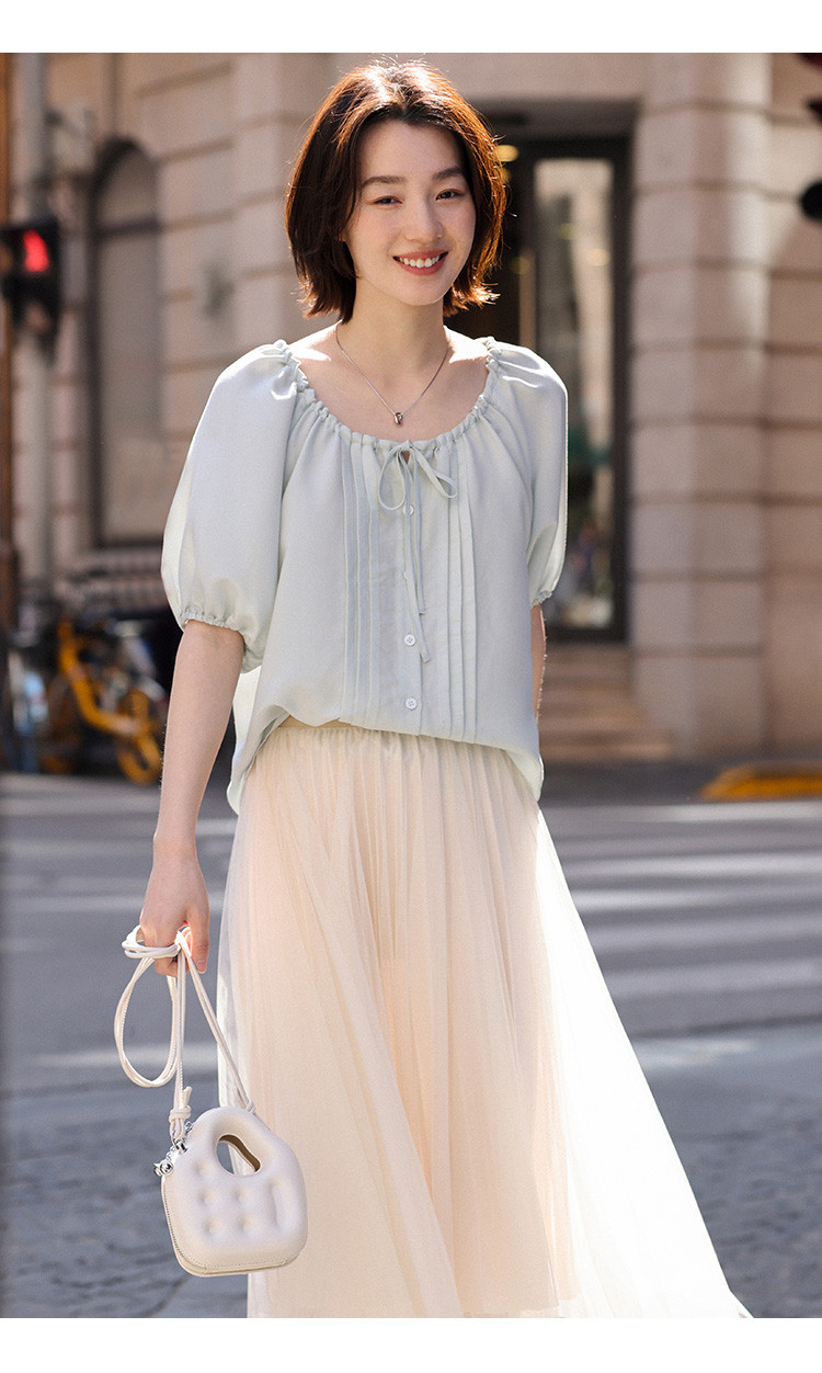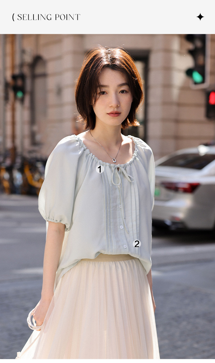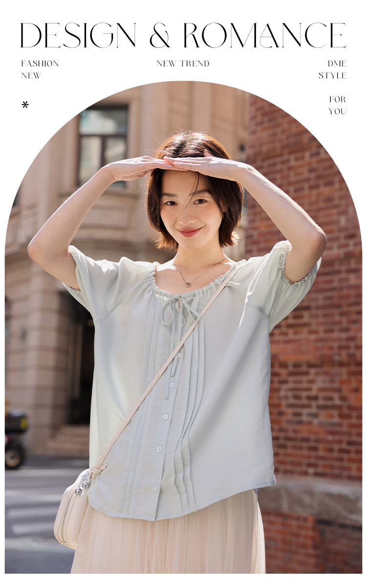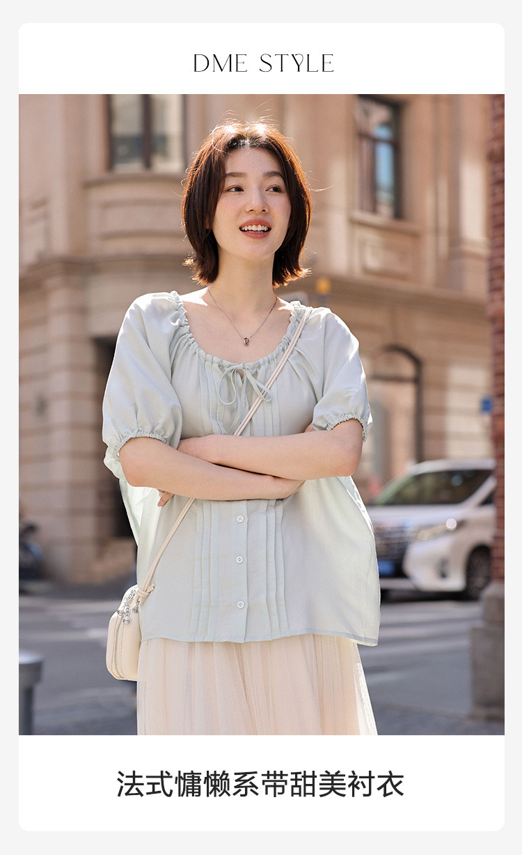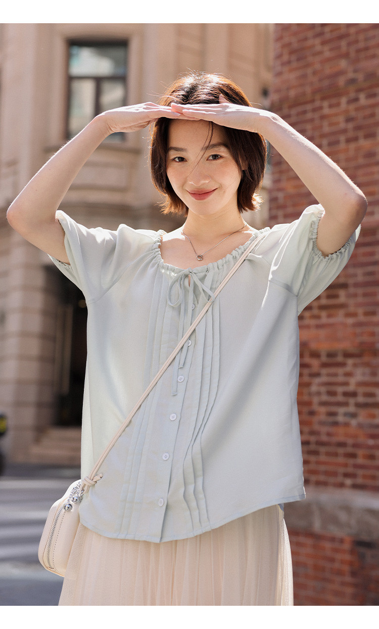 商品名称:【泡泡袖衬衣】夏款法式慵懒压褶系带短袖衬衫女 793026