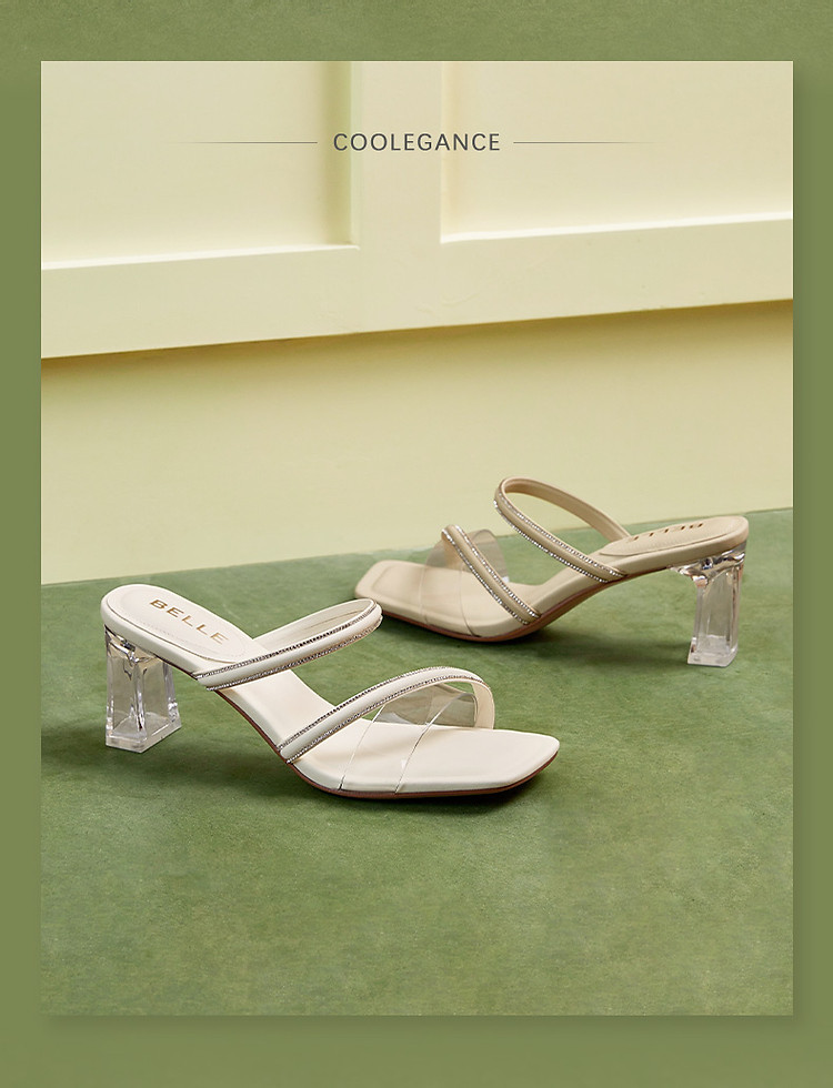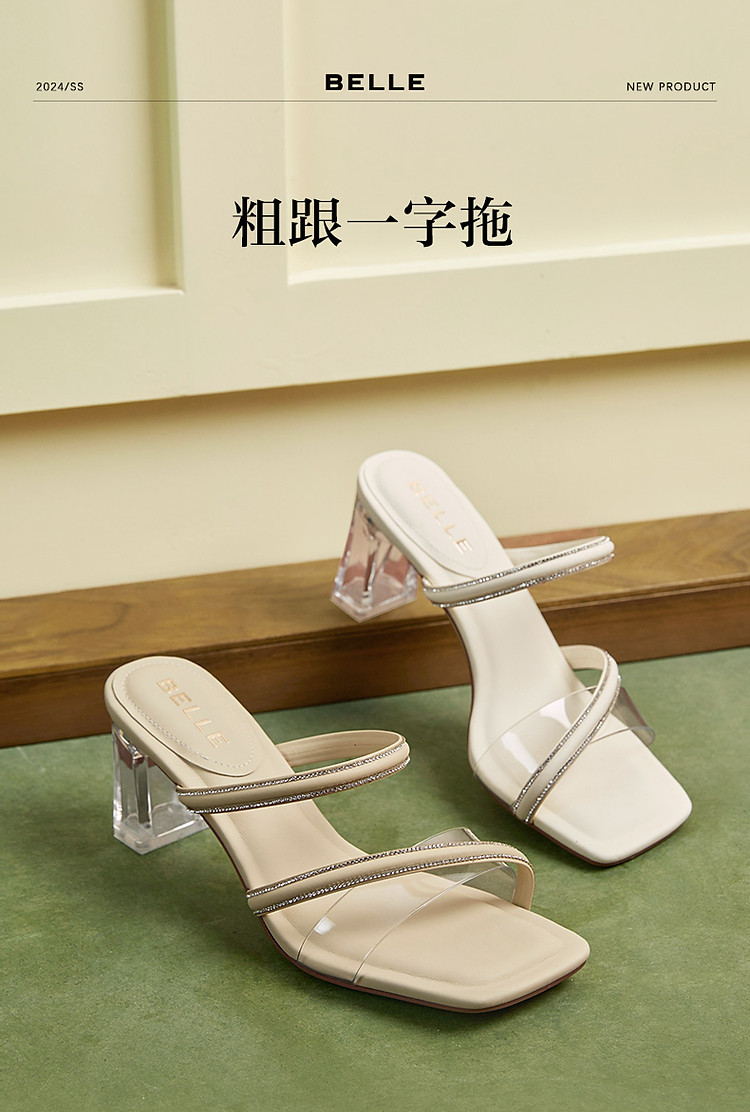百丽女鞋子一字凉拖粗高跟鞋绝美凉鞋春夏外穿拖鞋 352794