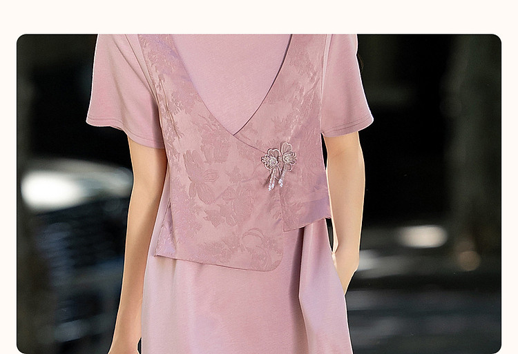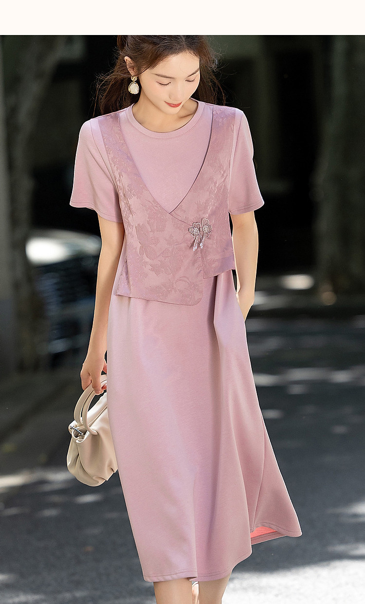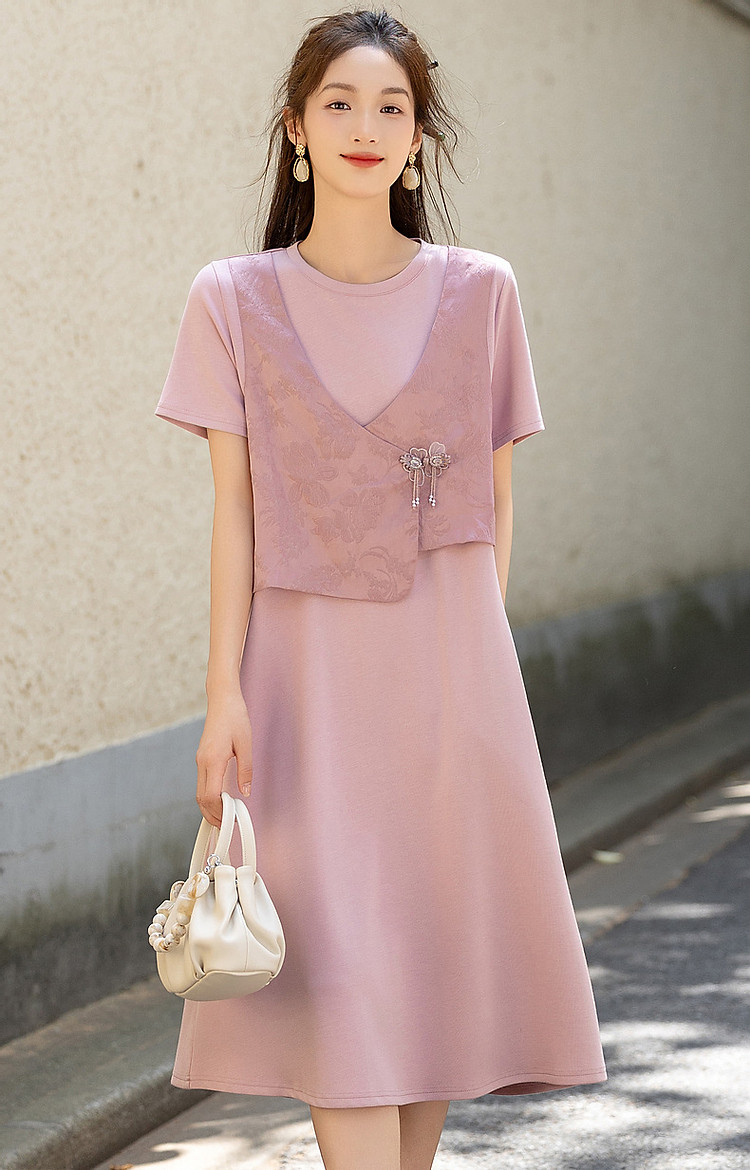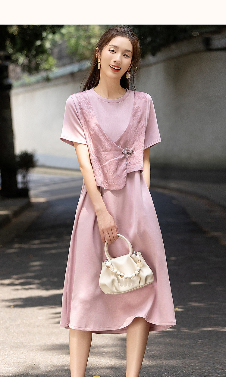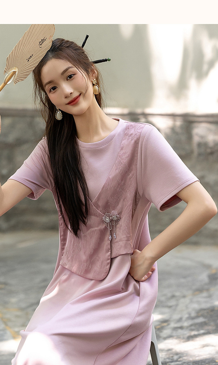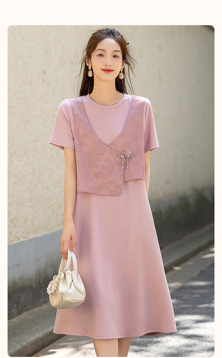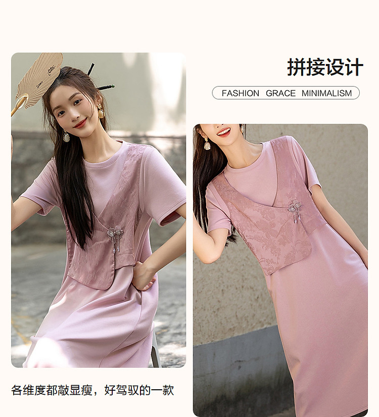 【素月流天】夏国风新中式假两件圆领盘扣短袖拼接针织连衣裙 649857