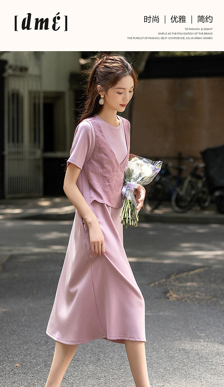 商品名称:【素月流天】夏国风新中式假两件圆领盘扣短袖拼接针织连衣裙 649857