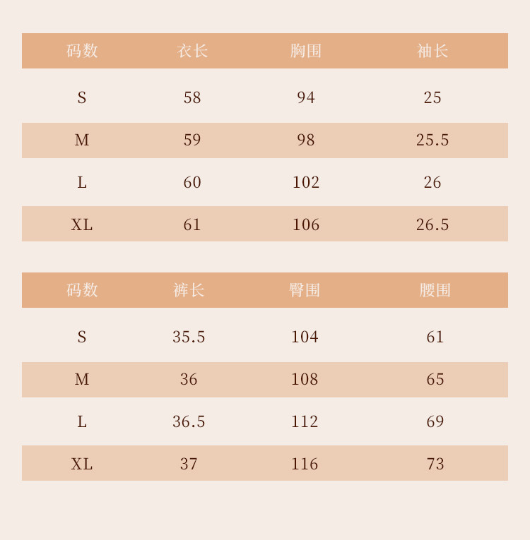 | 尺码 | 袖长(cm) | 下装号型 | 衣长(cm) | 身高(cm) | 腰围(cm) | 裤长(cm) | 体重(kg) | 臀围(cm) | 胸围(cm) | 号型 |