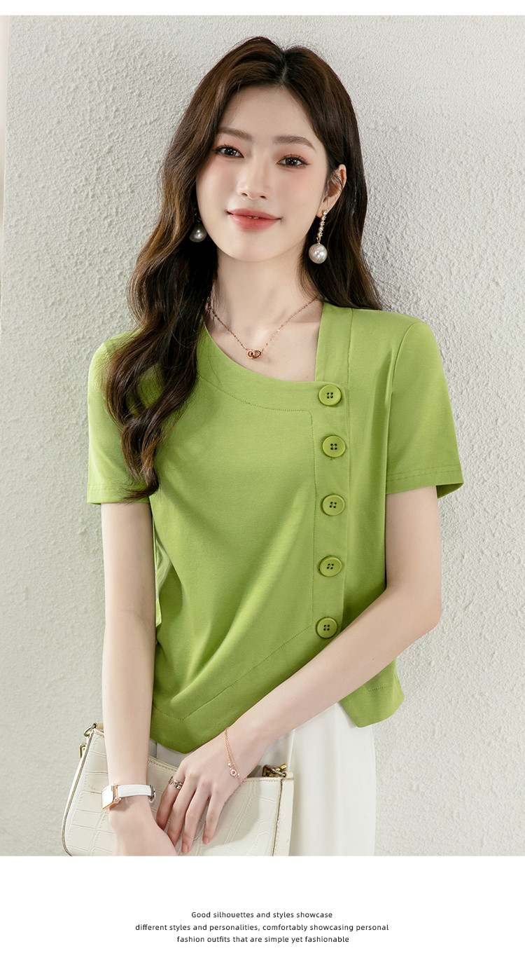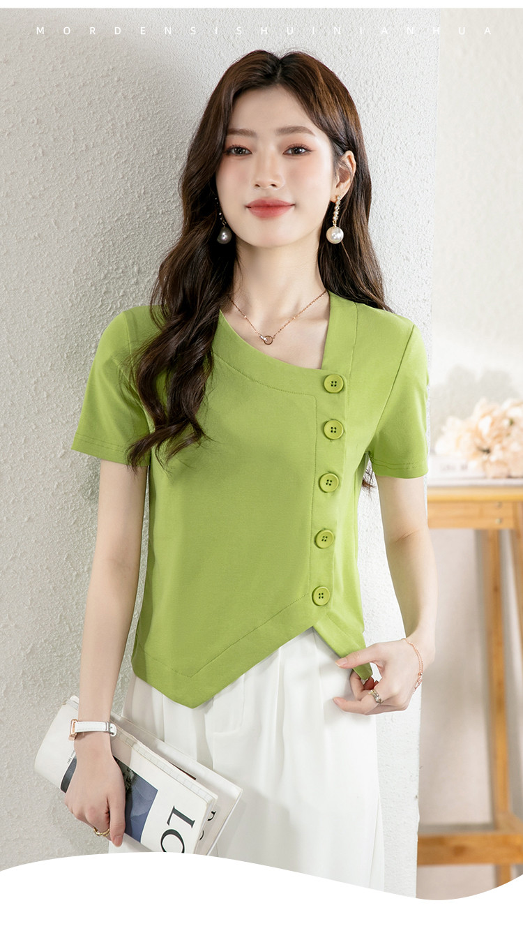 【斜领纽扣不规则设计】夏季休闲时尚短袖T恤女上衣潮流 788504