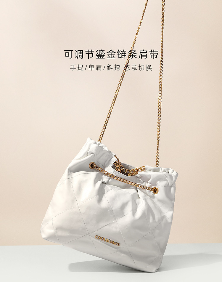 百丽春夏牛皮菱格油蜡皮面垃圾袋包轻奢褶面链条手提托特包 922394