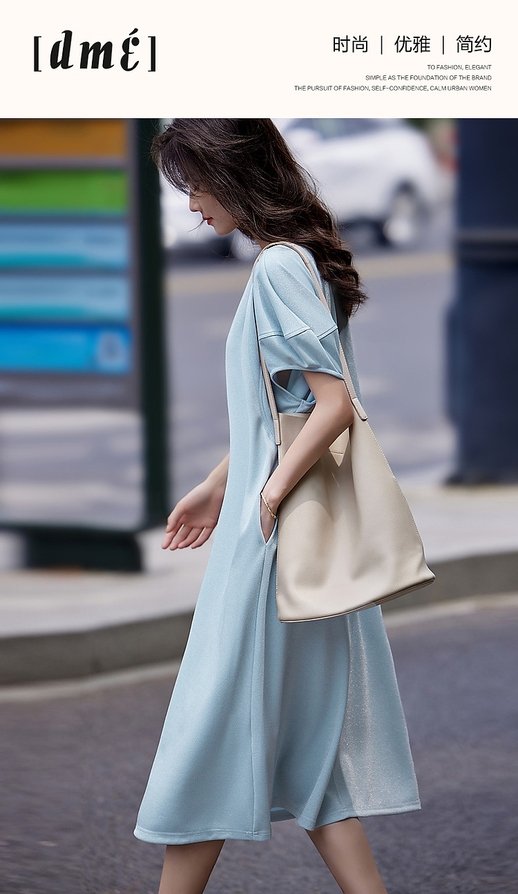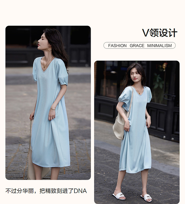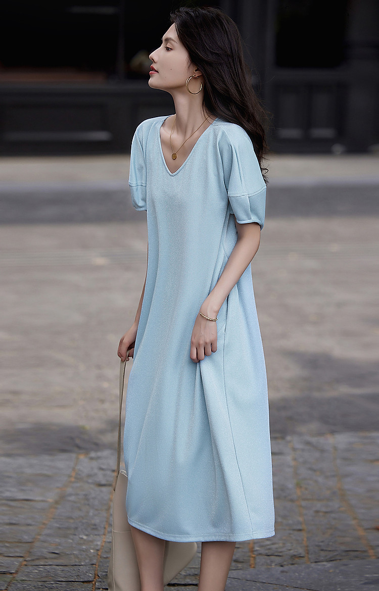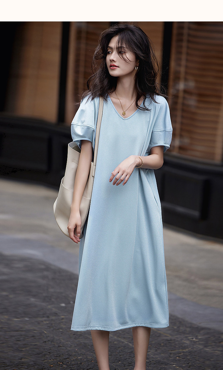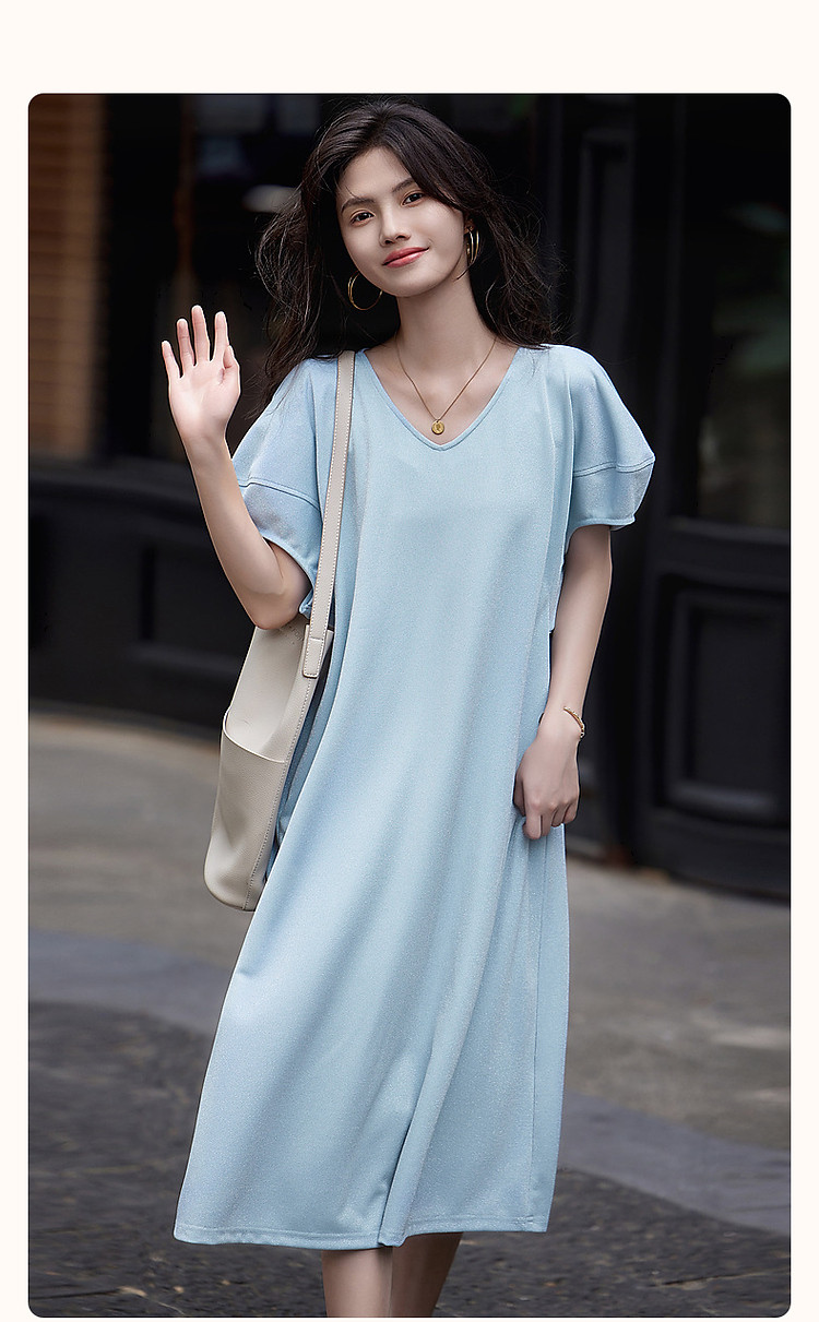 商品名称:【闪粉珠光针织】夏简约风V领显瘦藏肉短袖休闲气质连衣裙 865089