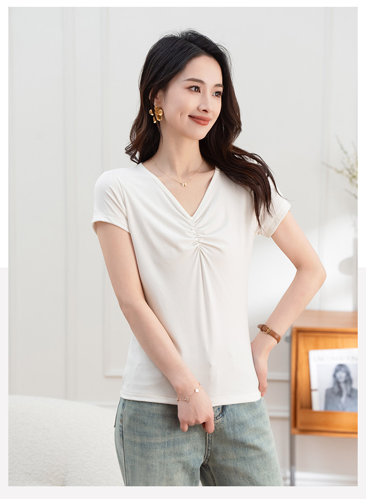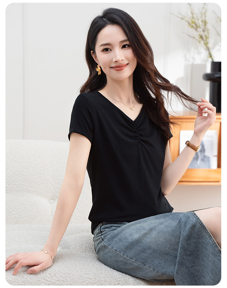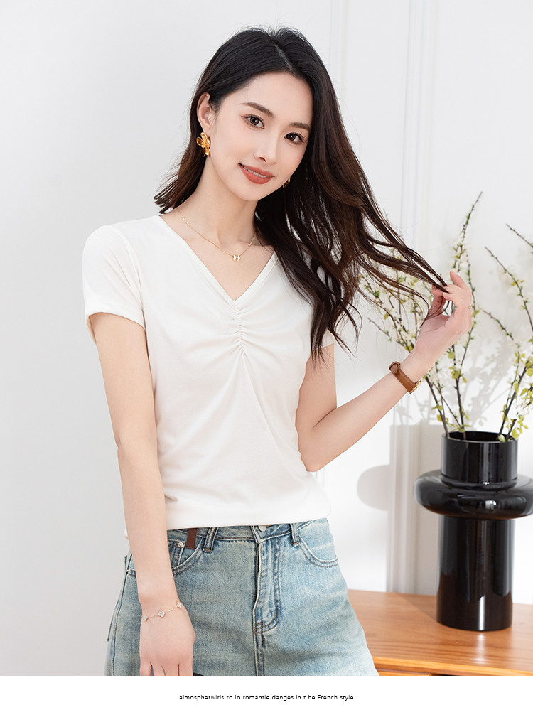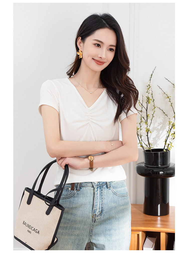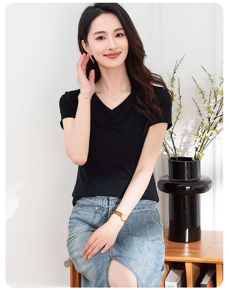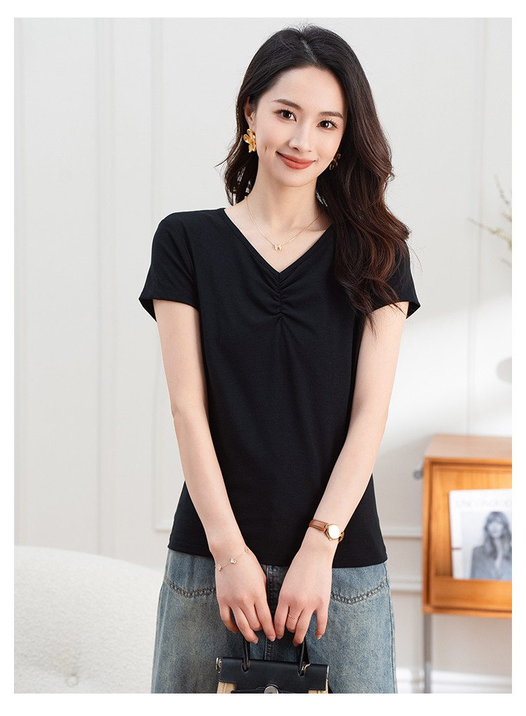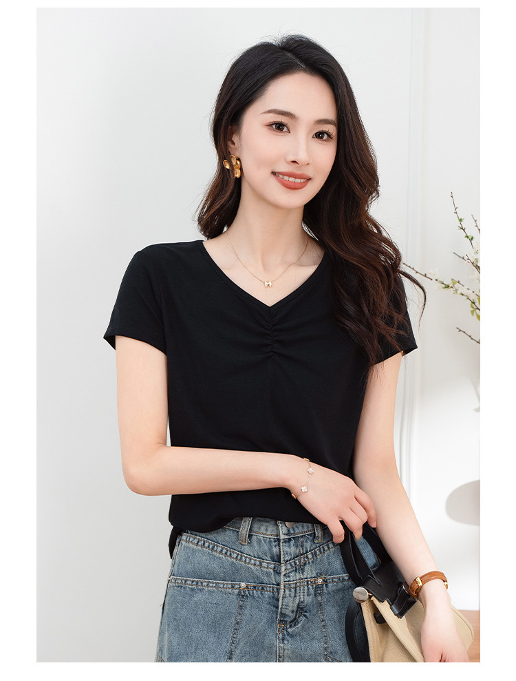 抽褶纯色短款上衣女夏季爆款修身舒适休闲简约气质V领短袖T恤女 430593