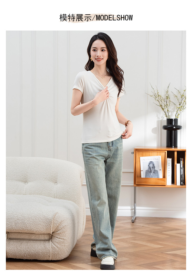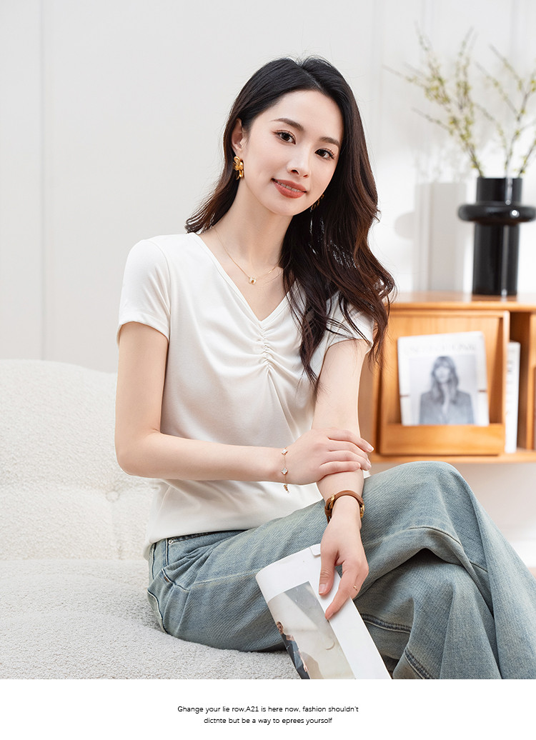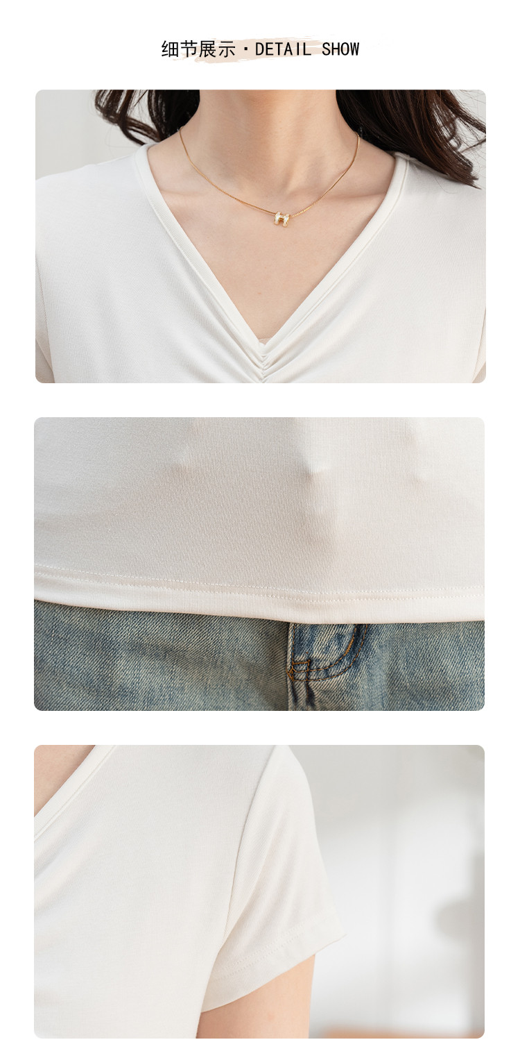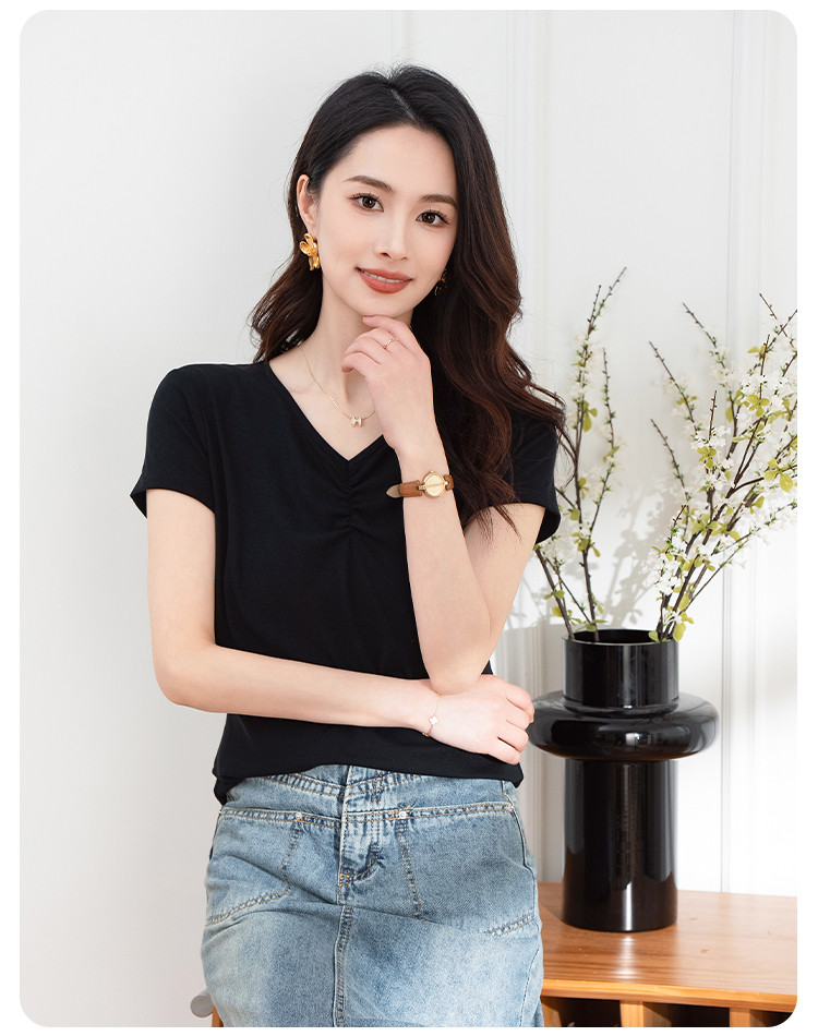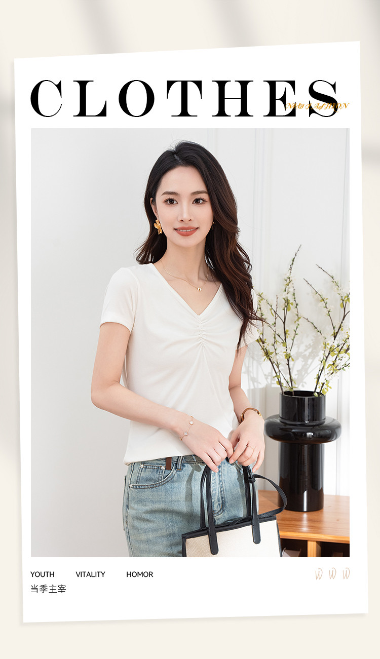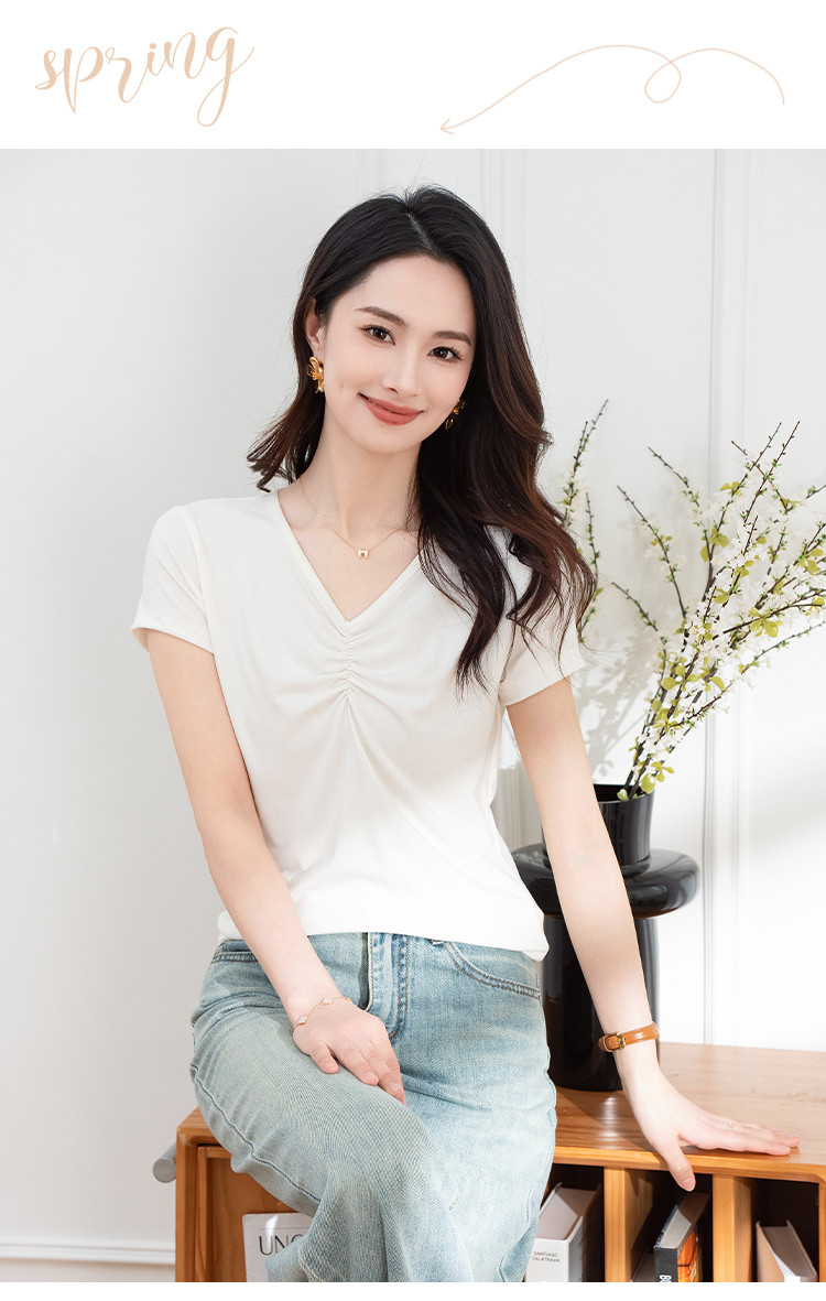 抽褶纯色短款上衣女夏季爆款修身舒适休闲简约气质V领短袖T恤女 430593