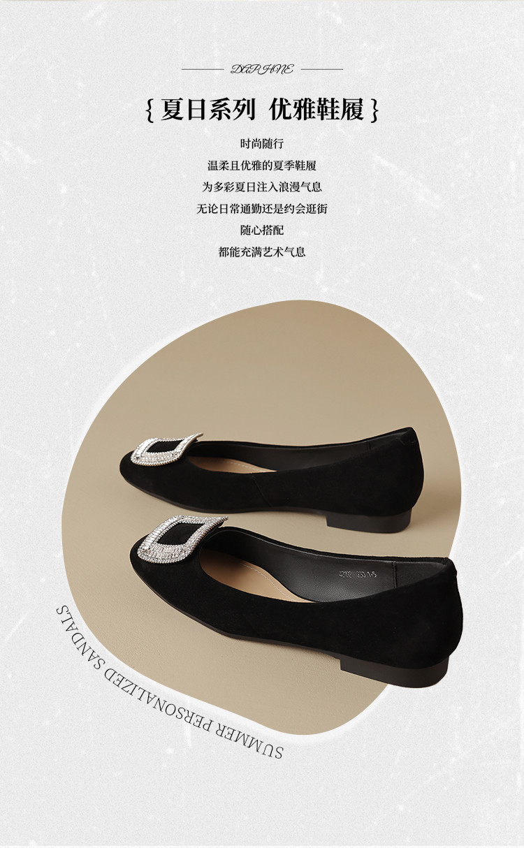 羊绒平底单鞋女四季款浅口平底鞋女水钻黑色通勤职业女鞋 042074