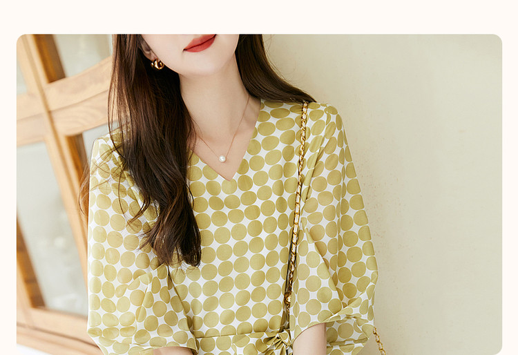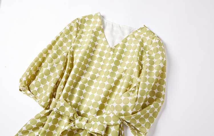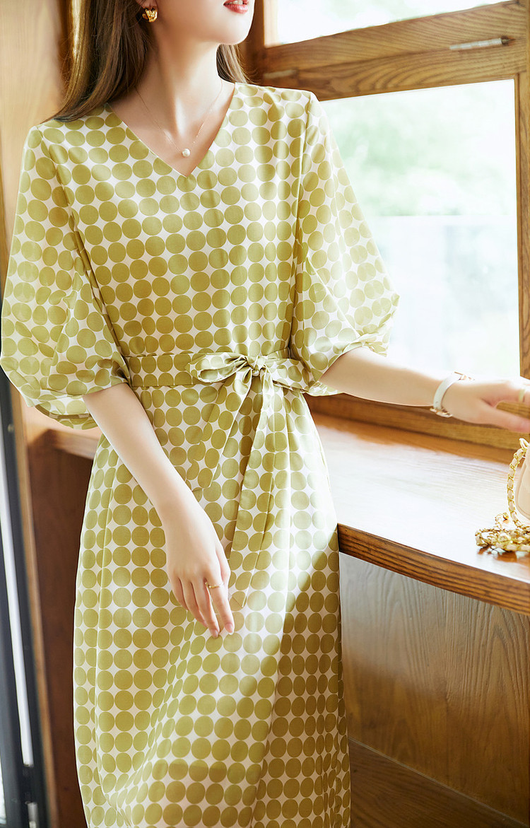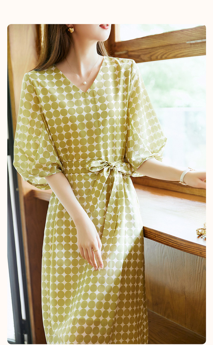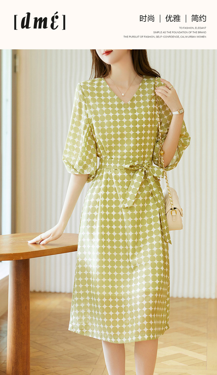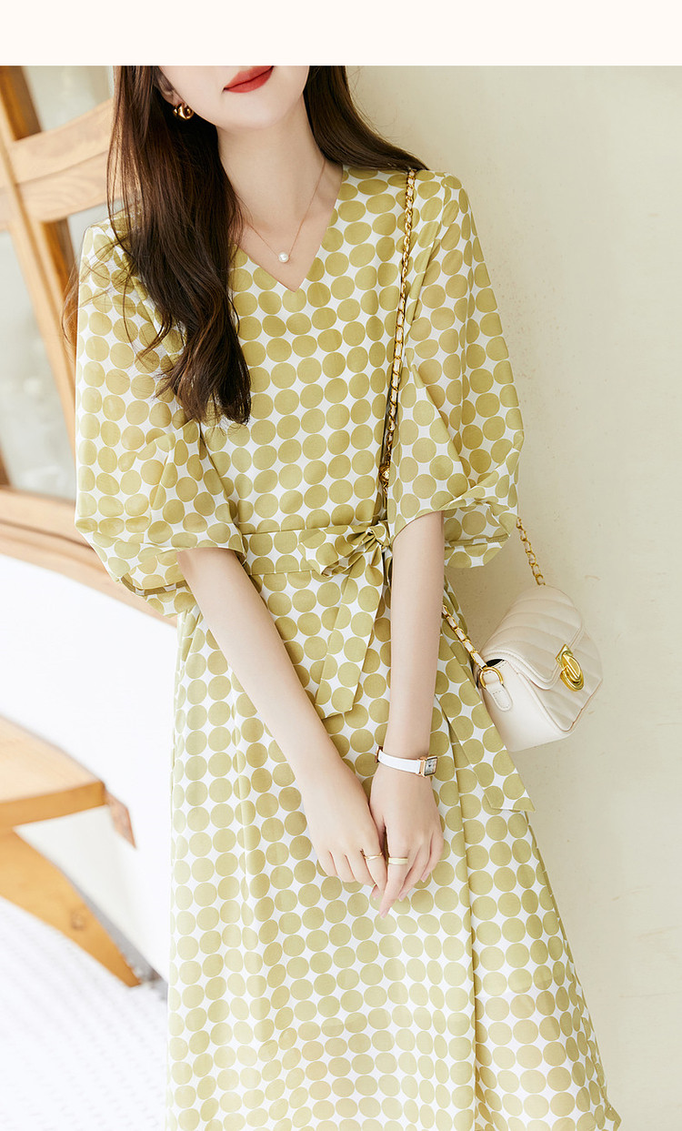 商品名称:【克莱因蓝】夏复古风V领波点灯笼袖雪纺小个子连衣裙女中长款 061889