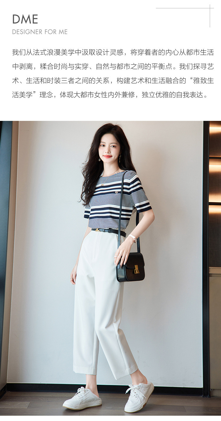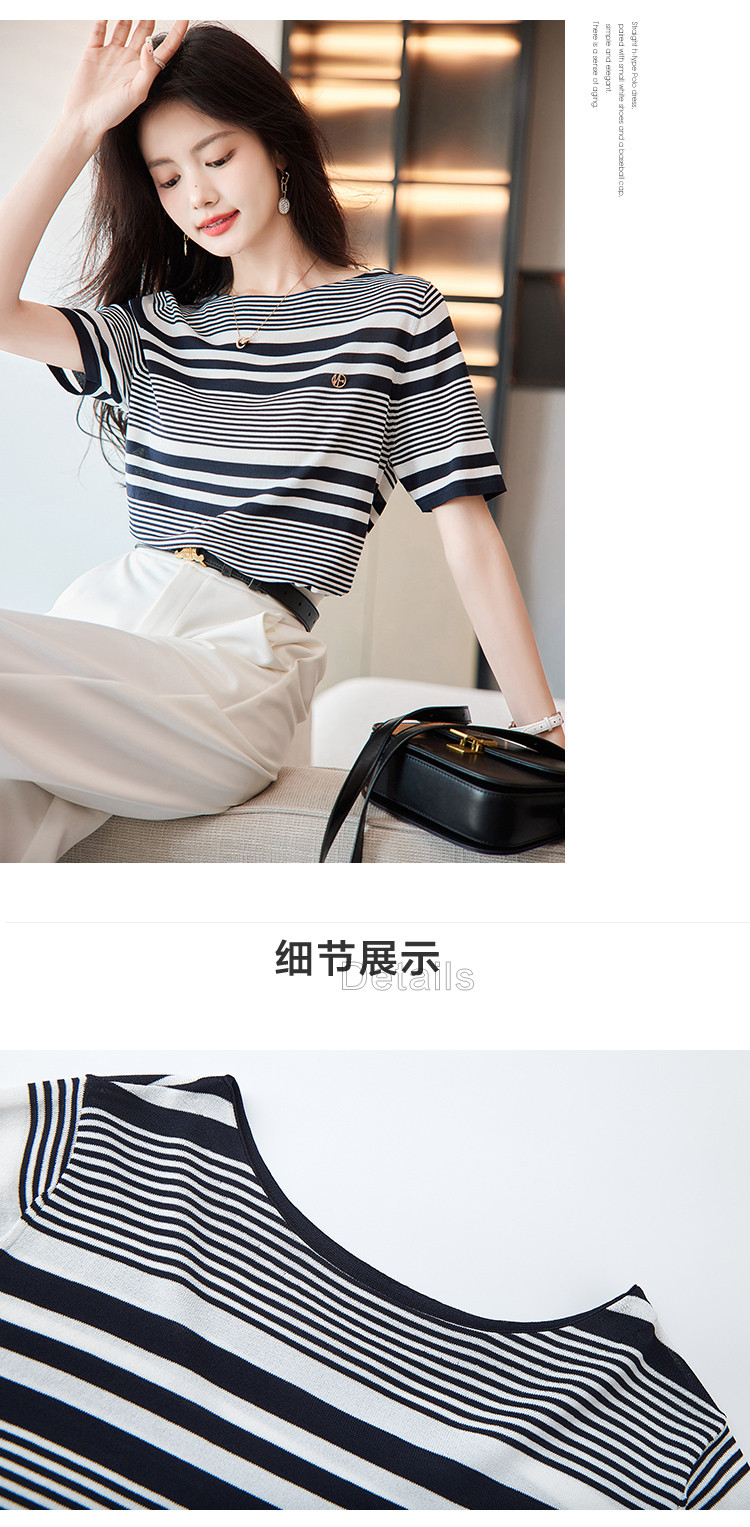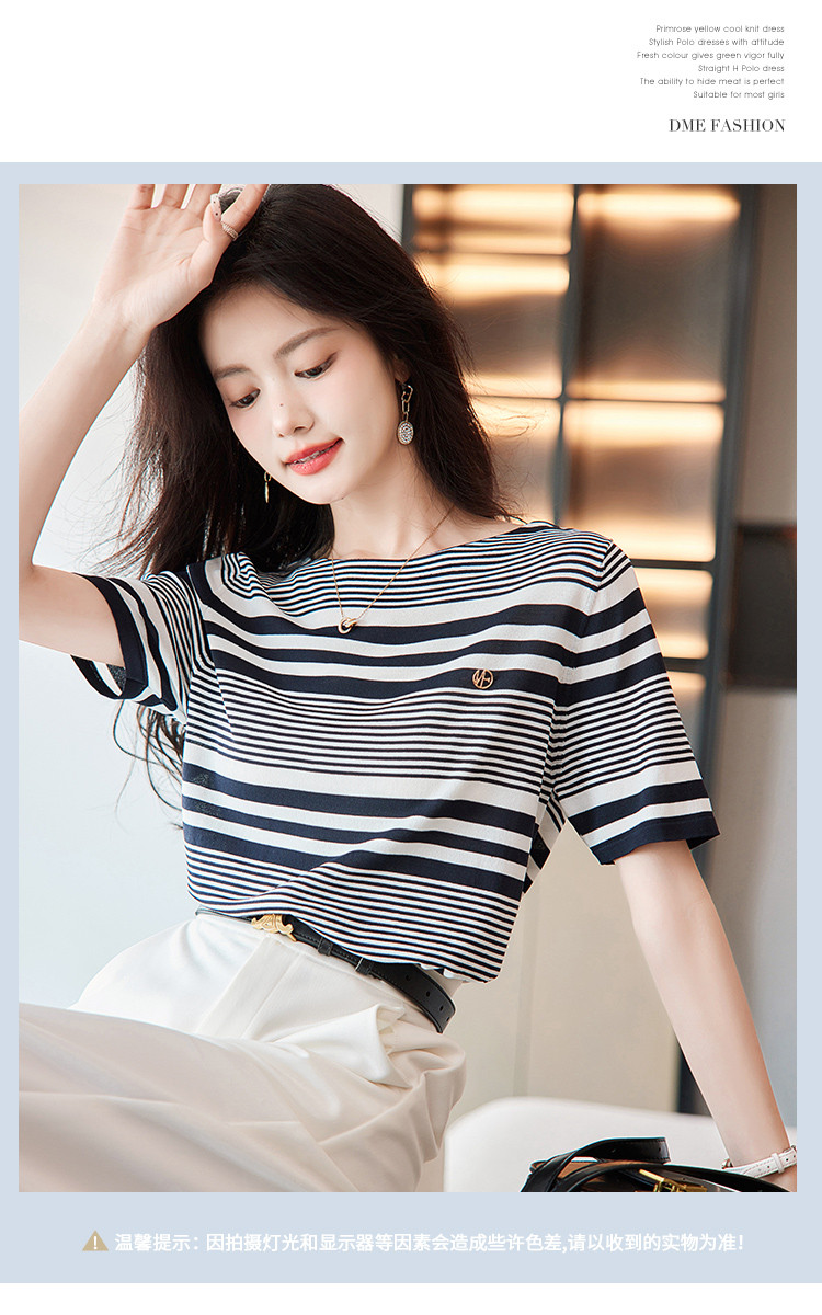 商品名称:【通勤双曲冰麻条纹线衫】夏圆领短袖针织衫女上衣 928513