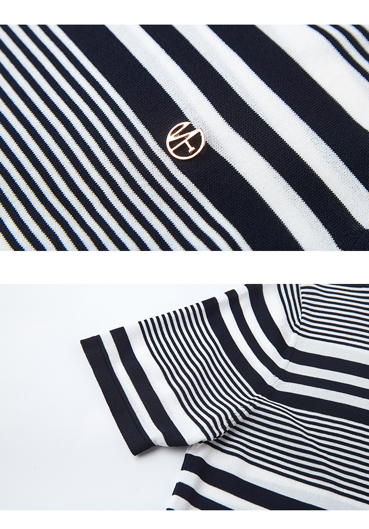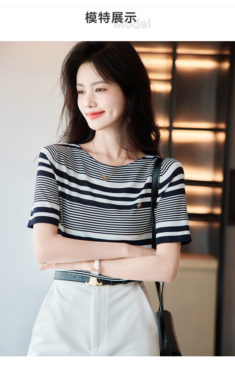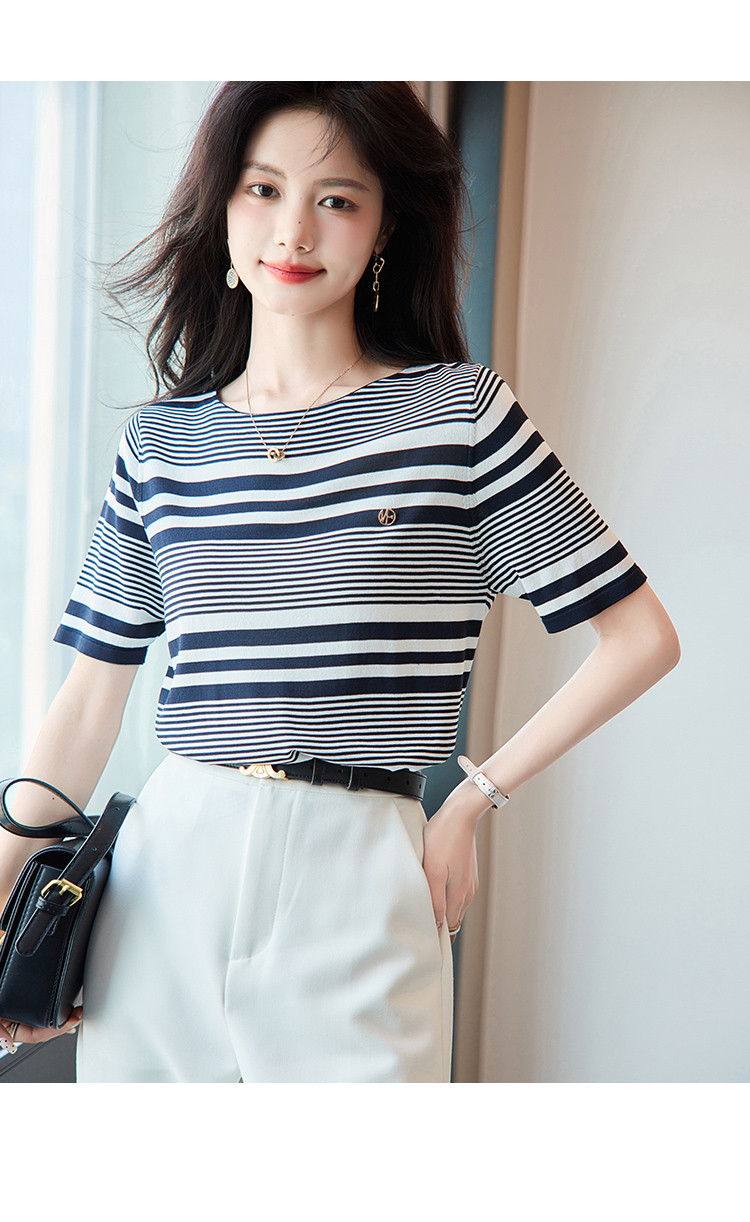 【通勤双曲冰麻条纹线衫】夏圆领短袖针织衫女上衣 928513
