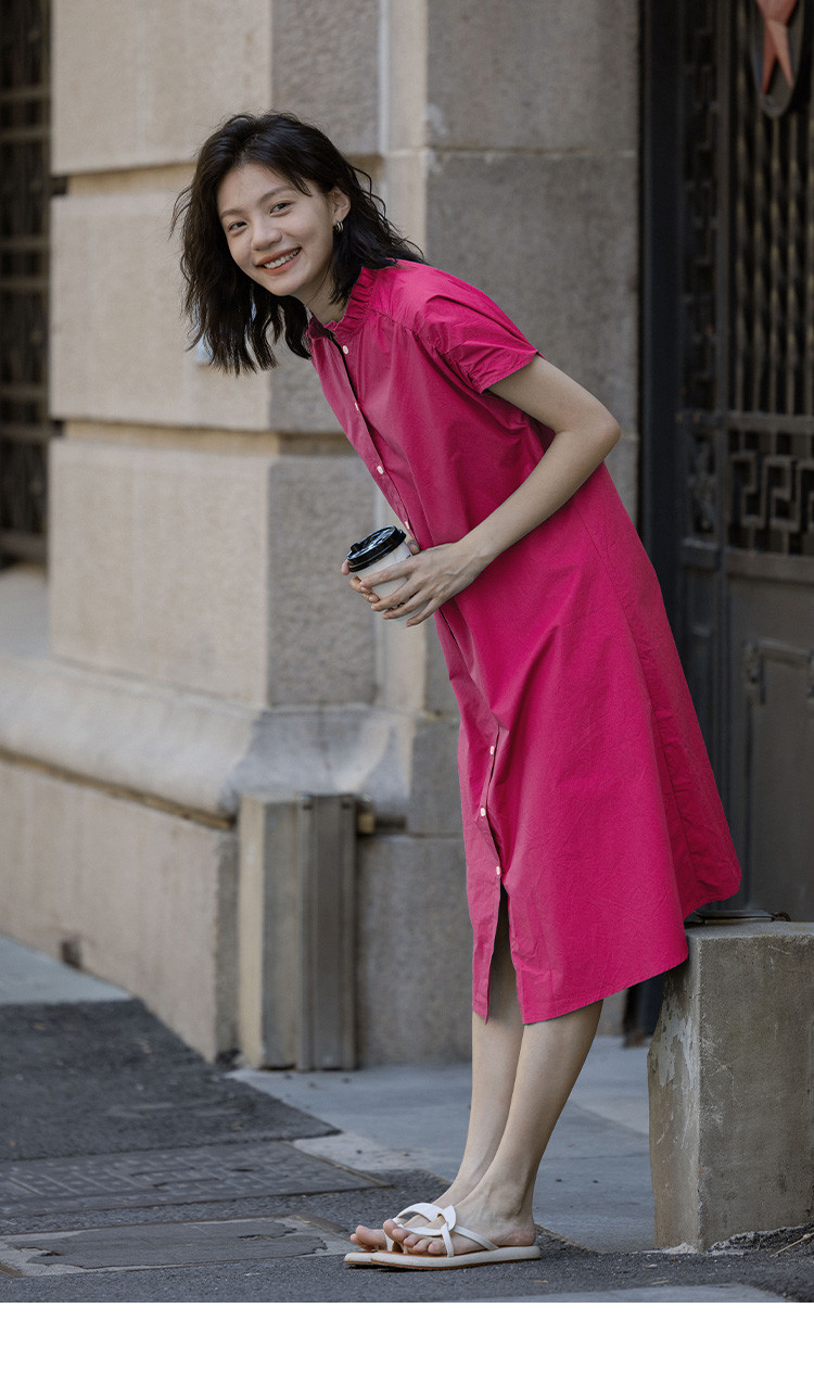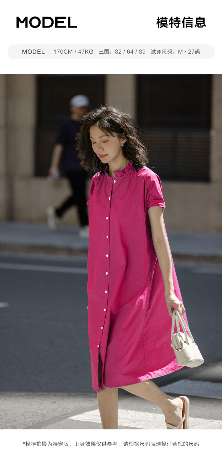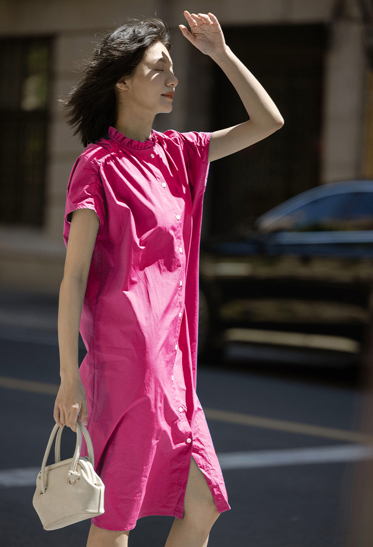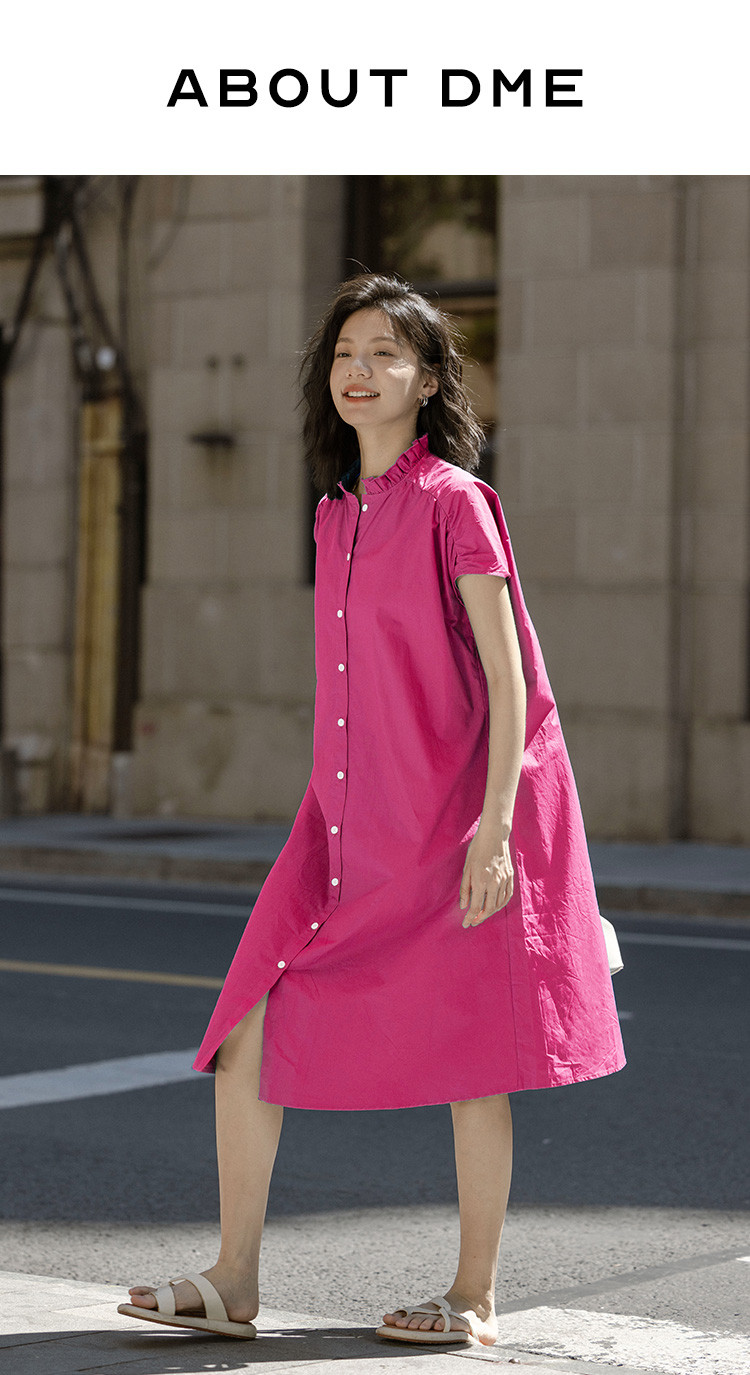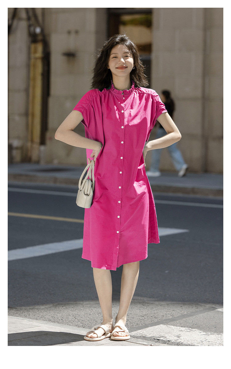 商品名称:【多巴胺玫红衬衫裙】夏肩部抽褶设计长短袖中长款连衣裙 149378