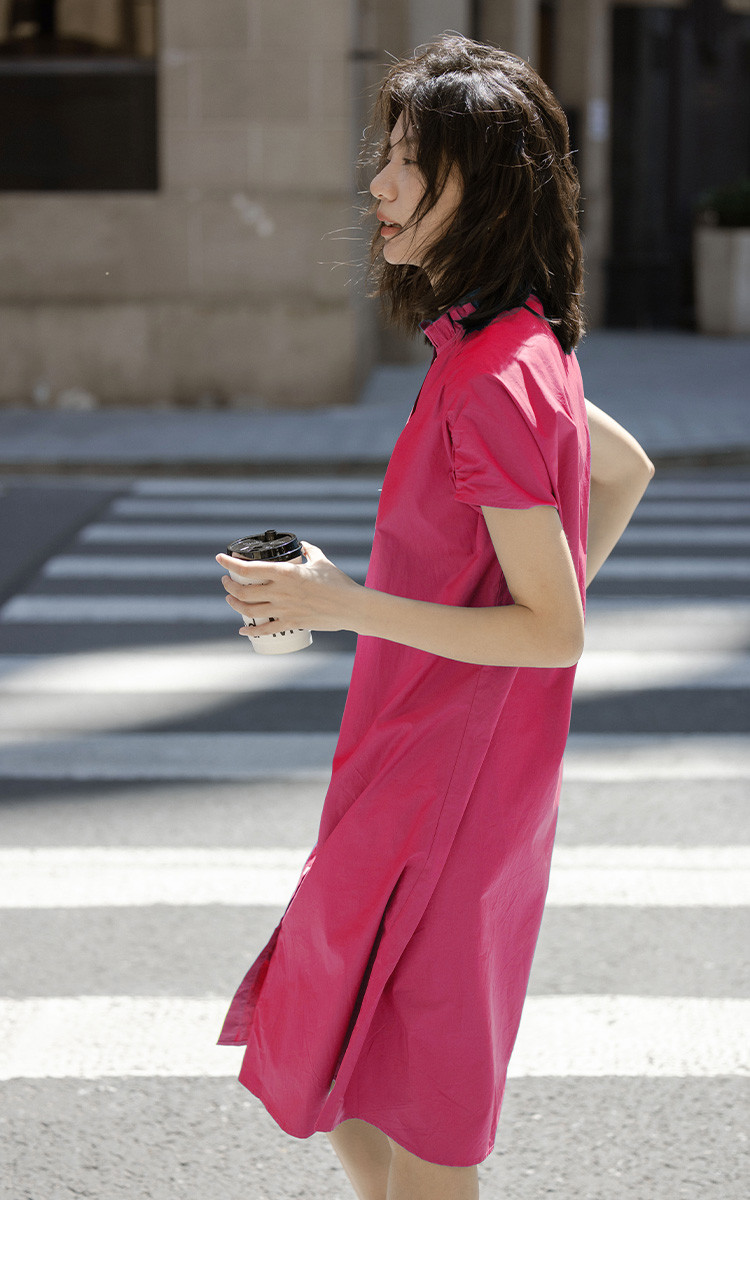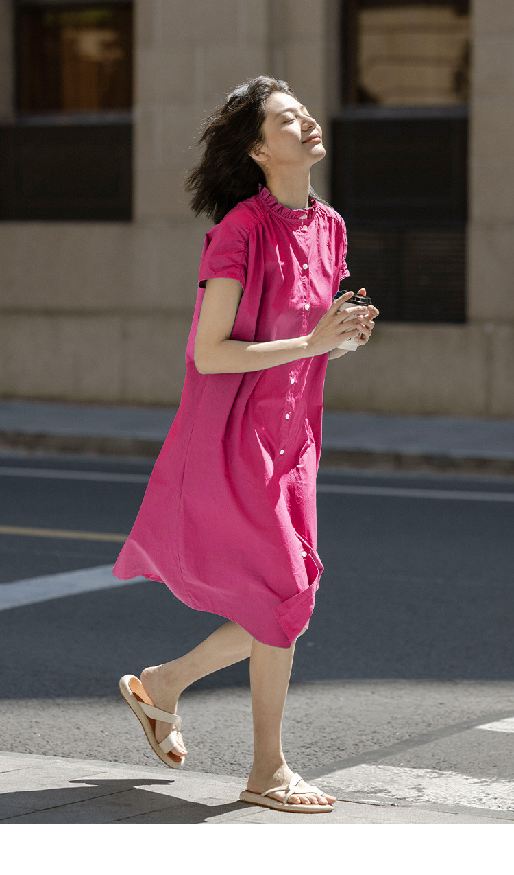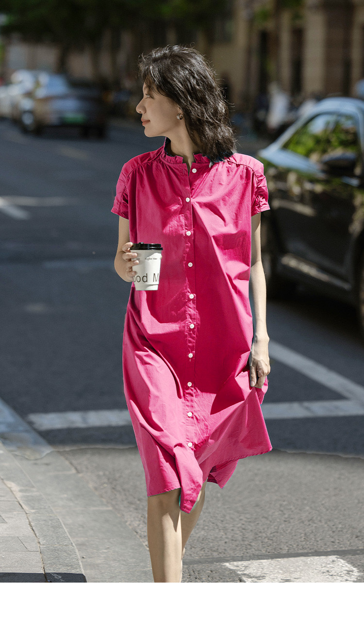 【多巴胺玫红衬衫裙】夏肩部抽褶设计长短袖中长款连衣裙 149378