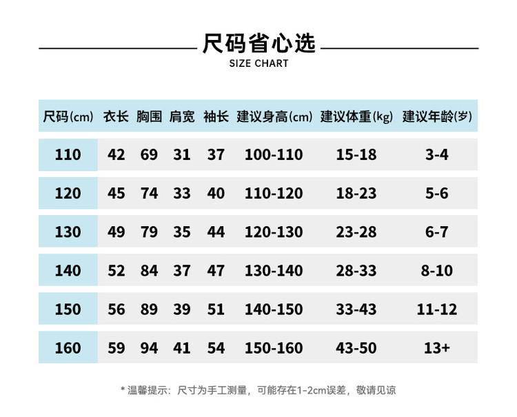 | 尺码 | 衣长(cm) | 肩宽(cm) | 身高(cm) | 袖长(cm) | 适合年龄 | 胸围(cm) | 号型 |