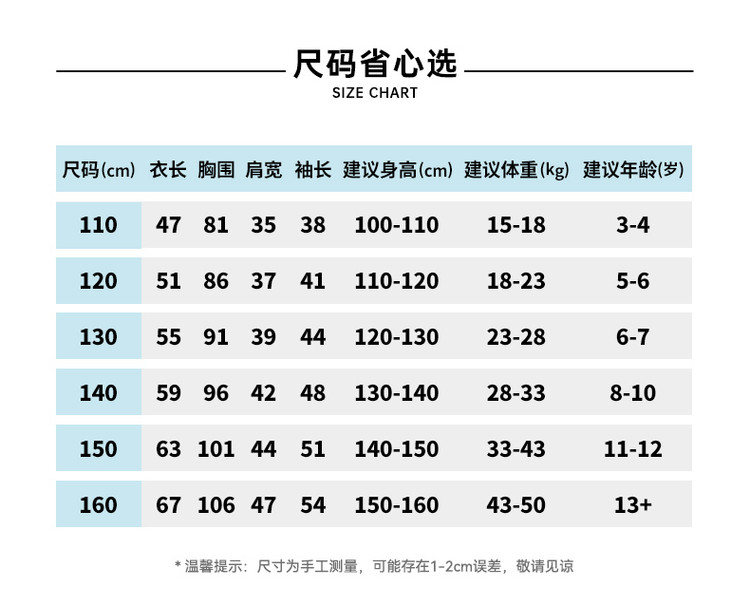 尺码 衣长(cm) 肩宽(cm) 身高(cm) 袖长(cm) 适合年龄 胸围(cm) 号型