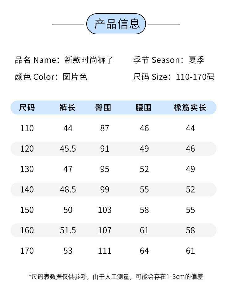 | 尺码 | 身高(cm) | 腰围(cm) | 裤长(cm) | 臀围(cm) | 适合年龄 | 号型 |