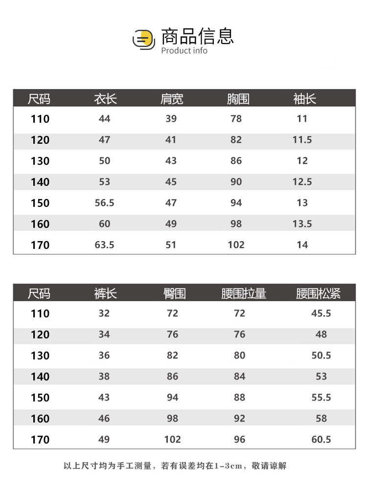 | 尺码 | 肩宽(cm) | 袖长(cm) | 上装号型 | 适合年龄 | 下装号型 | 衣长(cm) | 身高(cm) | 腰围(cm) | 裤长(cm) | 臀围(cm) | 胸围(cm) | 号型 |