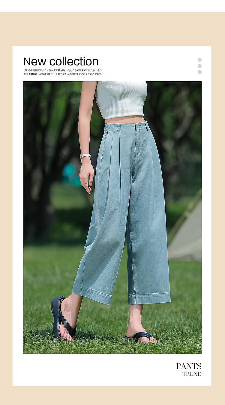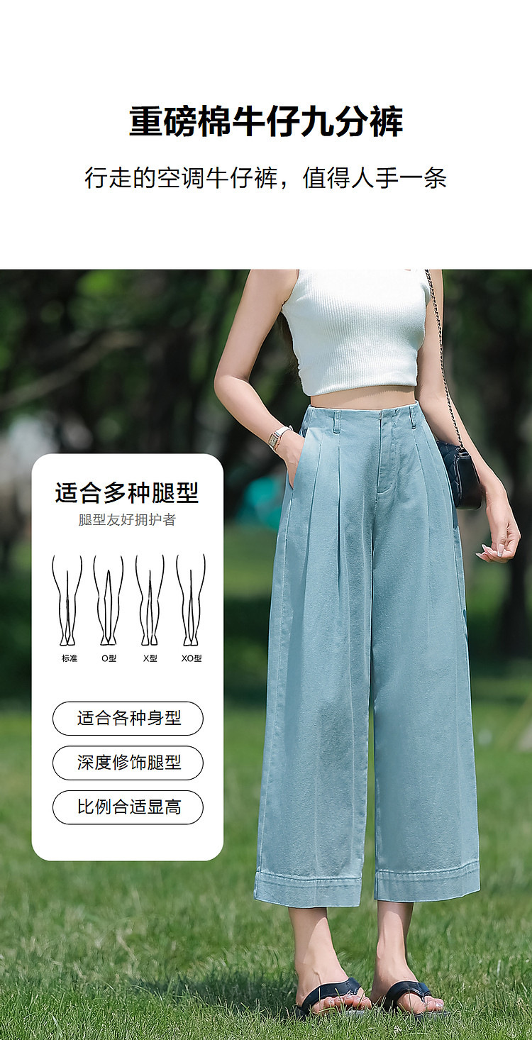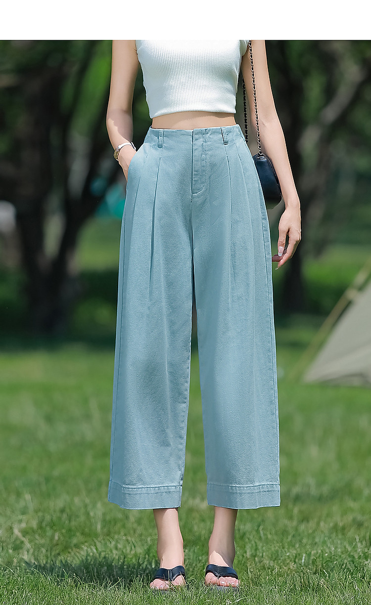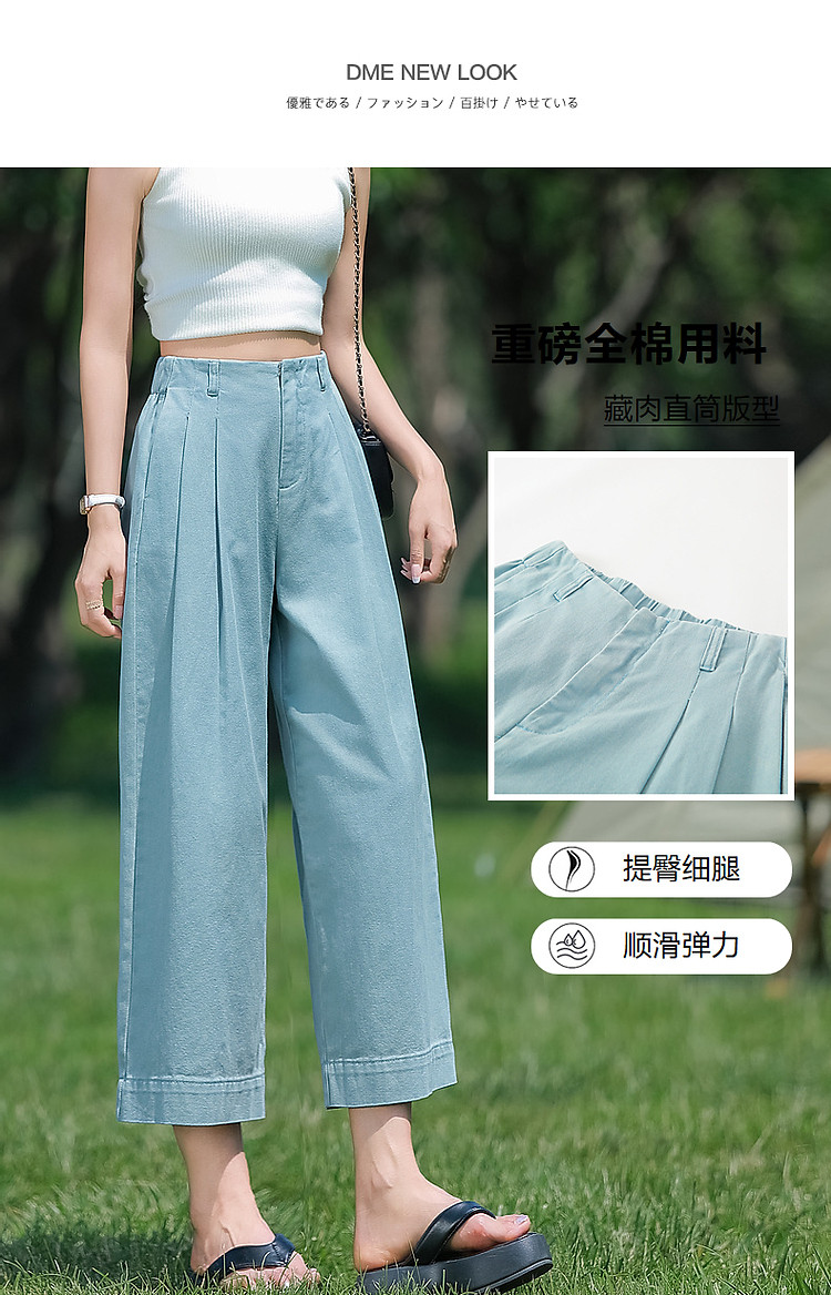 商品名称:【重磅100%棉牛仔九分裤】夏新通勤褶裥翻脚口直筒阔腿牛仔裤 004353