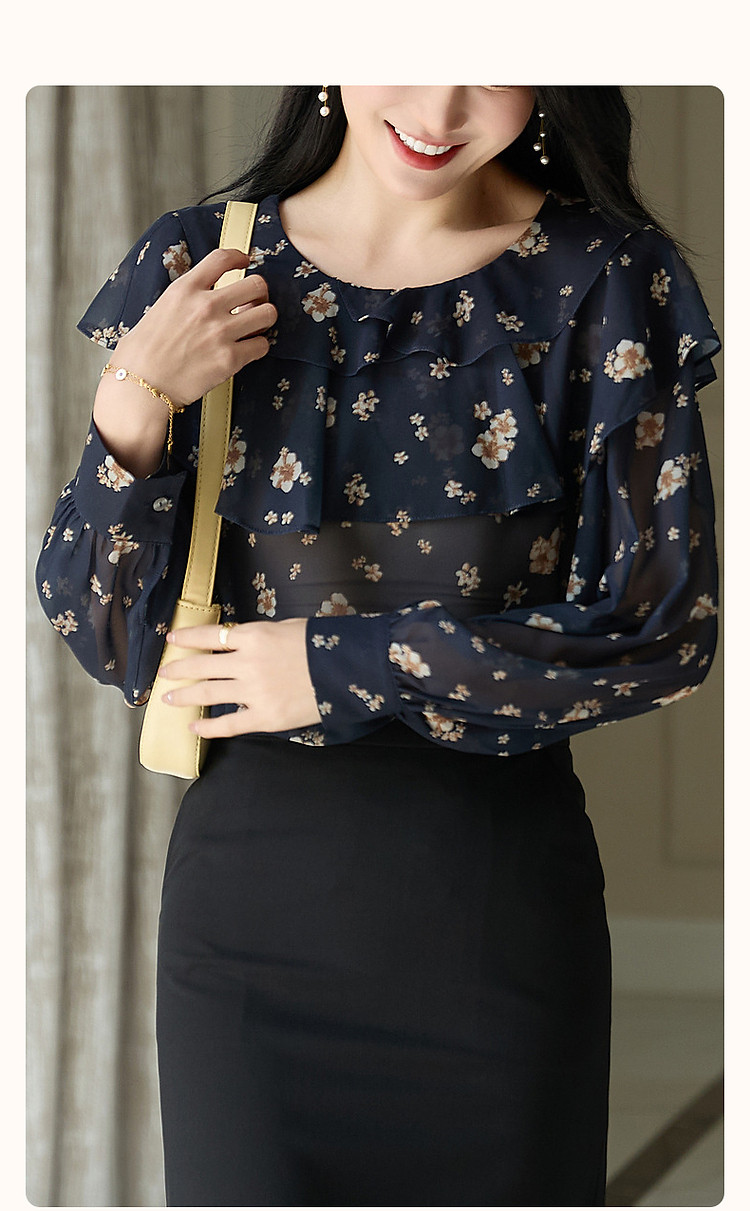 【山抹微云】秋法式飘逸双层荷边衬衫爽滑雪纺泡泡袖衬衣女装上衣 492865
