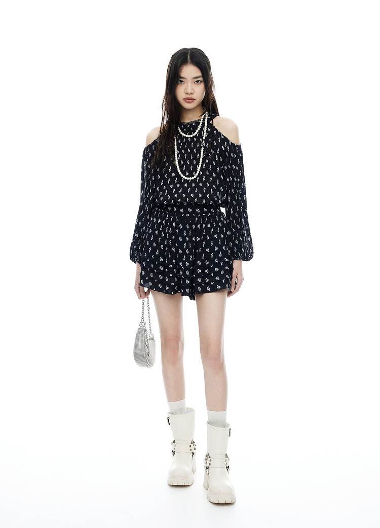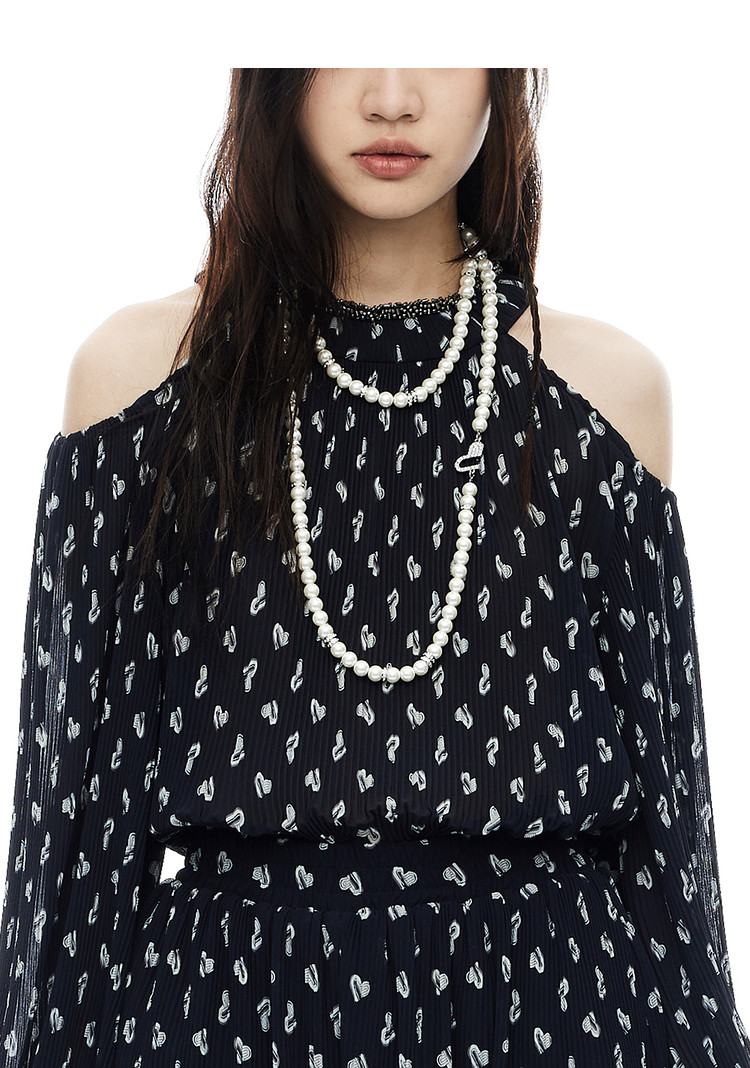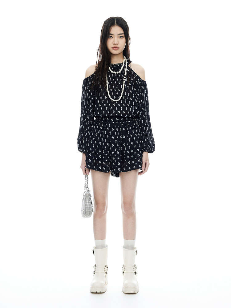 地素雪纺上衣夏季露肩设计感长袖爱心老花衬衫女 317899