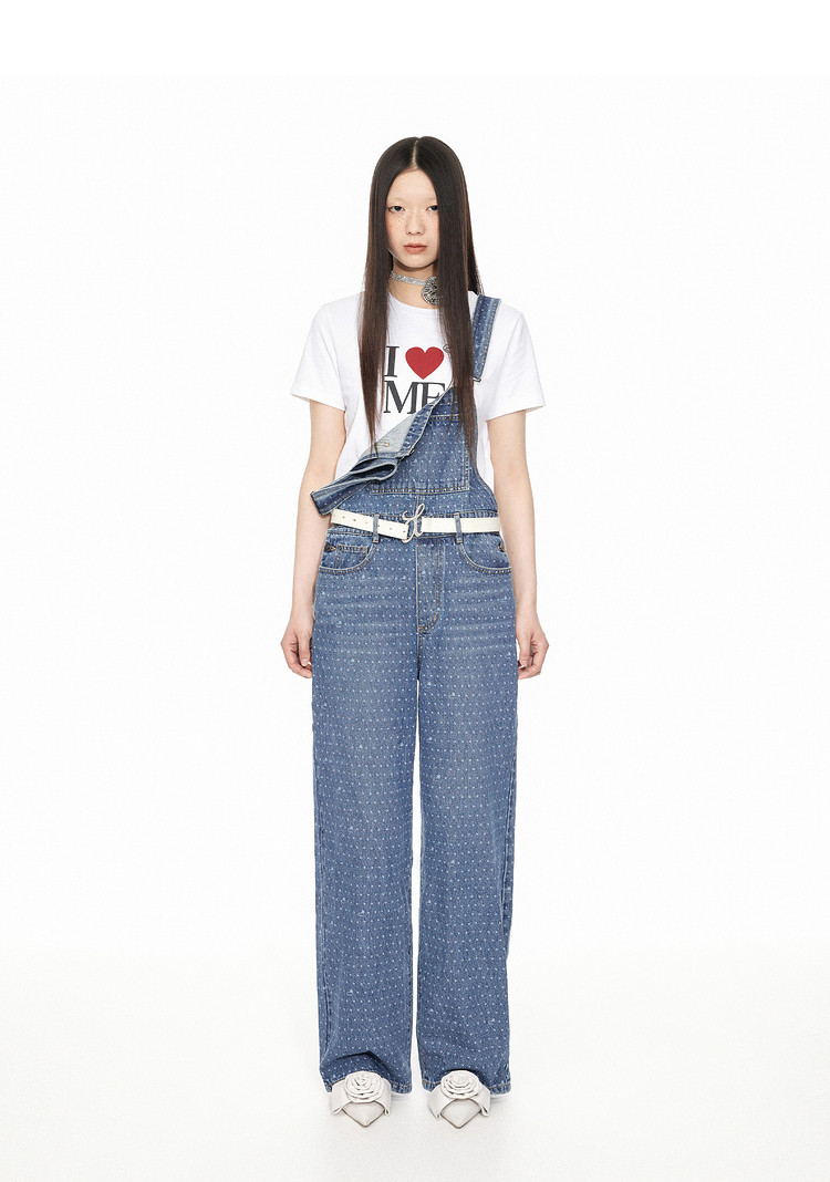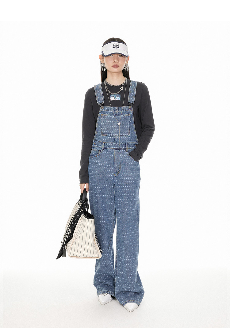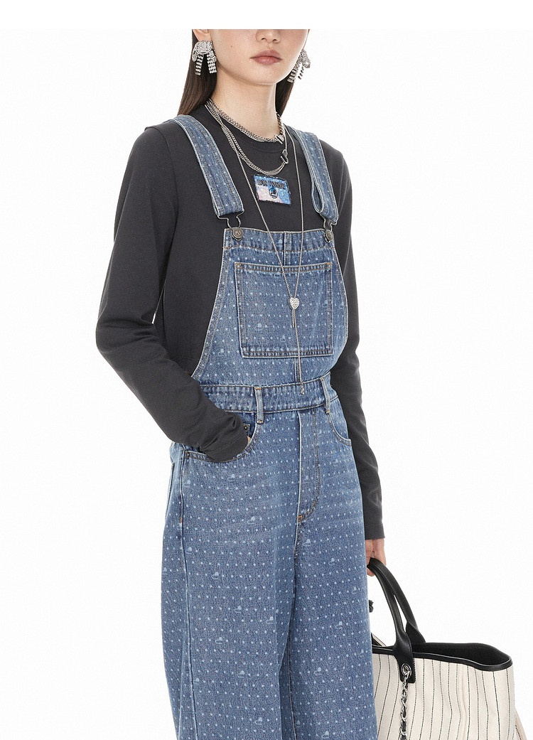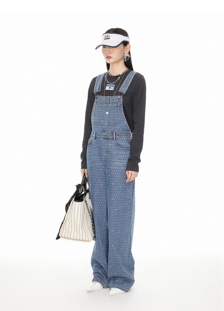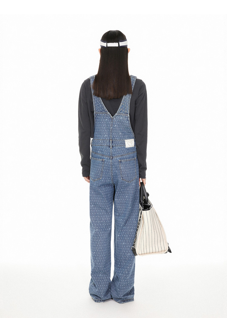 地素牛仔背带裤春秋波点满印宽松拖地长裤女 679307