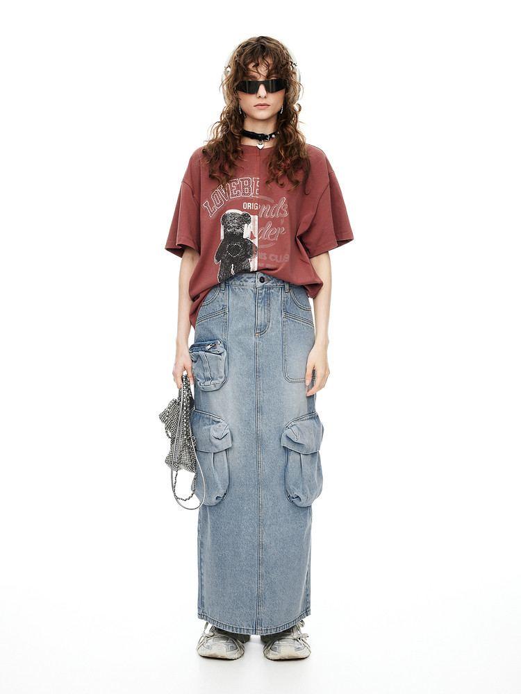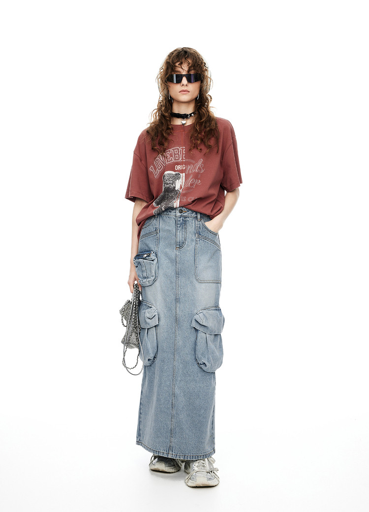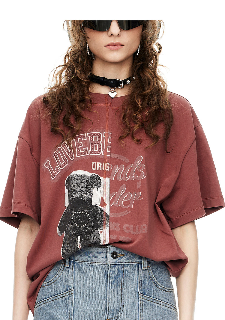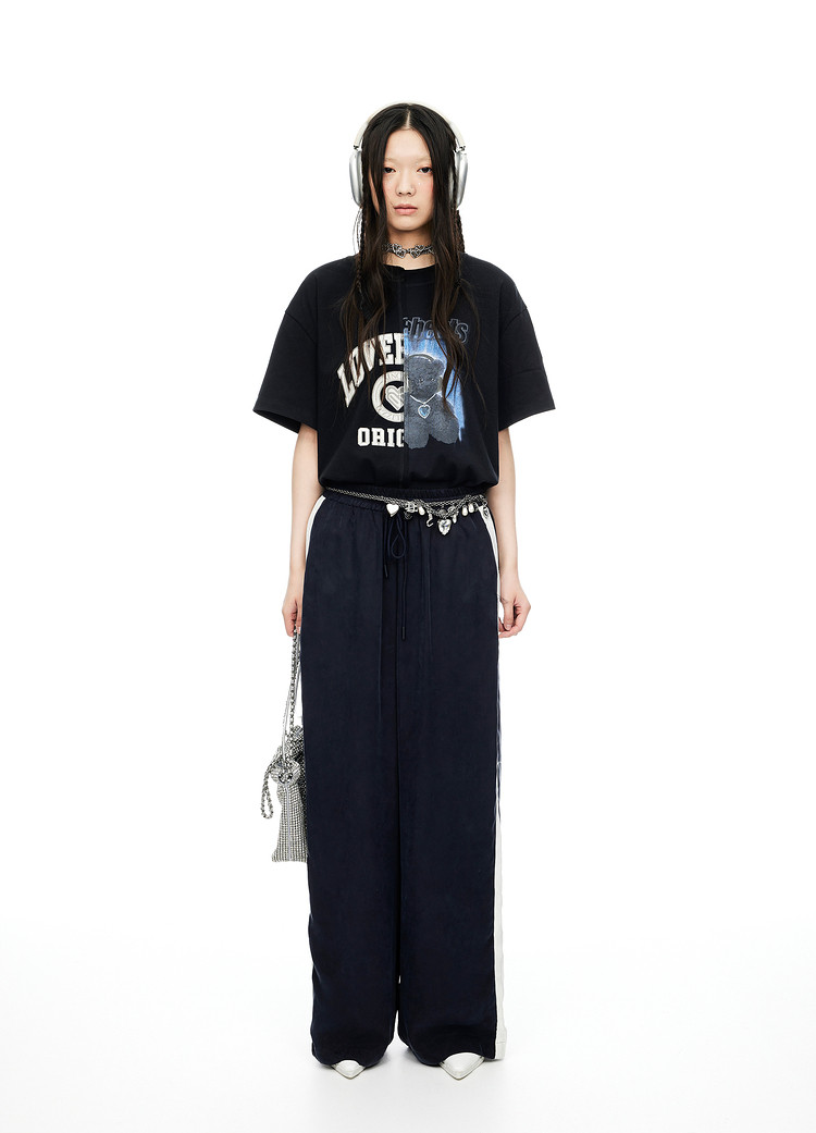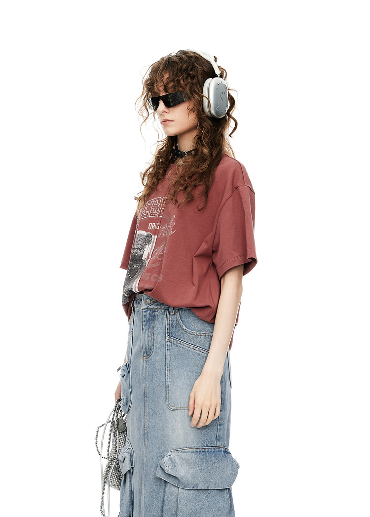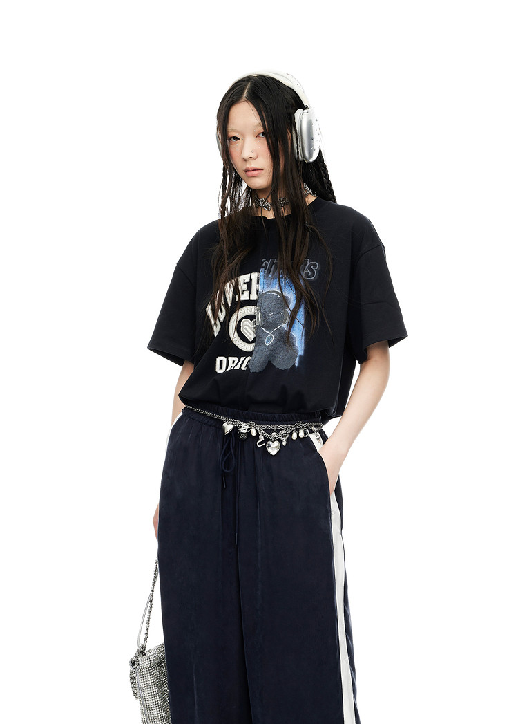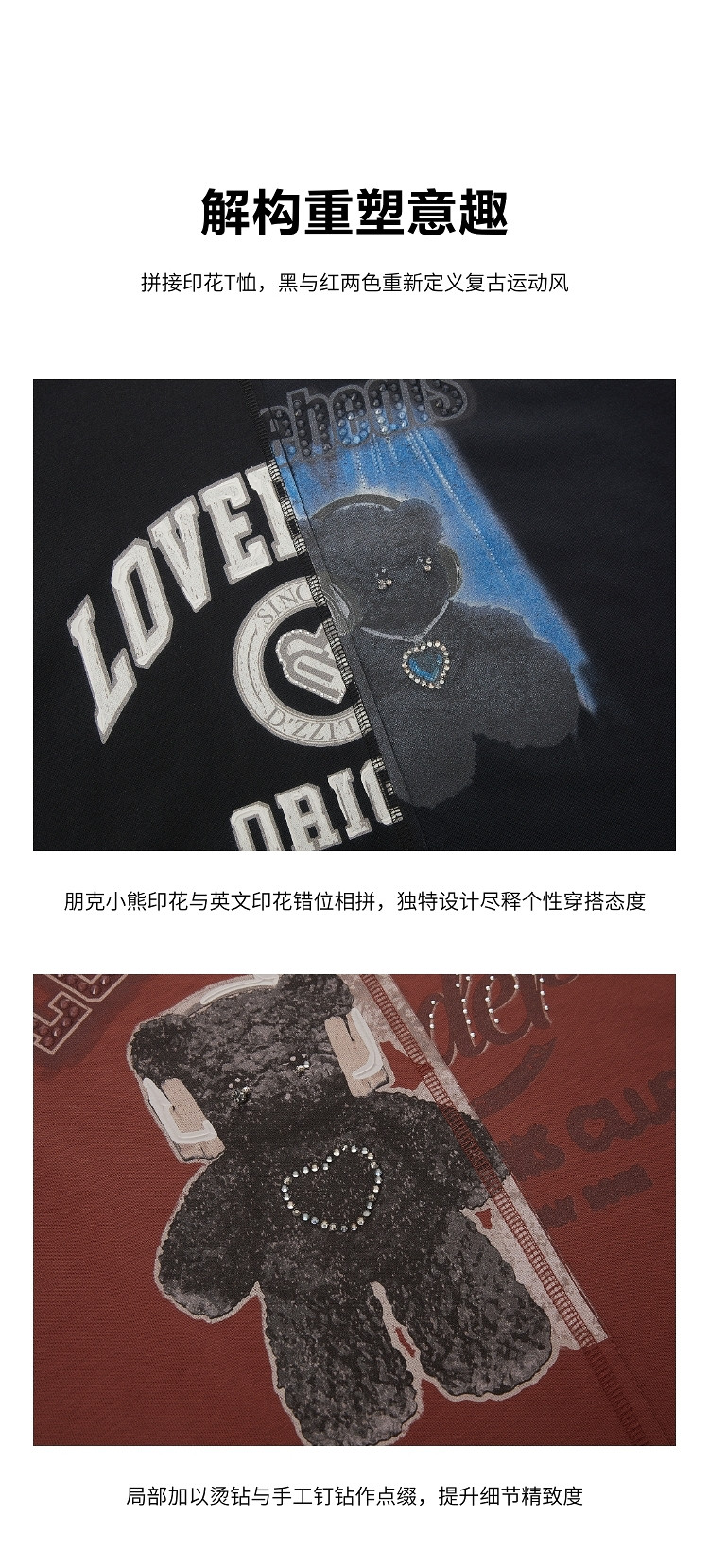 地素拼接t恤夏季复古运动风印花半袖上衣女 885643