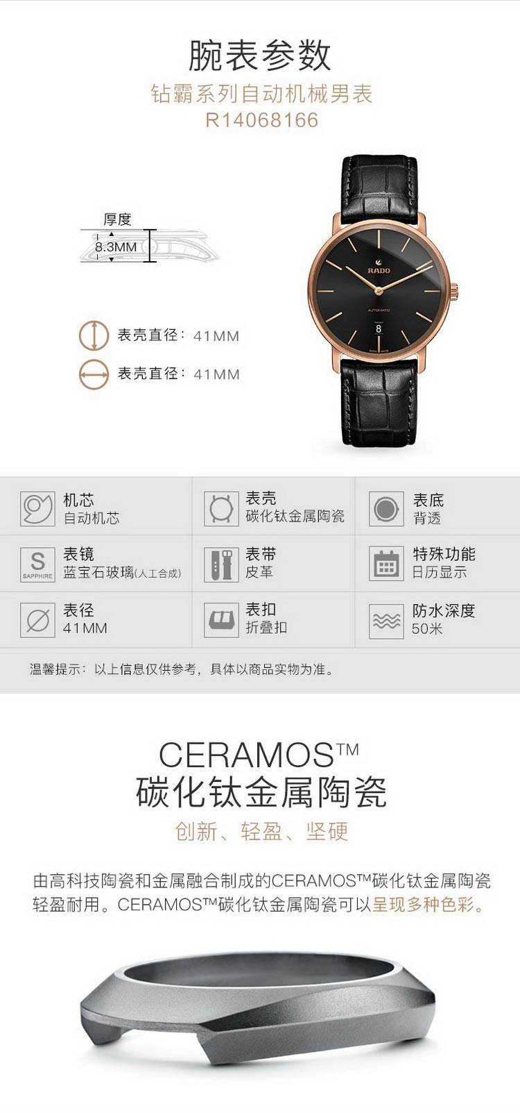 商品名称:雷达RADO 钻霸系列男士皮制表带金属陶瓷表壳机械手表R14068166