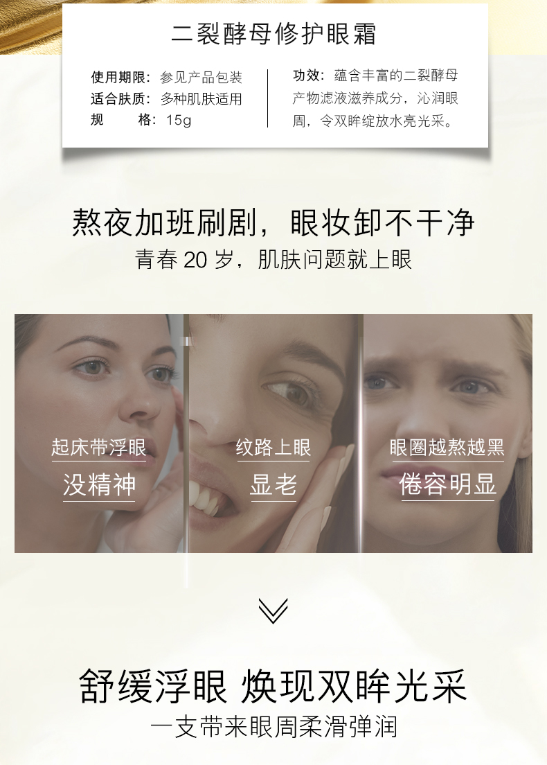 商品名称:欧佩 二裂酵母修护眼霜 15g 保湿滋润提拉细纹黯沉细腻轻盈脂肪粒紧致