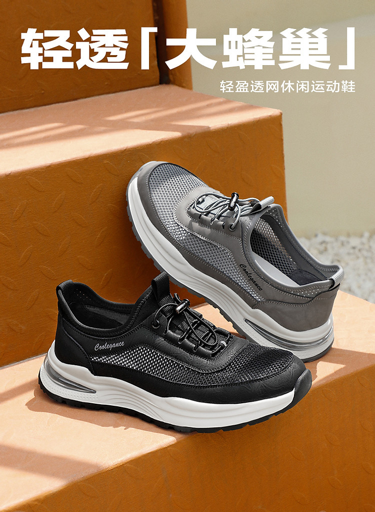 百丽男鞋网面透气套脚夏季休闲鞋厚底健步鞋爸爸运动鞋 058010