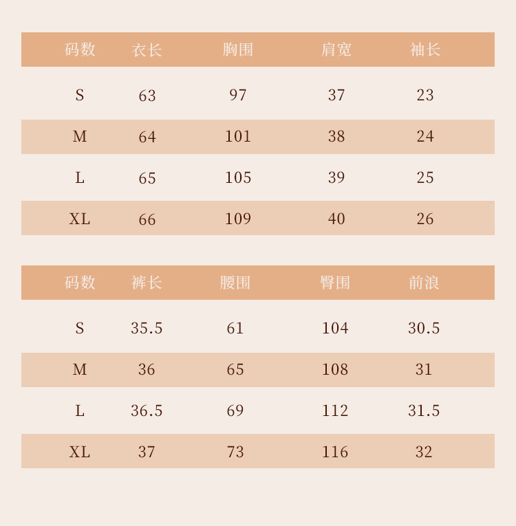 | 尺码 | 肩宽(cm) | 袖长(cm) | 上装号型 | 下装号型 | 衣长(cm) | 身高(cm) | 腰围(cm) | 裤长(cm) | 体重(kg) | 臀围(cm) | 胸围(cm) | 号型 |